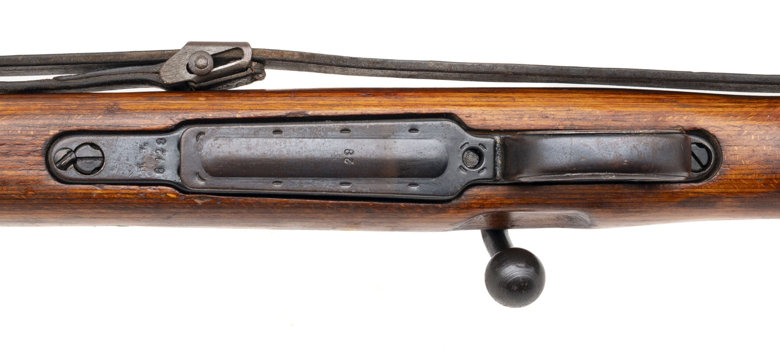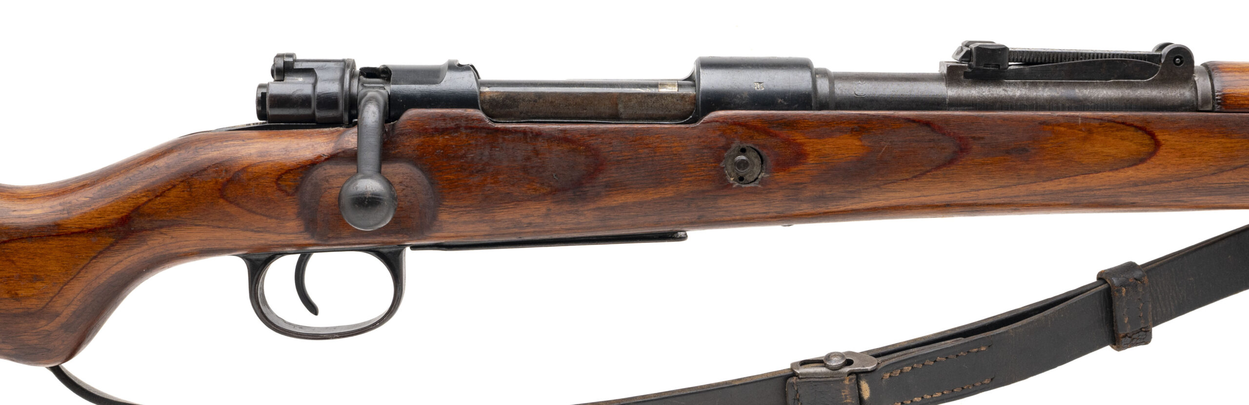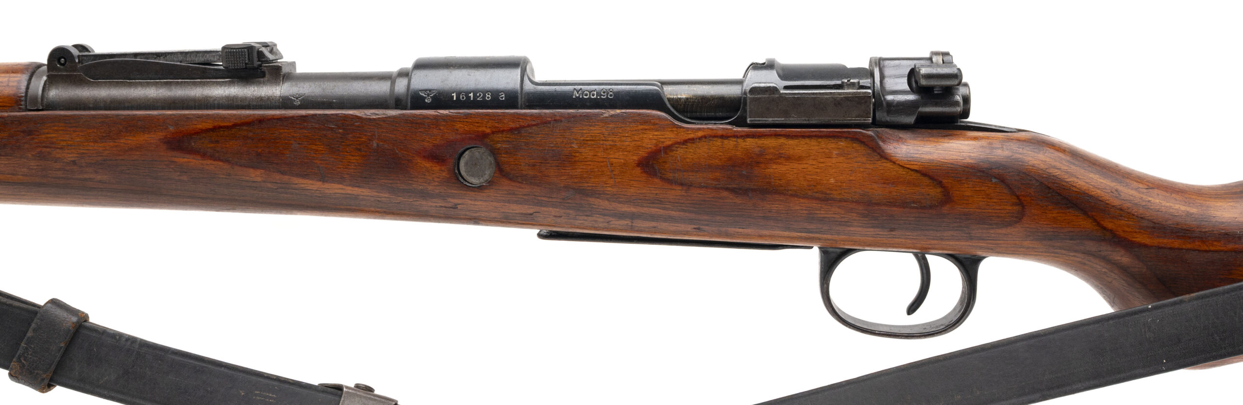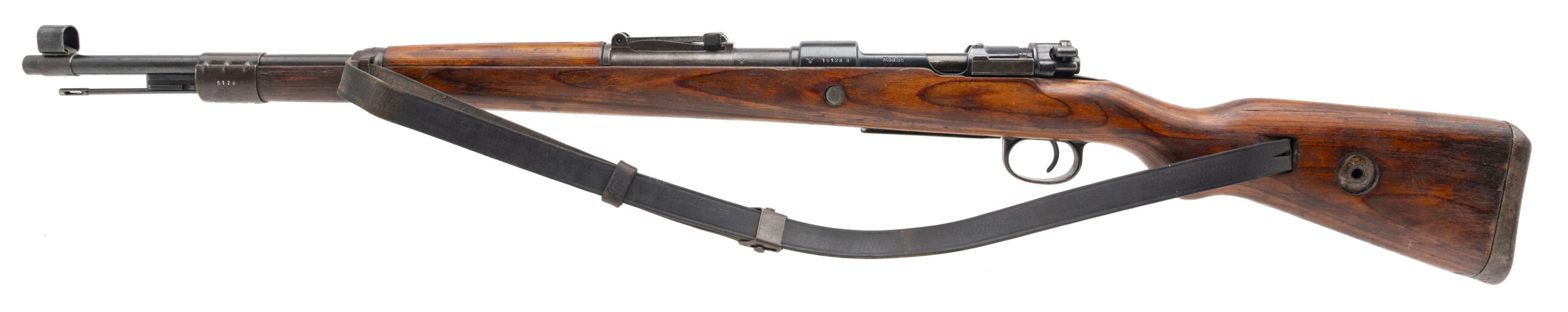 Serial Number 16128a. Made at the Mauser Werke factory in Oberndorf am Neckar, Germany in 1944 with a 23.62-inch round barrel that has strong visible rifling. This all-matching Kar98k has no import marks, so it is likely a veteran bring back from World War II. Overall condition is very good with a some light surface oxidation on the metallic parts & minor handling wear on the wood. Comes with a front sight hood, an original World War II leather sling & a 12.5-inch cleaning rod.