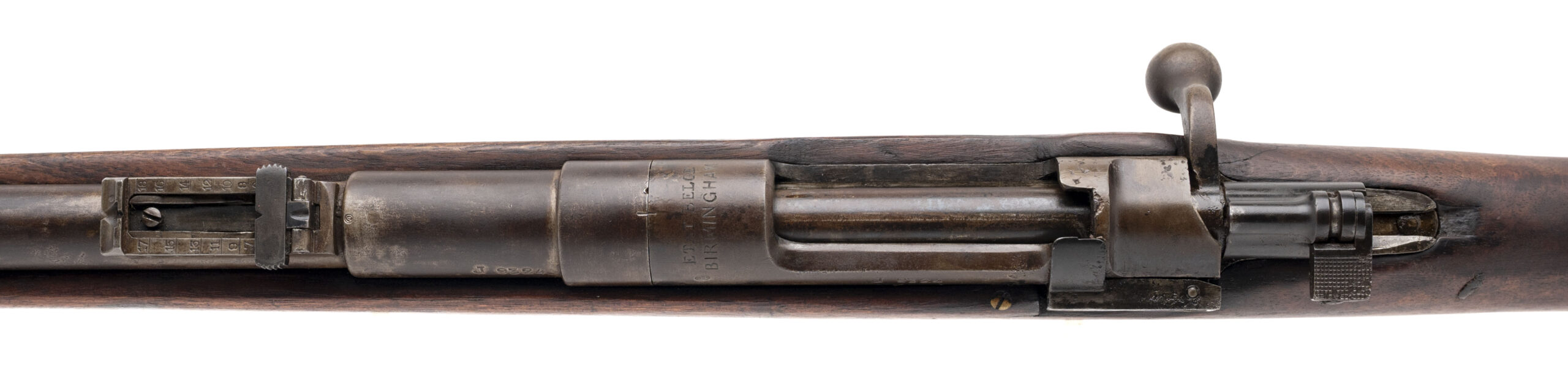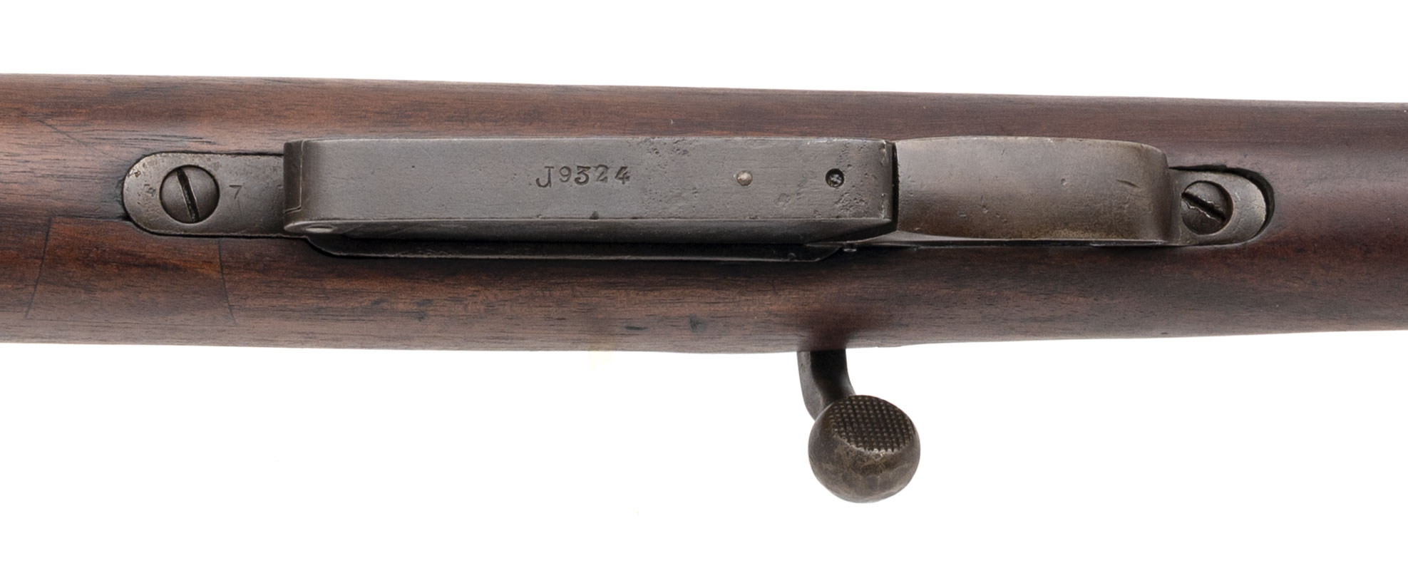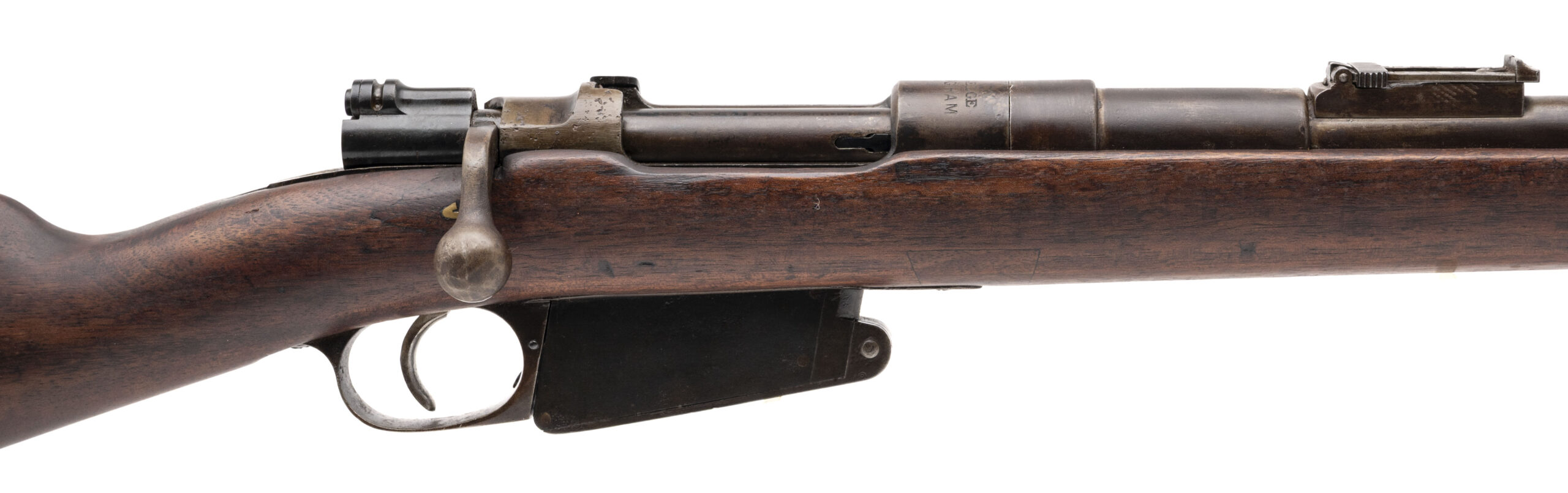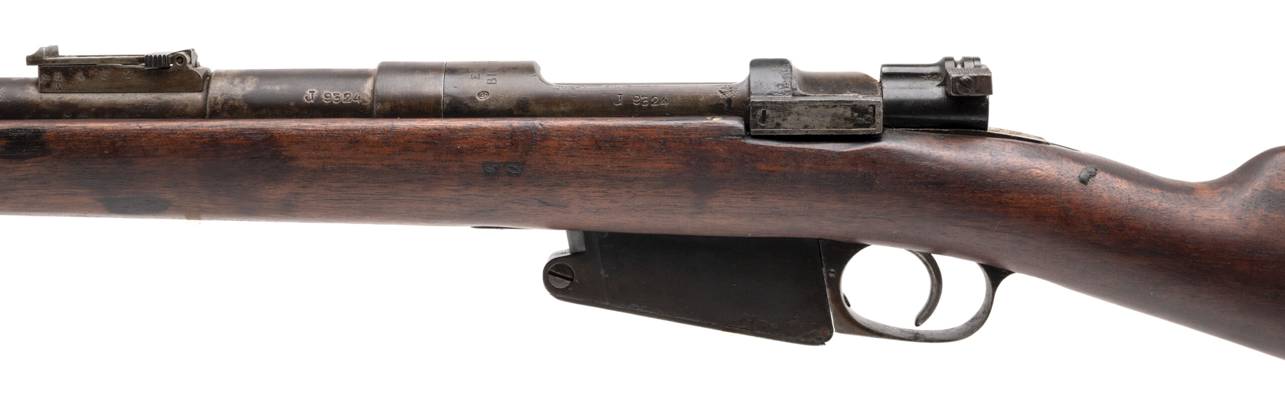 Serial No. J9324, manufactured circa 1916, 7.65x53mm, 22” round barrel. Often referred to as “the rifle that saved Paris,” the Belgian Model 1889 Mauser played a vital role in the defense of Belgium during the German invasion of 1914. This example was produced at the height of the Great War, bearing a faint stock cartouche. Bolt is non-matching, and metal surfaces have turned to a smooth brown patina. Bore shows strong rifling, and the stock remains very good with light handling impressions noted. Action is smooth and functions correctly. A historically significant example of the Belgian 1889/16 Mauser, a rifle that stood at the forefront of Belgium’s resistance during World War I.