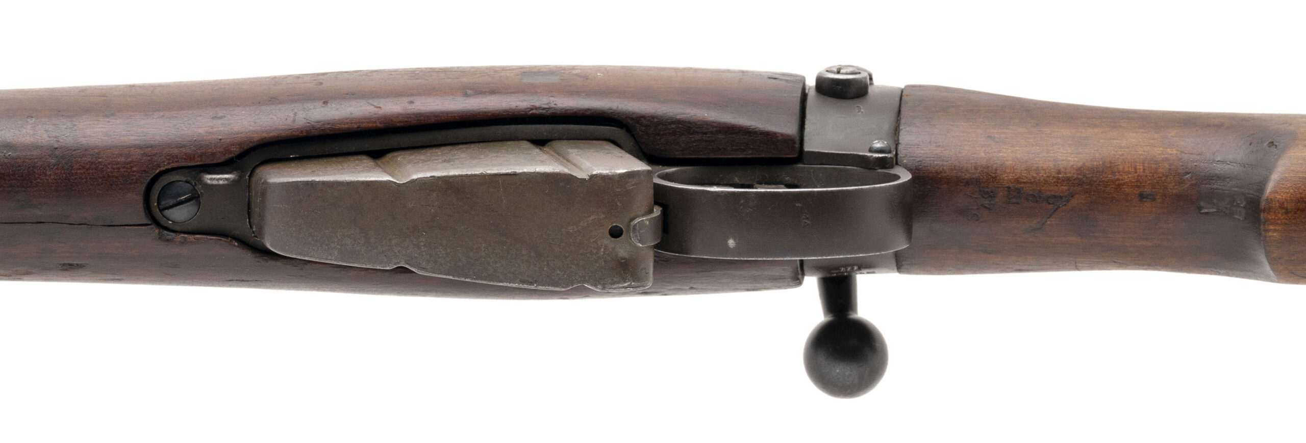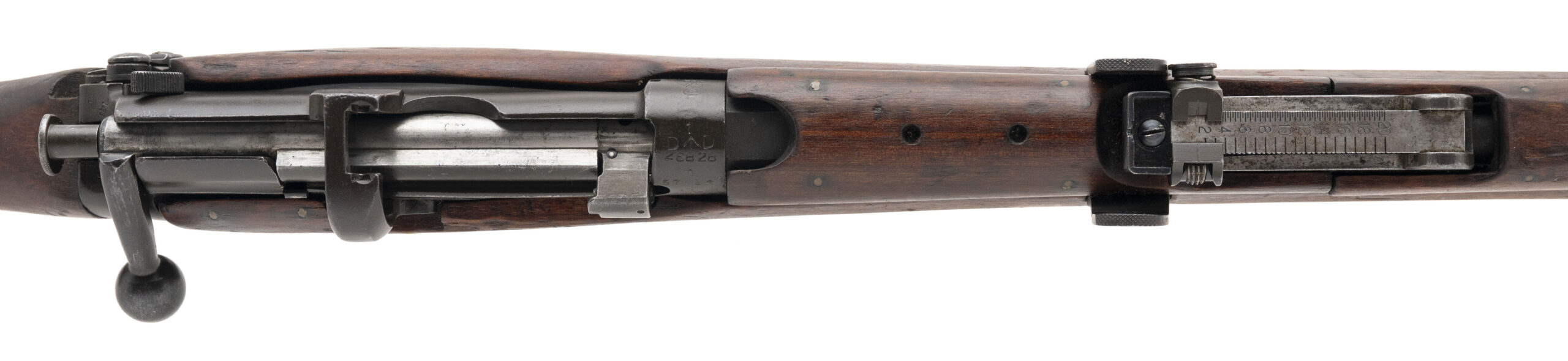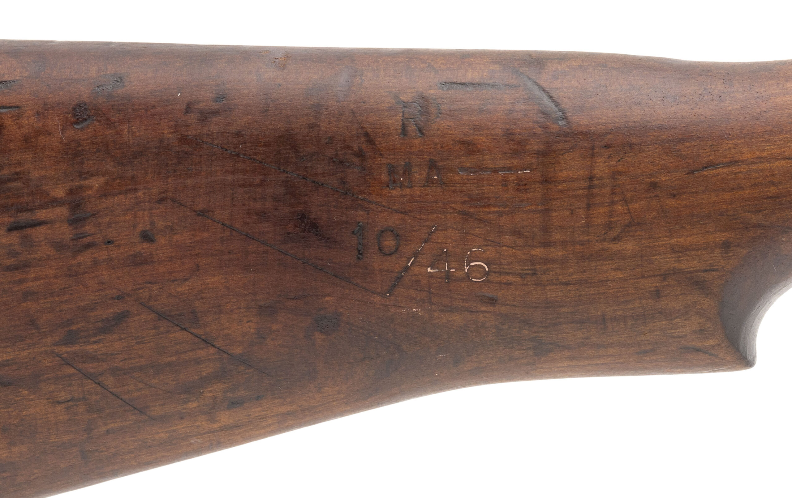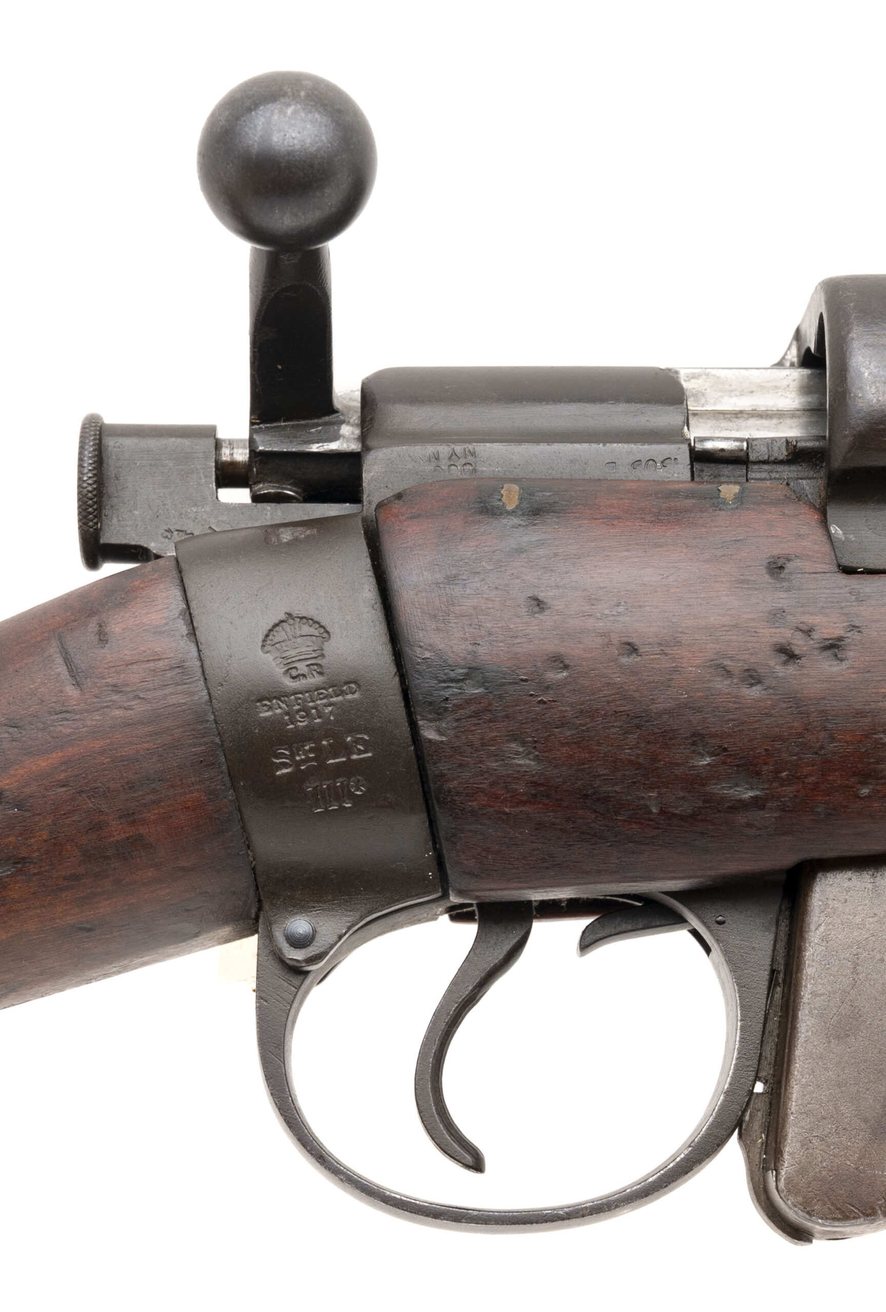 Serial No. 26828, made in 1917, .303 British, 25” round barrel. Bore is dark with oxidation noted throughout, rifling remains visible. Serial numbers are non-matching, upper is marked “D-ARROW-D”. This is the Defense Department mark for Australia. Socket is marked “Crown/GR/ENFIELD/1917/SHT LE/III*” Stock has light handling marks visible. Action is smooth and functions correctly.