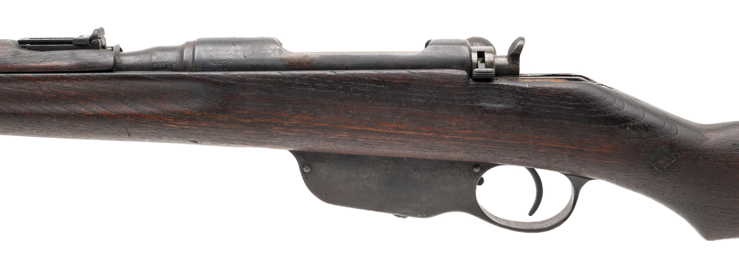 Serial No. 4357f, manufactured circa 1930s, 8x56R, 20" round barrel. Carbine exhibits an honest service-used appearance, with metal and wood showing a uniform dull patina. Bore shows frosting and light oxidation, though rifling remains strong. Stock is numbered to the rifle, while the bolt is unmarked—typical of arsenal reissue practices. Action is smooth and functions correctly. A solid example of the classic Austro-Hungarian straight-pull carbine.