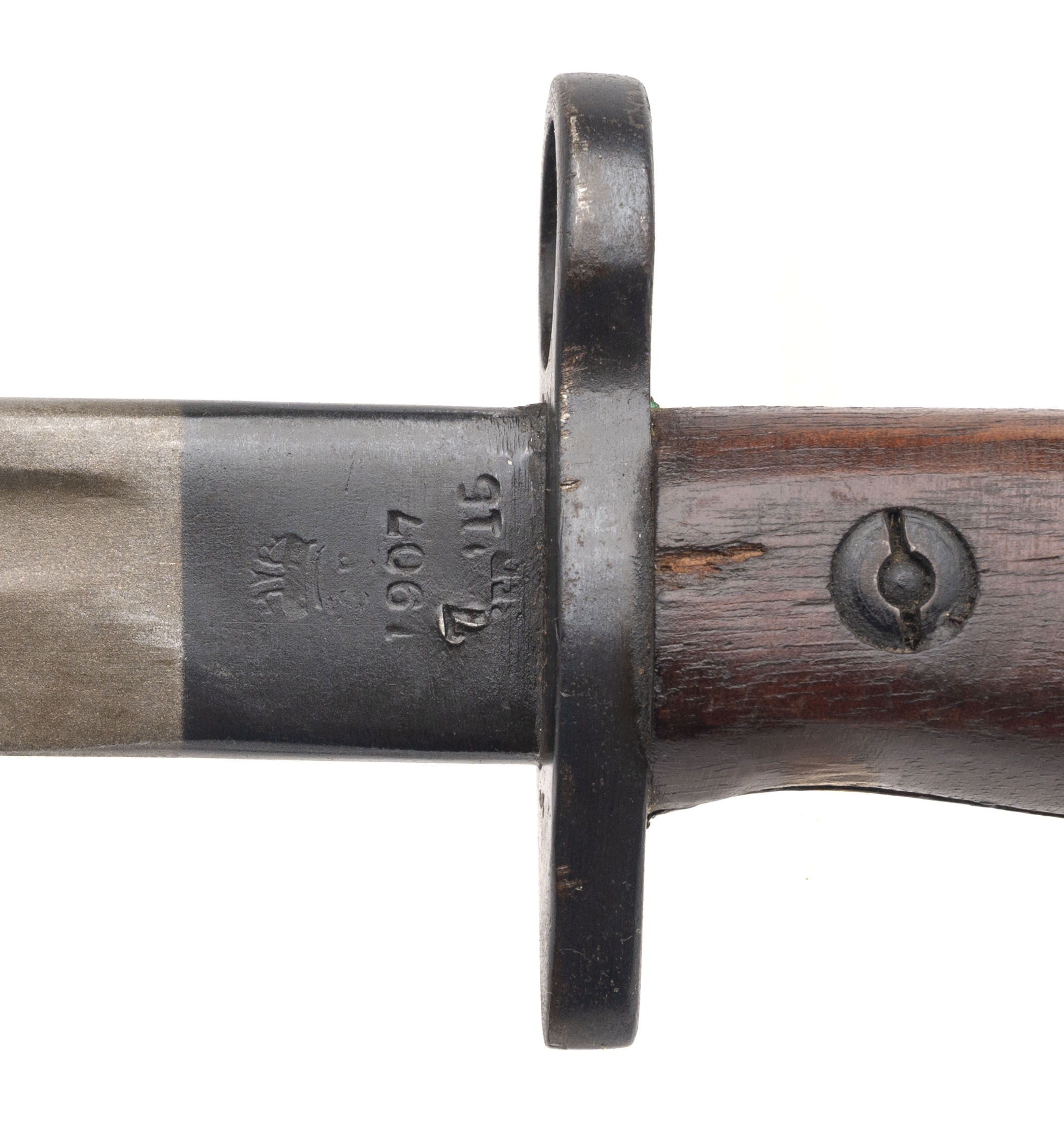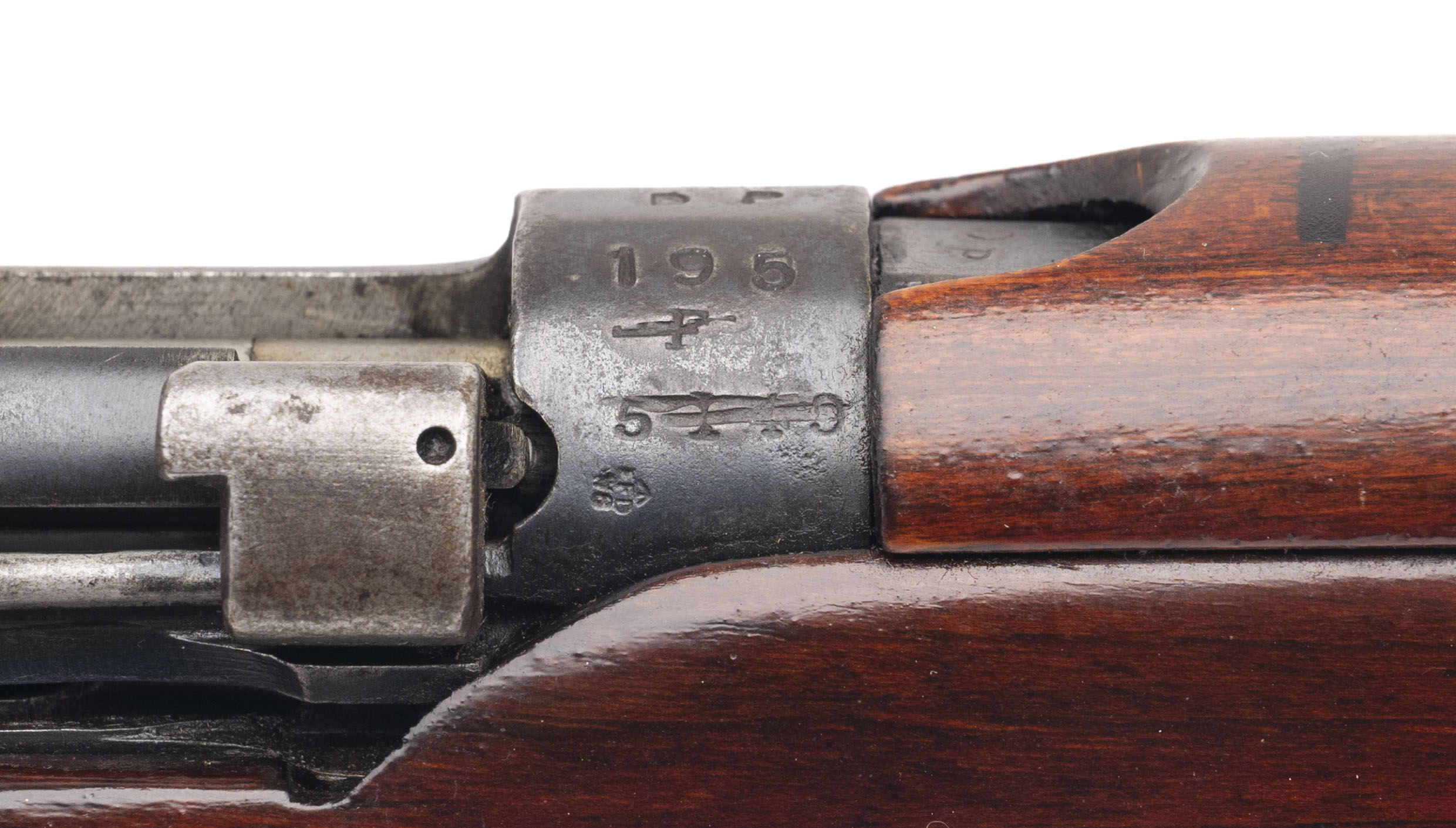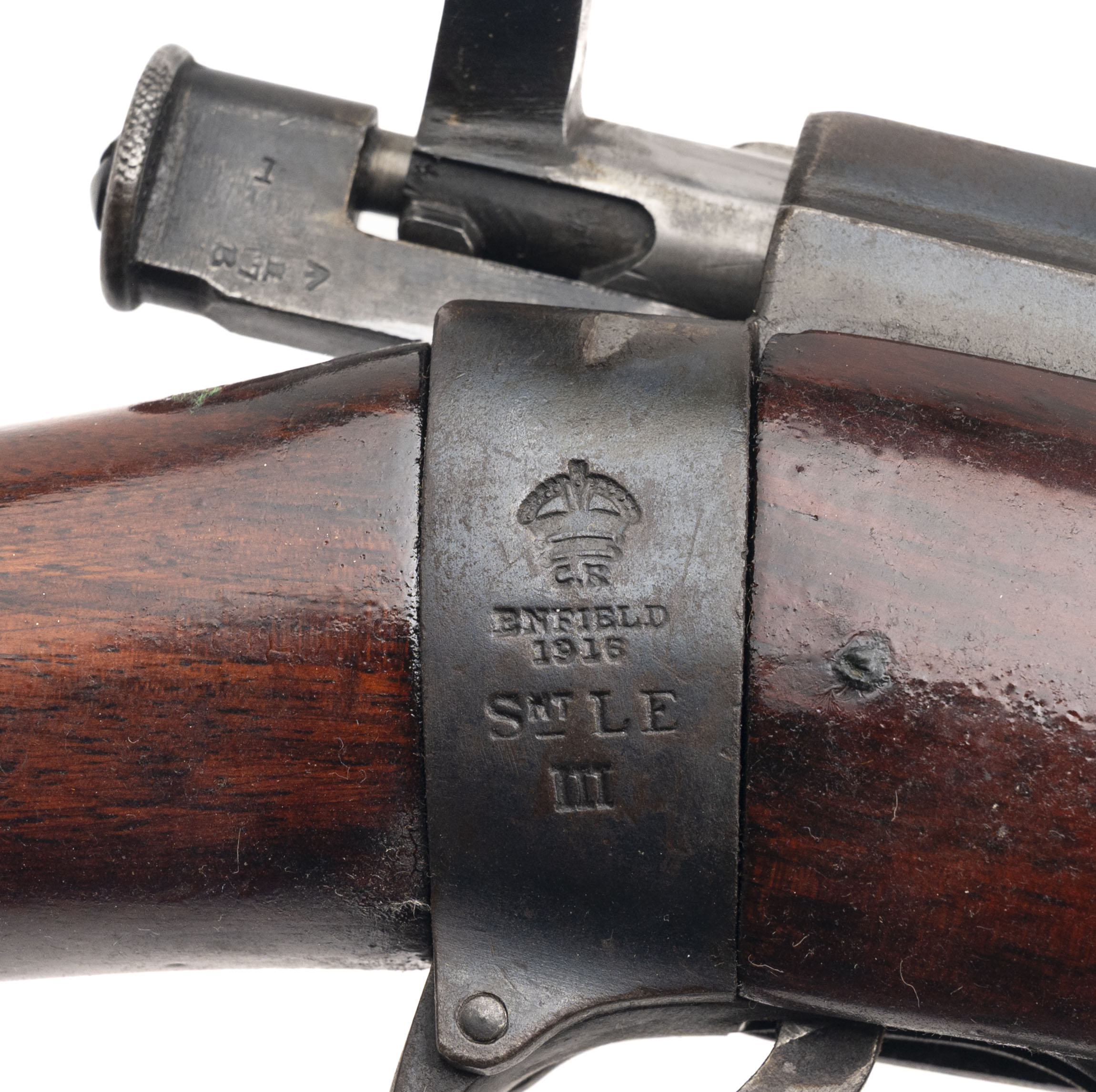 Serial No. 195, manufactured in 1916, chambered in .303 British with a 25" round barrel. Serial numbers are matching, and the magazine is unmarked. The receiver bears a “DP” (Drill Purpose) marking; however, the rifle’s headspace has been inspected and it remains fully functional. The stock has been lightly refurbished, and a portion just behind the barrel band has been thinned—likely to improve grip during manual of arms. Overall condition is solid and serviceable, showing honest wear consistent with wartime use. Rifle is accompanied by a Pattern 1907 bayonet complete with leather scabbard. Action is smooth and functions correctly.