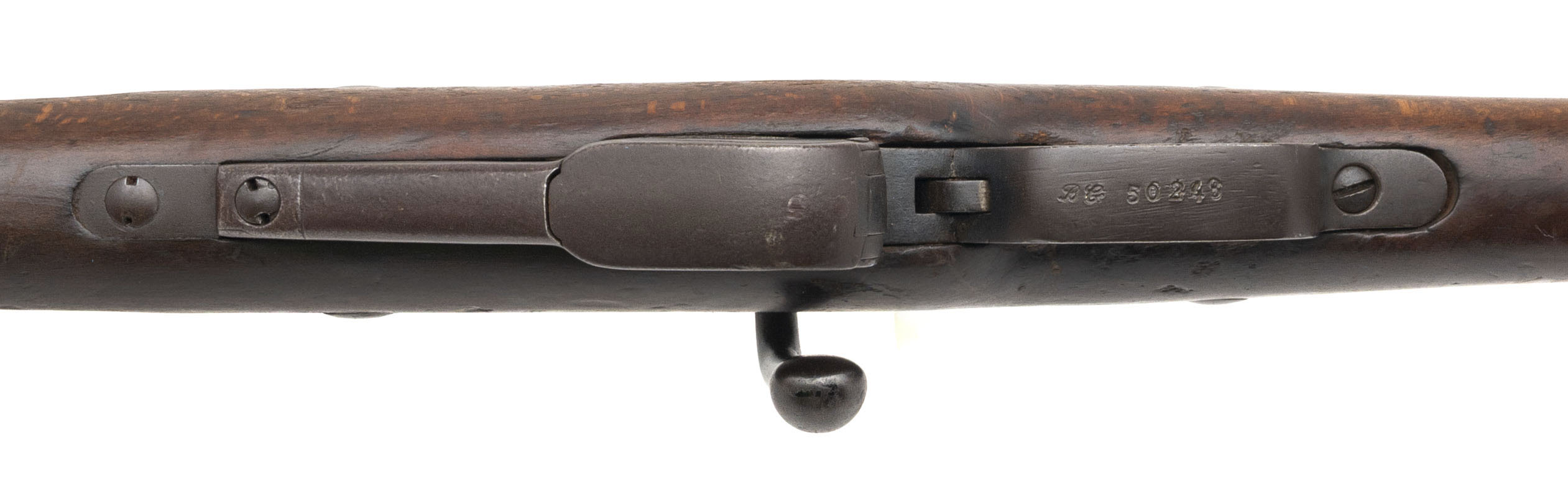 Serial No. L68422, manufactured circa 1916–1918 and later re-barreled in 1937, chambered in 8mm Lebel with an 18" round barrel. The bore is good, showing light frosting with strong rifling remaining. This carbine displays honest service wear to both metal and wood, consistent with extended military use through two periods of service. The stock shows expected handling marks along with cracks noted on the right side, typical of Berthier carbines that saw hard field use. Overall presentation remains sound and representative. Action is smooth and functions correctly.