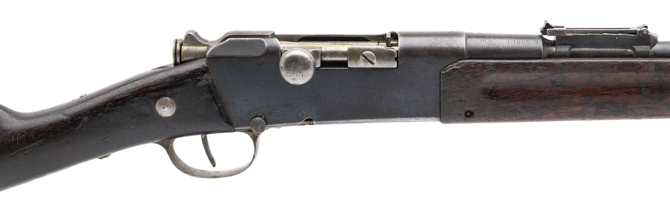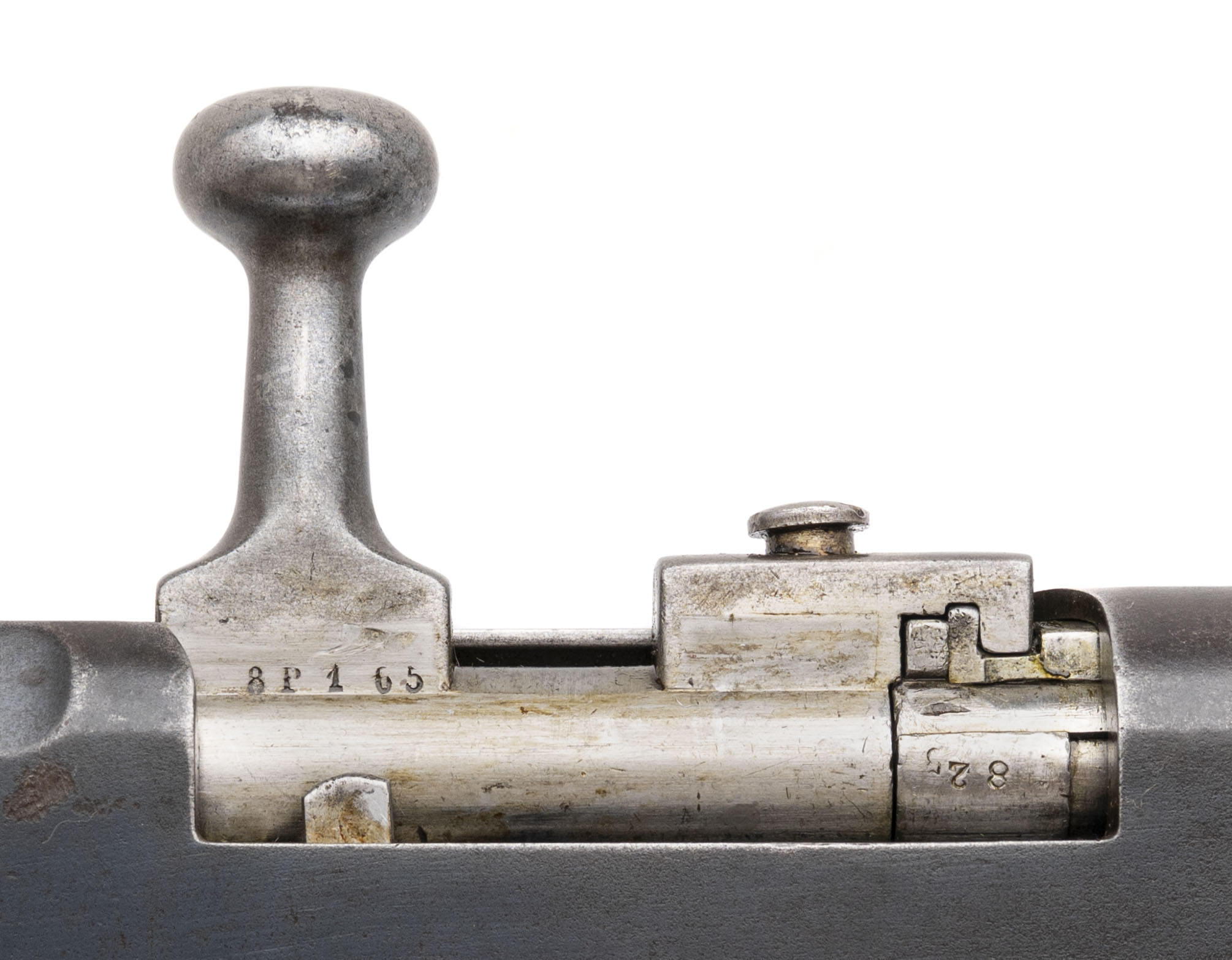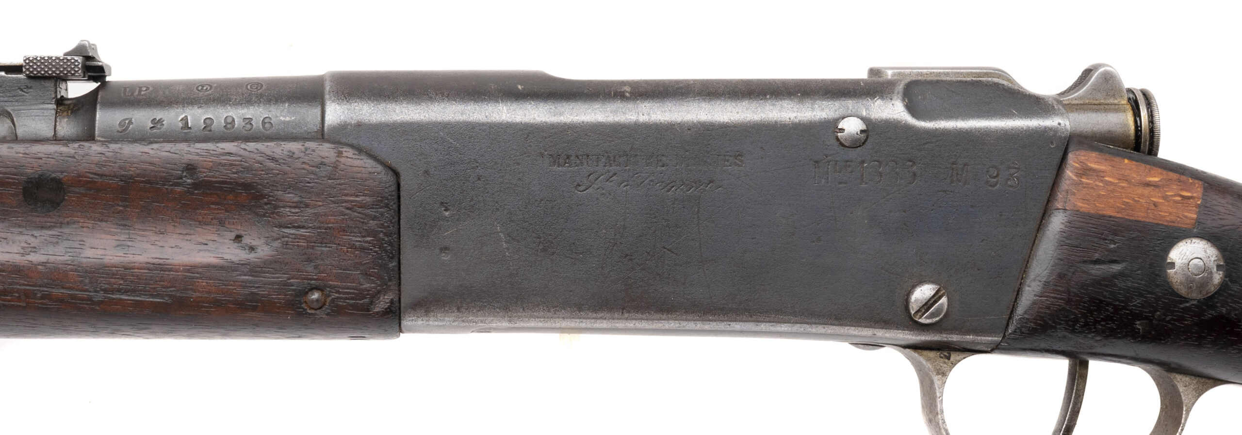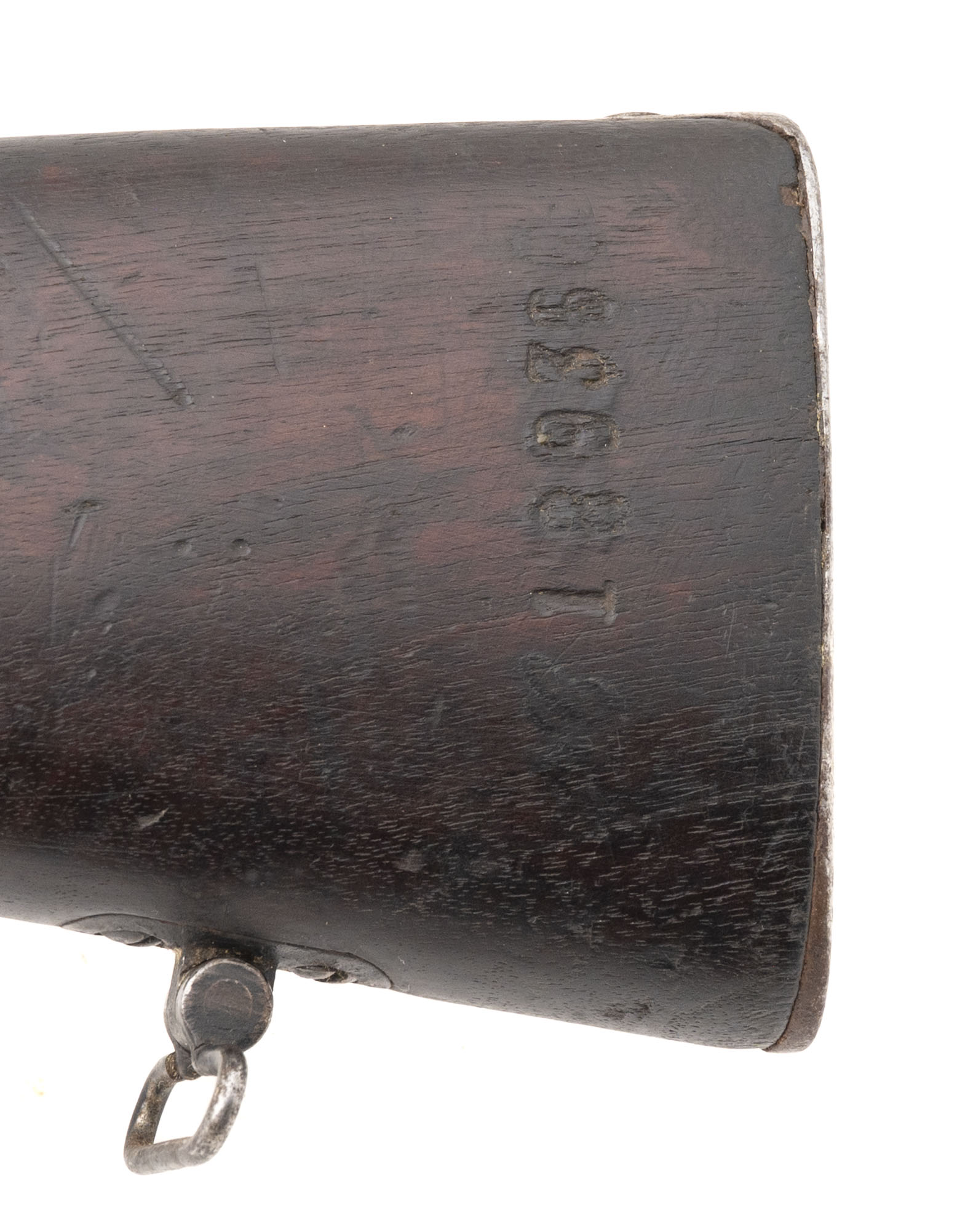 Serial No. L12936, manufactured circa 1905, chambered in 8mm Lebel, featuring a 31 ¾” round barrel. This classic Lebel rifle, the backbone of the French infantry during WWI, shows matching serial numbers throughout, with the exception of the fore-end stock. The barrel was arsenal replaced in 1925, a common modification during postwar refurbishment to extend service life. The metal surfaces exhibit a smooth dark grey patina, and the factory markings remain legible and well-preserved. The stock displays typical arsenal repairs and expected field wear, with scattered handling marks consistent with age and service. The action is smooth and functions correctly. A solid representative of a WWI French rifle!