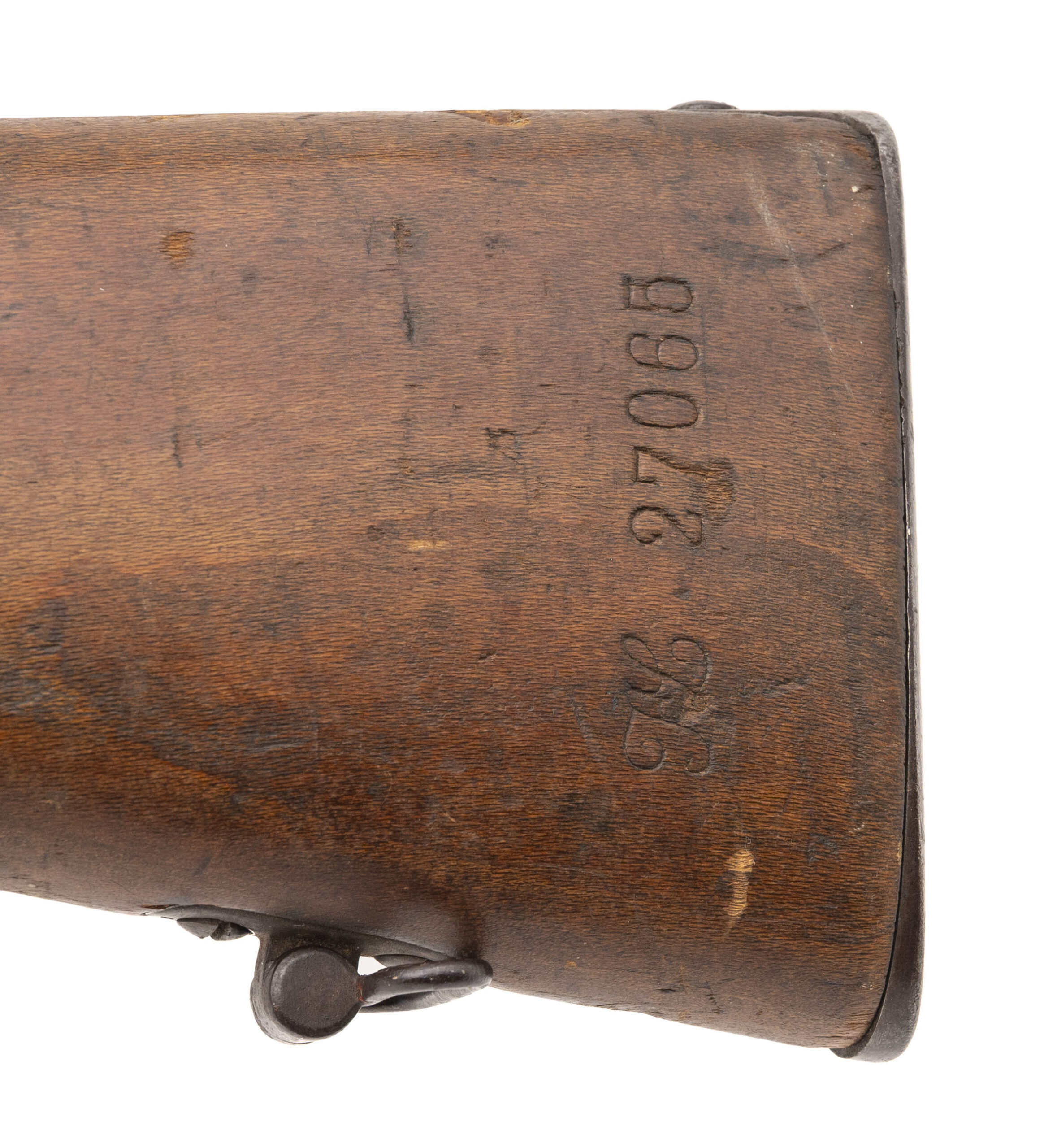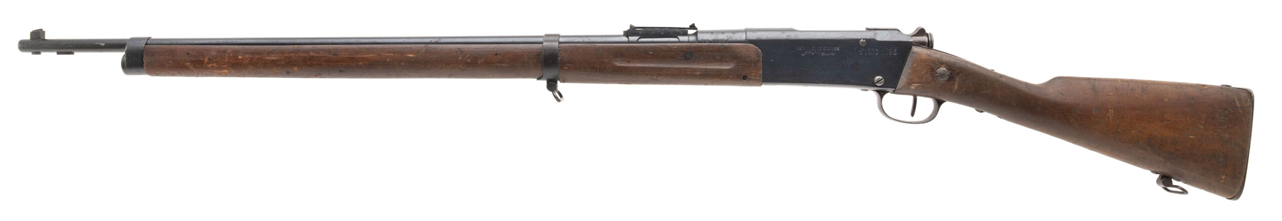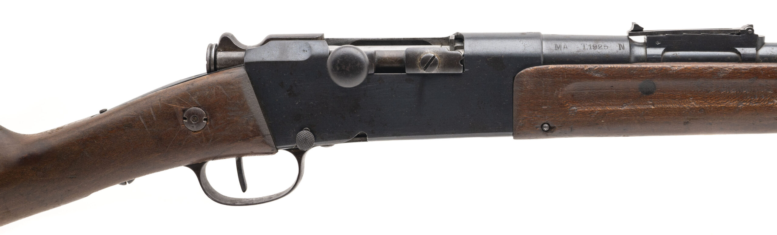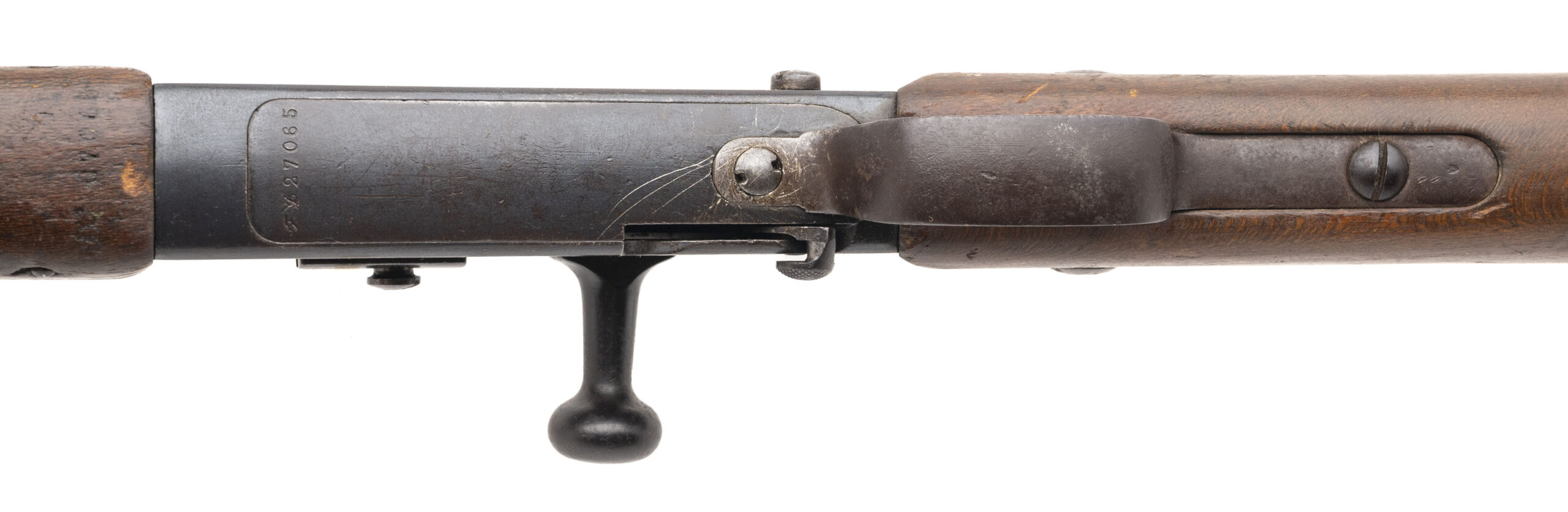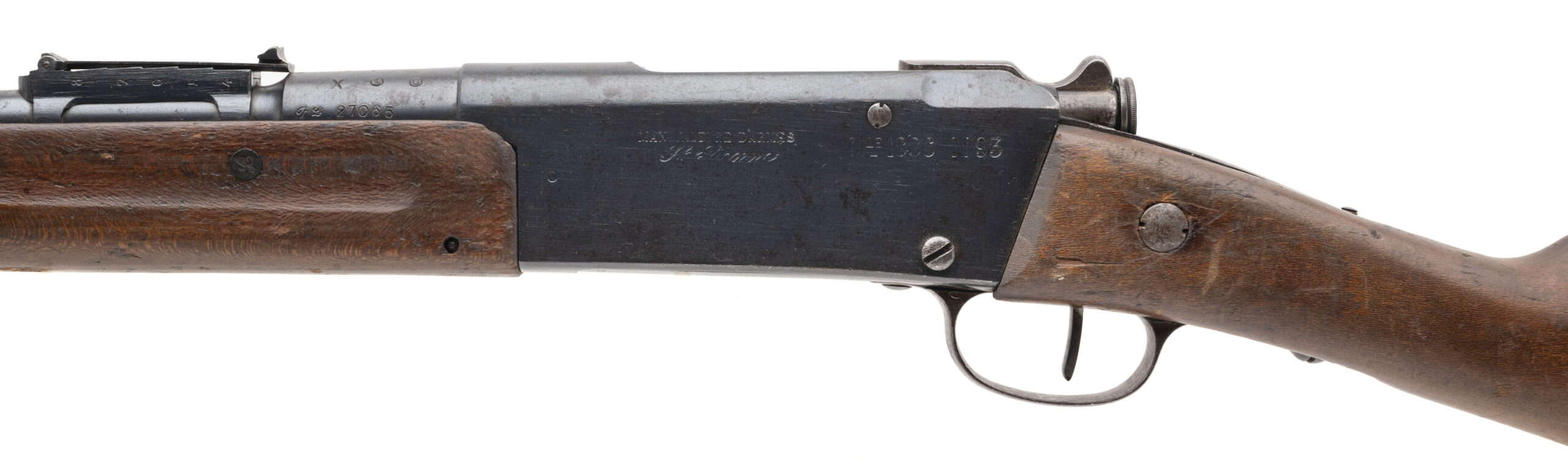 Serial No. FL27065, manufactured in 1916 at Manufacture d’Armes de Saint-Étienne, chambered in 8mm Lebel with a 32" round barrel. The bore is good with strong, well-defined rifling. Serial numbers are matching throughout, a desirable feature on Lebel rifles. Metal surfaces have thinned to an even grey patina, and the stock shows expected handling and service wear consistent with wartime use. This rifle was refurbished in 1925, reflecting continued French military service between the wars. Overall presentation is honest and well preserved for a WWI-era Lebel. Action is smooth and functions correctly.