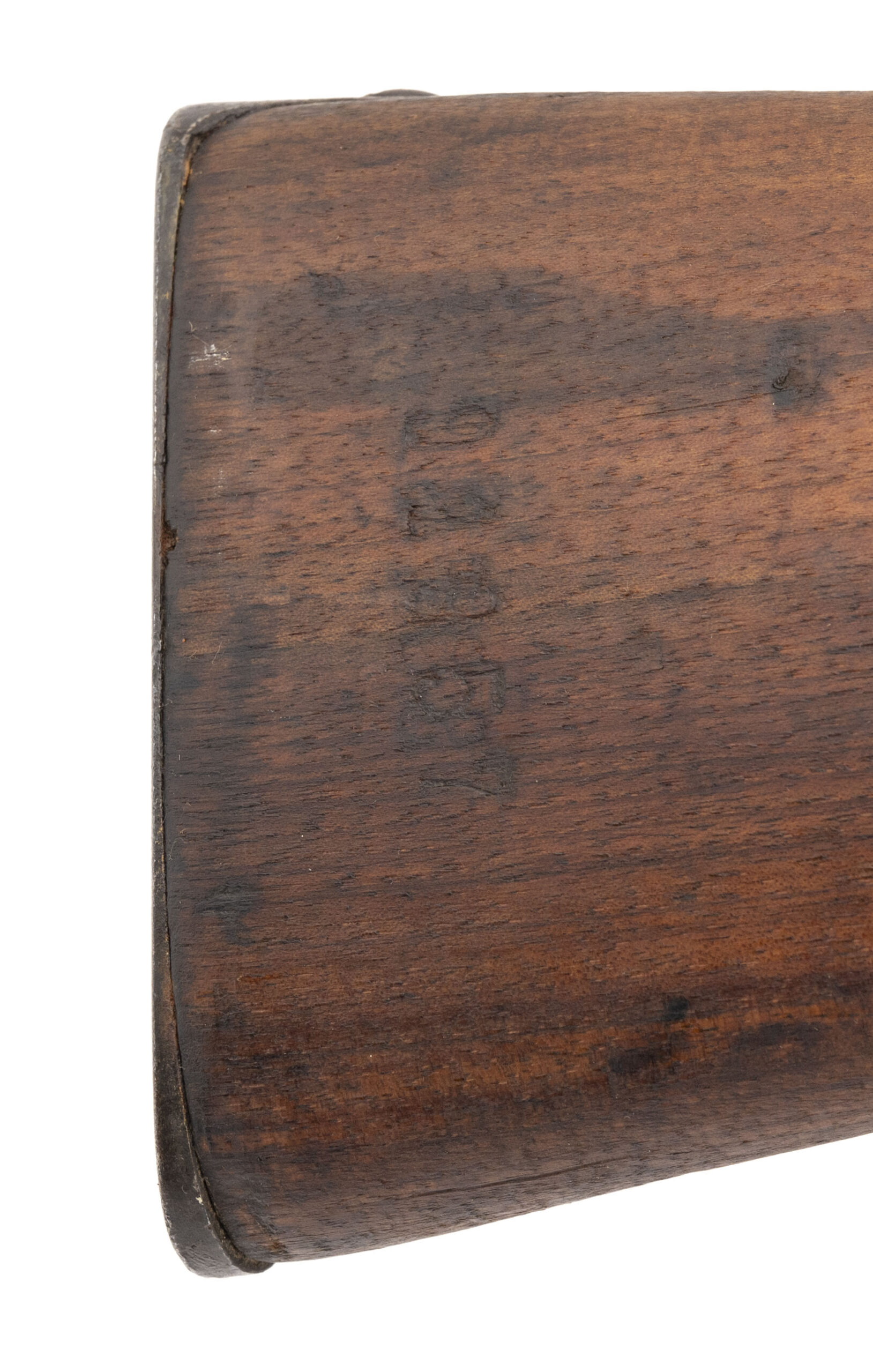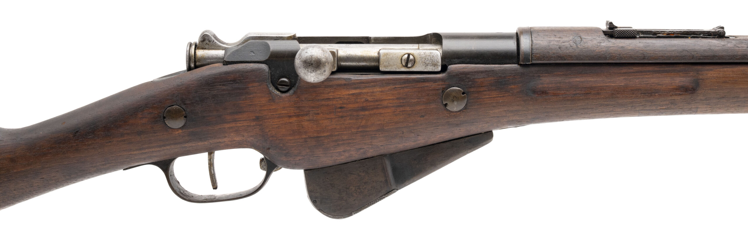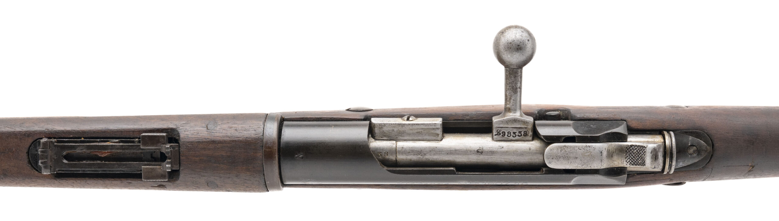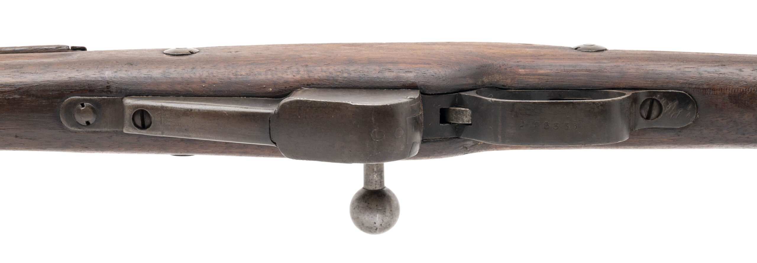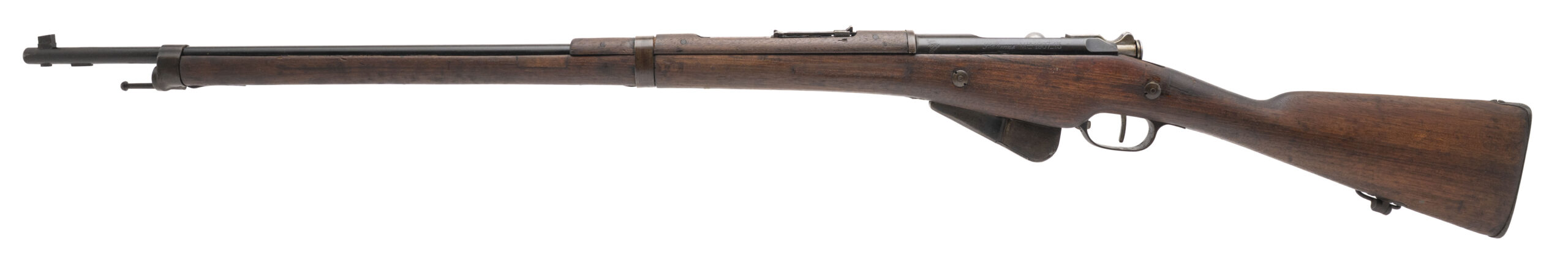 Serial No. L98338, manufactured circa 1918, 8mm Lebel, 32½” round barrel. Serial numbers are matching except for the stock. Blue finish has thinned to a dark grey/brown patina. Stock has been lightly sanded at one point, with two areas of arsenal repair noted. Action is smooth and functions correctly. A representative example of the Model 1907/15 Berthier rifle, the principal French service arm of the later First World War.