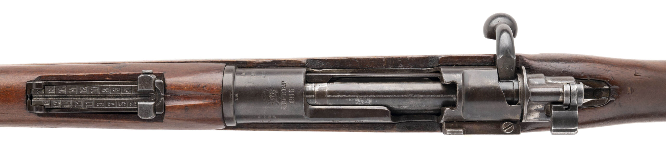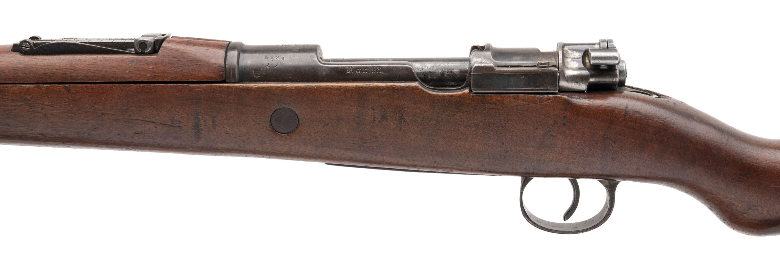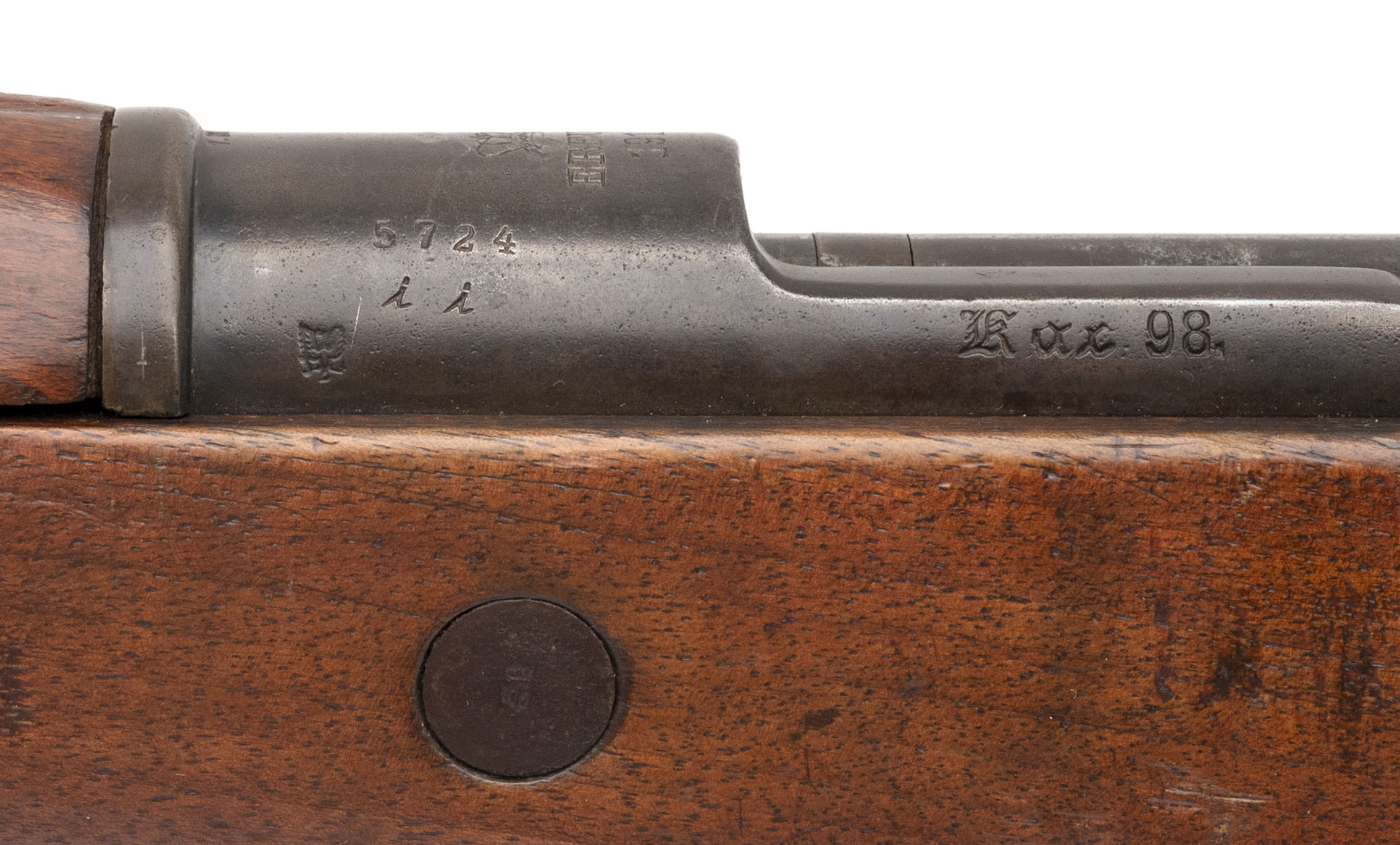 Serial No. 5724ii, manufactured in 1916 by the Royal Prussian Arsenal at Erfurt, chambered in 8mm Mauser with a 23.75-inch round barrel. Designed as a shorter and lighter alternative to the Gewehr 98 for cavalry, artillery, and stormtrooper units, the “aZ” designation stands for mit Aufpflanzvorrichtung und Seitengewehrzusatz—indicating a bayonet lug and stacking hook. All serial numbers are matching throughout, including the screws, reflecting excellent originality. The finish has thinned to a brown-grey patina with traces of original factory blue remaining in protected areas. The walnut stock shows light combat wear with scattered nicks and handling marks. The action cycles smoothly and functions correctly. Factory markings and Imperial acceptance proofs remain sharp and fully legible on the receiver and barrel shank.