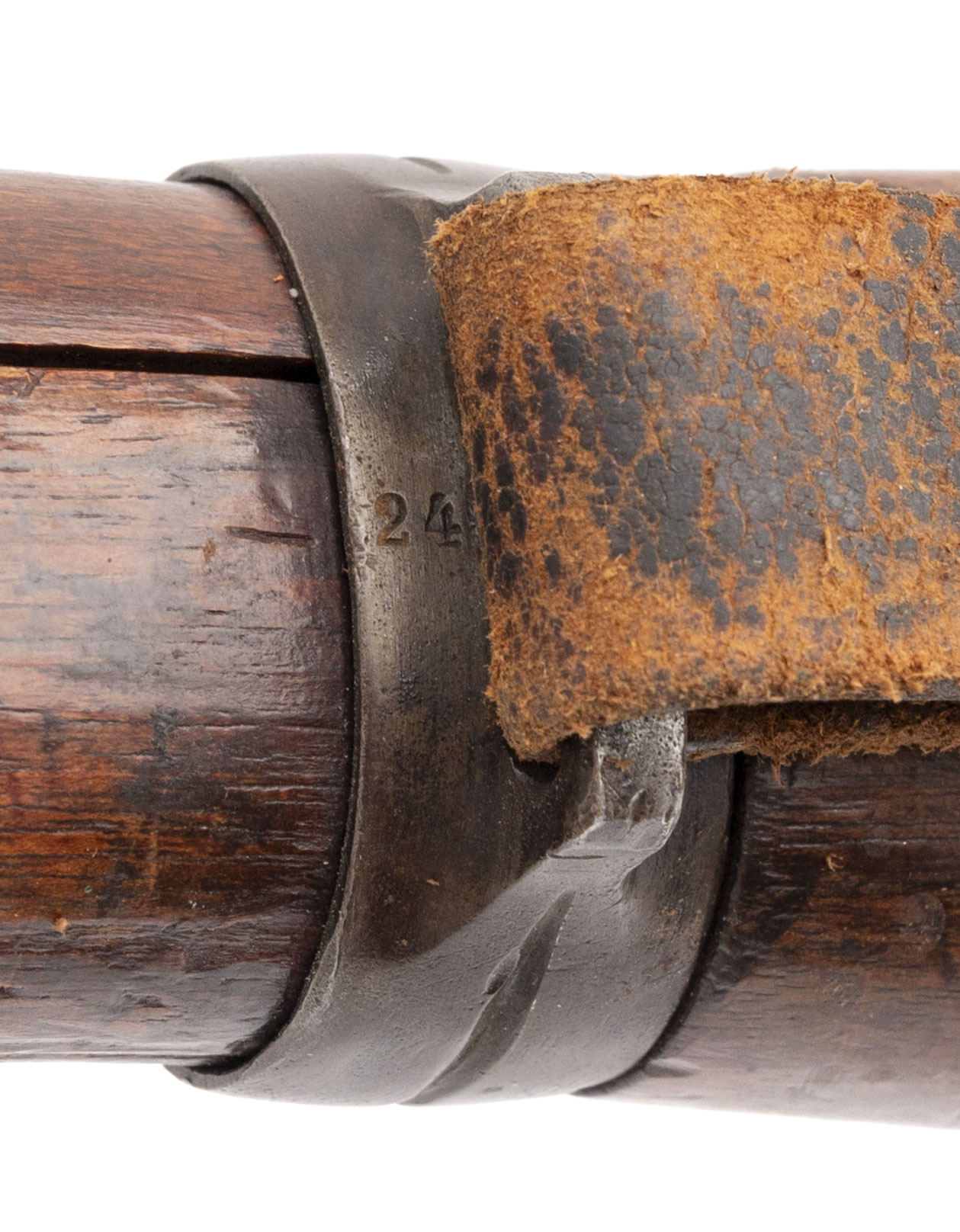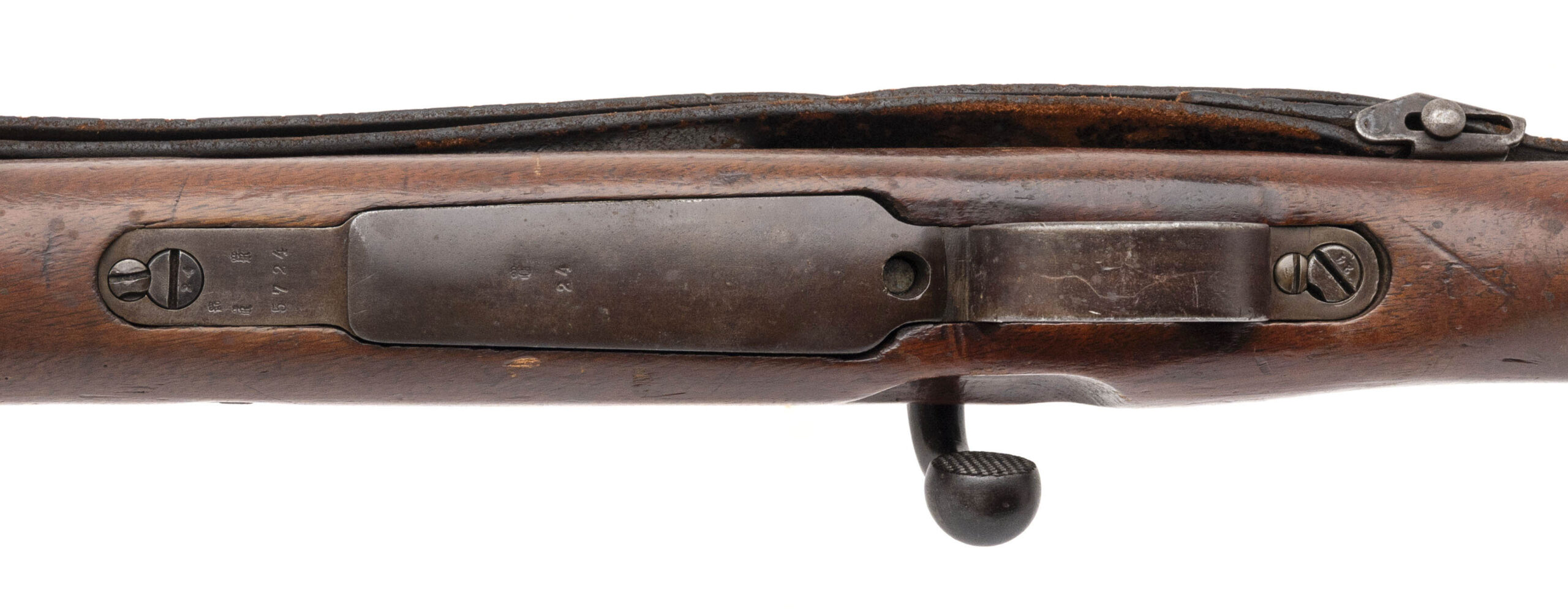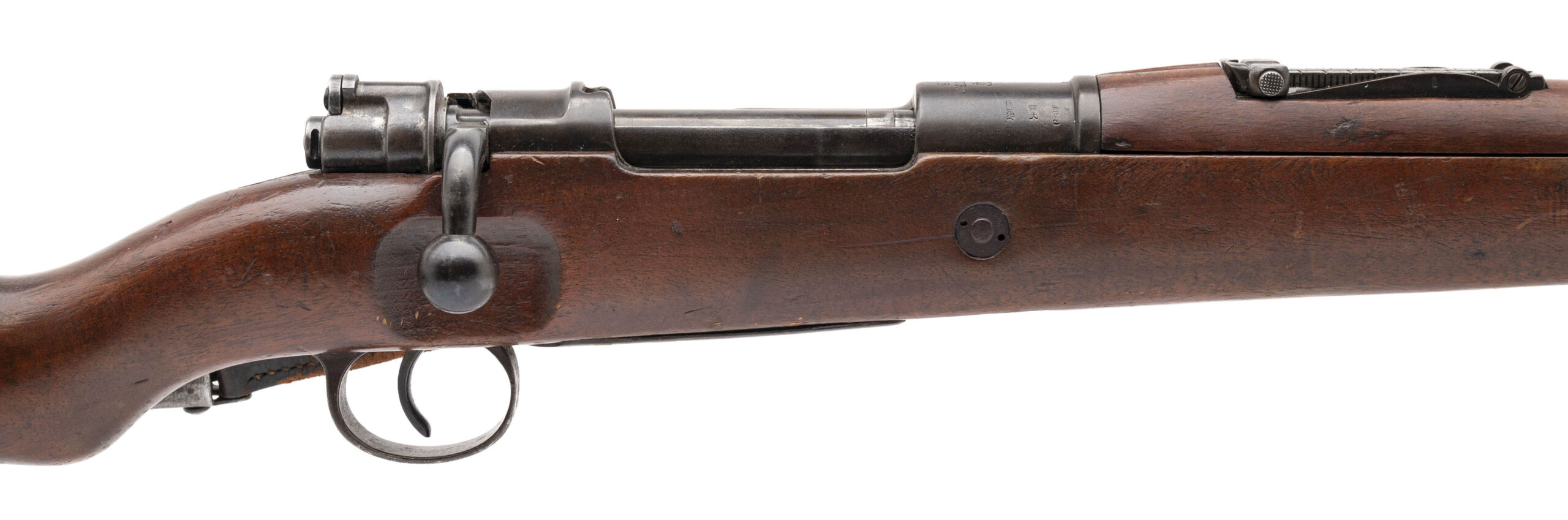 Serial No. 5724ii, manufactured in 1916 by the Royal Prussian Arsenal at Erfurt, chambered in 8mm Mauser with a 23.75-inch round barrel. Designed as a shorter and lighter alternative to the Gewehr 98 for cavalry, artillery, and stormtrooper units, the “aZ” designation stands for mit Aufpflanzvorrichtung und Seitengewehrzusatz—indicating a bayonet lug and stacking hook. All serial numbers are matching throughout, including the screws, reflecting excellent originality. The finish has thinned to a brown-grey patina with traces of original factory blue remaining in protected areas. The walnut stock shows light combat wear with scattered nicks and handling marks. The action cycles smoothly and functions correctly. Factory markings and Imperial acceptance proofs remain sharp and fully legible on the receiver and barrel shank.