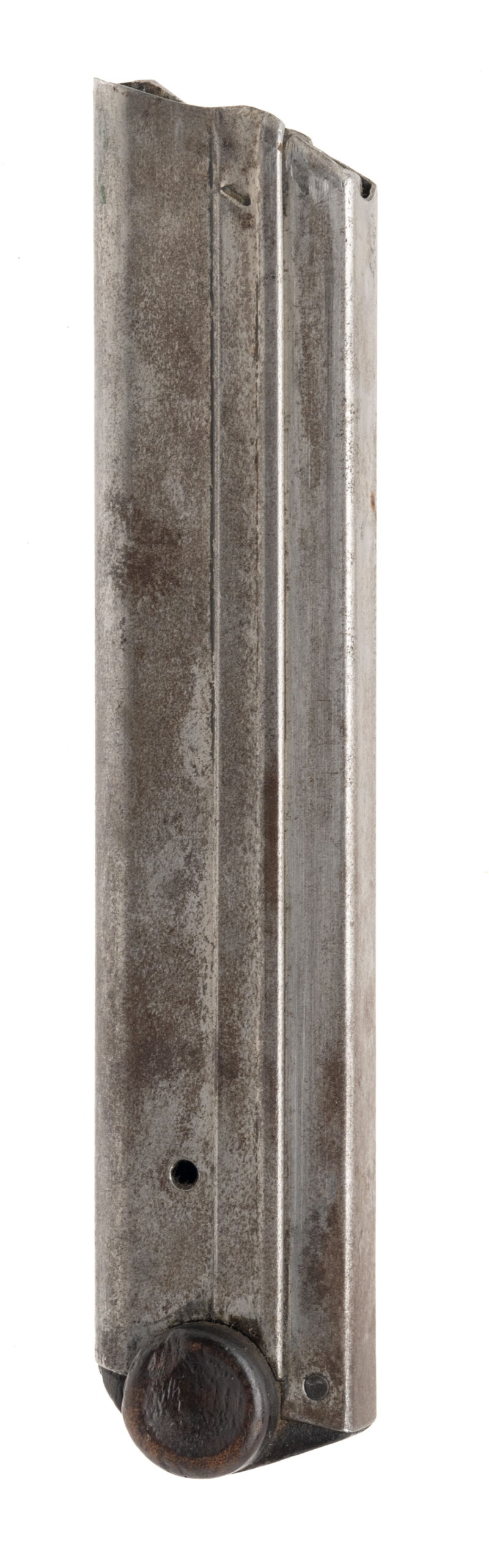 Original early WWI German Luger magazine in good overall condition. Metal finish is turning to a light grey patina. Wooden base plate is marked 9918/E. Spring tension remains strong. A representative early example with honest wear.