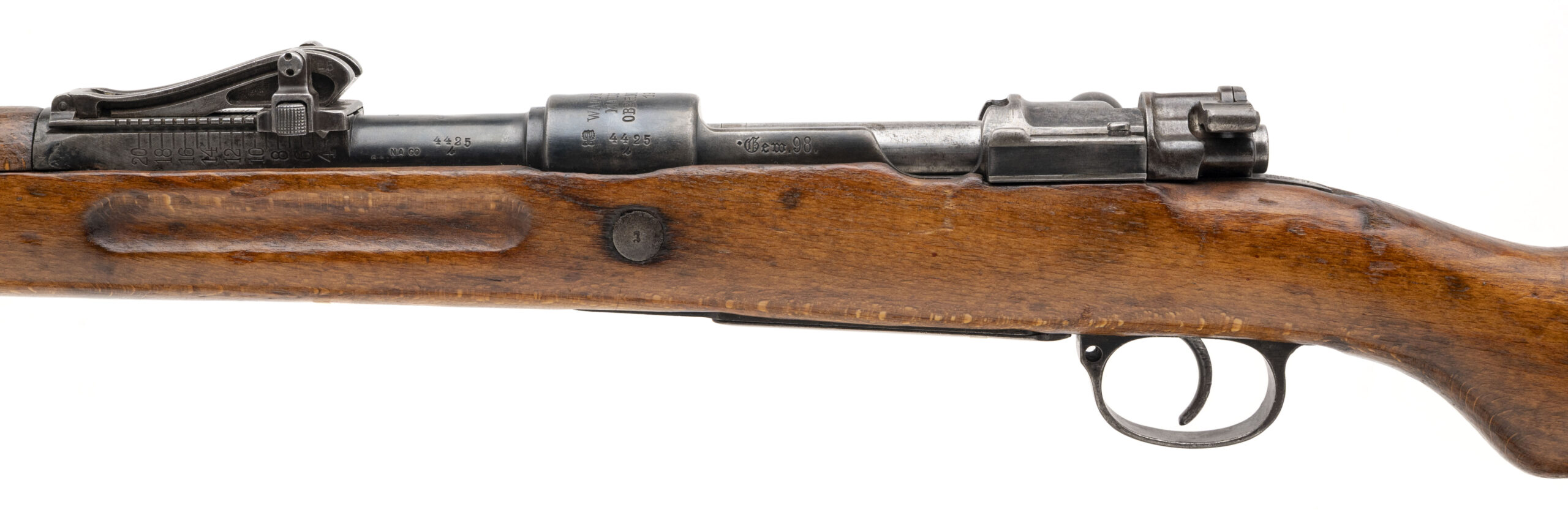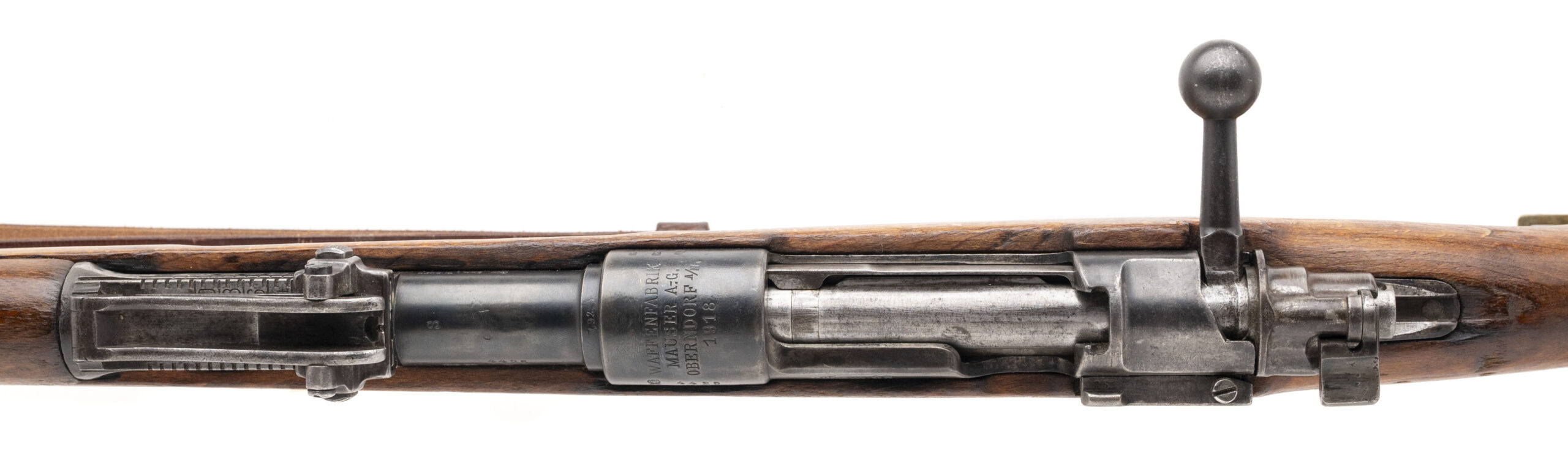Serial No. 4425b, manufactured in 1918 by Waffenfabrik Mauser A-G, Oberndorf A/N, 8mm, 29½” round barrel. Rifle remains in very good overall condition, showing light service wear consistent with late-war use. Metal surfaces have thinned to an even light grey patina, with all factory markings clear and legible. Serial numbers are non-matching, as commonly seen on rifles reassembled during or after the war. The hardwood stock displays light handling impressions and has been treated with a light coat of linseed oil, enhancing its grain while preserving an authentic appearance. Action is smooth and functions correctly. A solid and representative example of a late-production Gewehr 98, the standard German infantry rifle of the First World War.