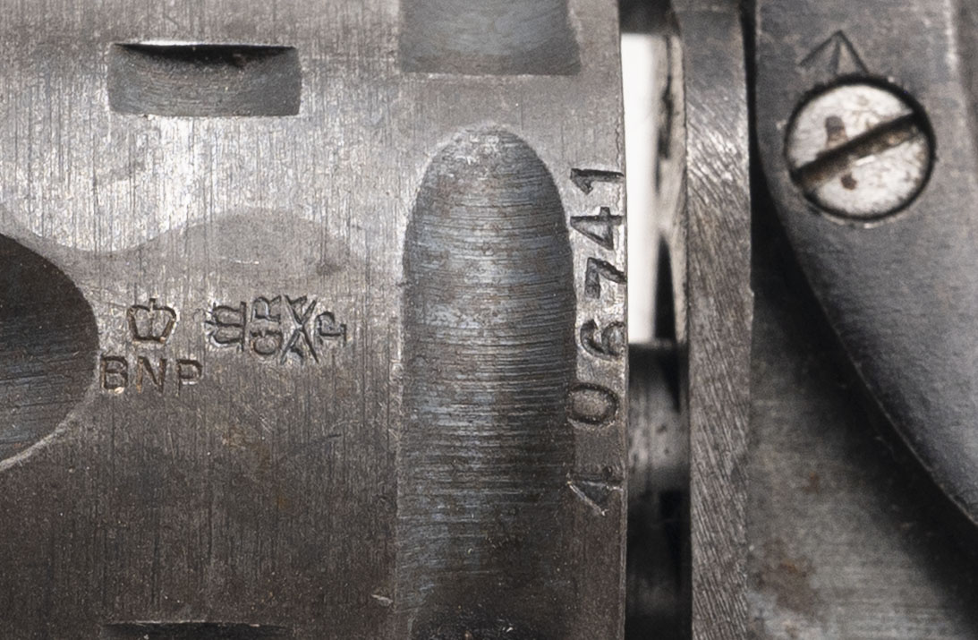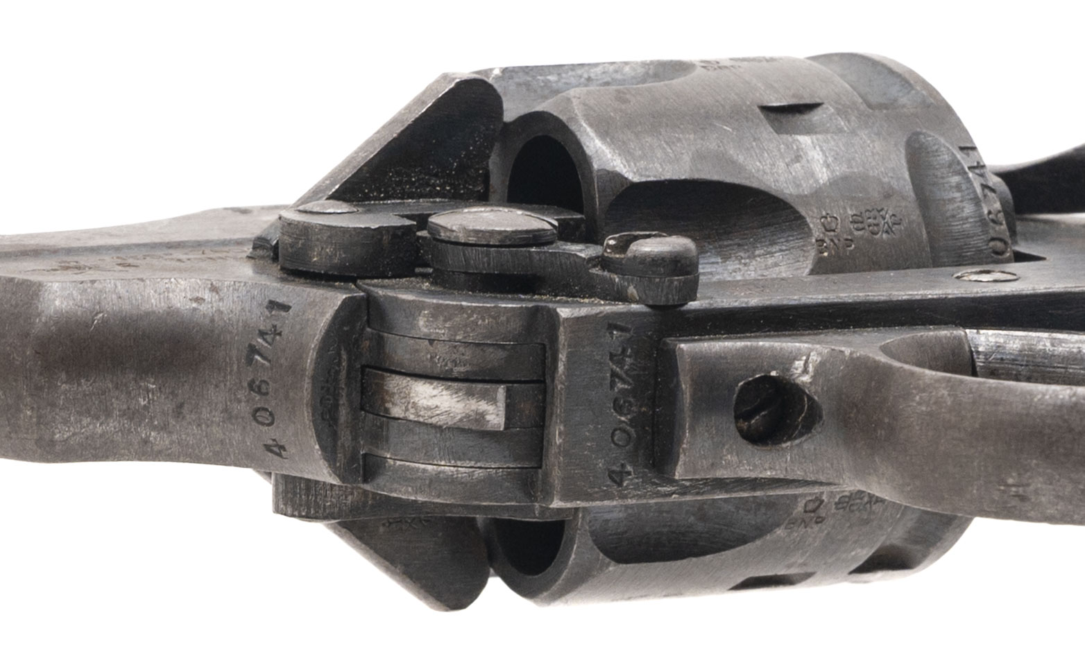 Serial No. 406741, manufactured in 1917, chambered in .45 ACP with a 6” octagonal barrel. The bore is bright, showing light frosting in the grooves with rifling remaining strong. Metal surfaces have aged to an even light grey patina, with traces of original blue visible in protected areas. Serial numbers are matching and factory markings remain sharp and well defined. The cylinder has been correctly cut to accept .45 ACP ammunition with moon clips, a common postwar modification. Action indexes properly and functions as it should, making this a solid and honest example of a WWI-era British service revolver.