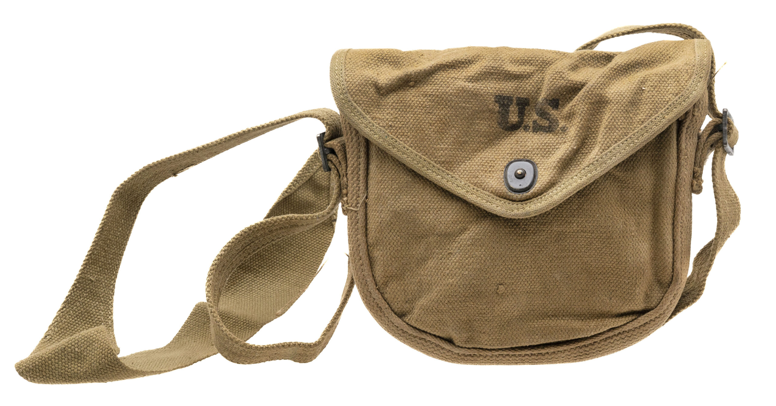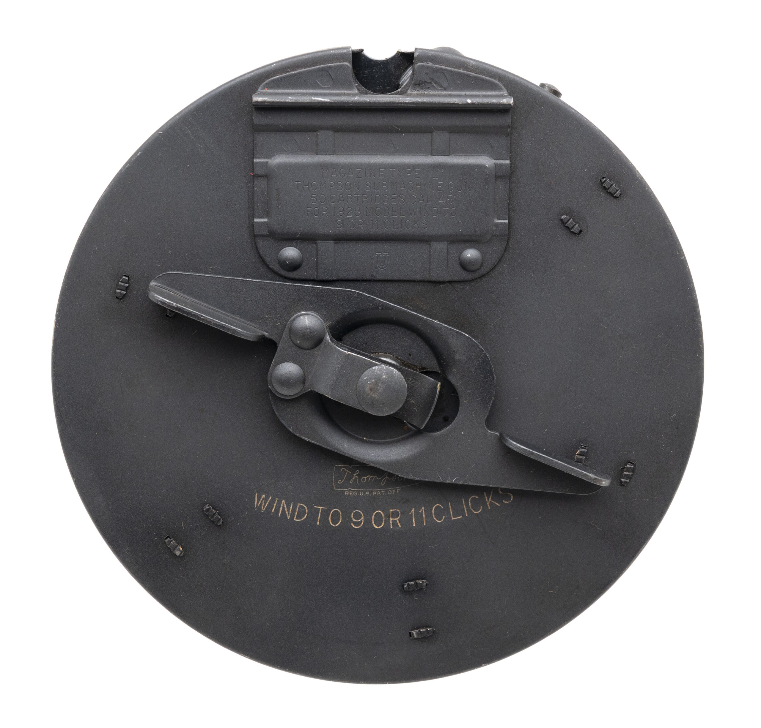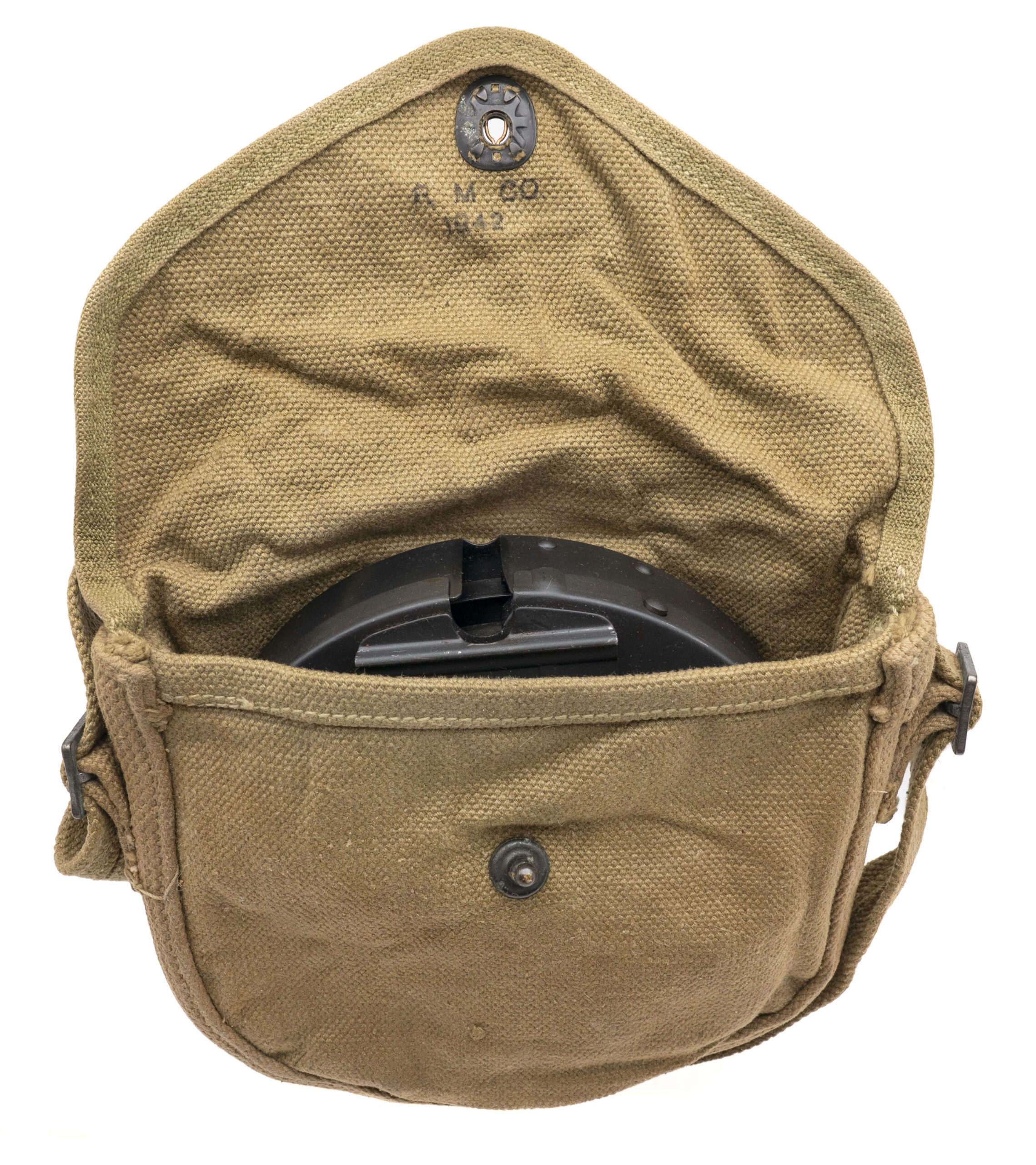 WWII Auto- Ordnance Corp 50rd Drum magazine for Thompson Model 1928 .45ACP in excellent condition showing only scattered light handling marks. Pouch is in very good condition and marked "R.M. CO/1942.