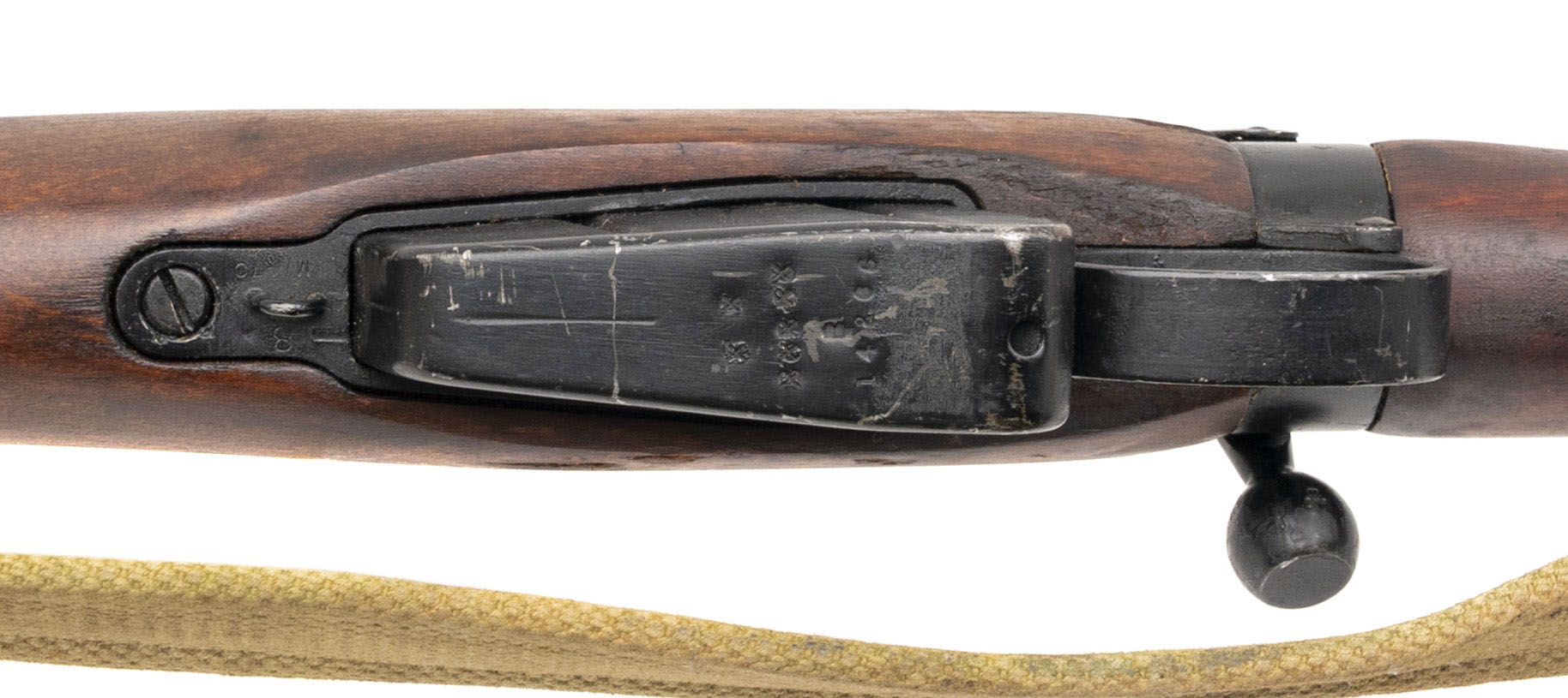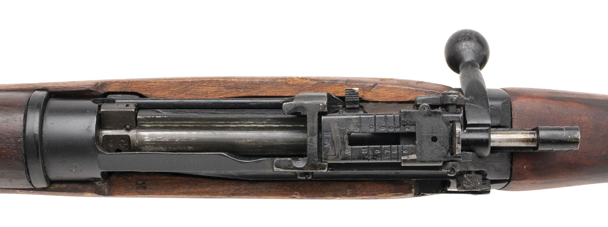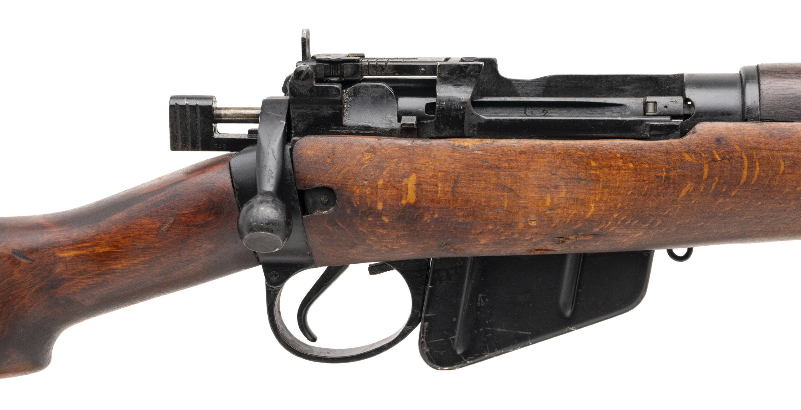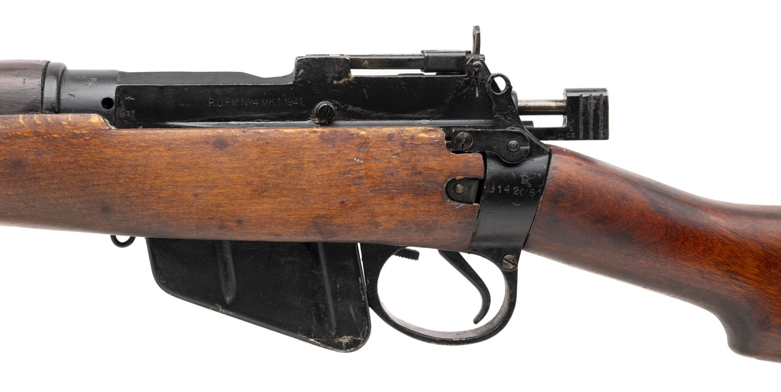 Serial No. B14206, manufactured in 1941, .303 British, 25” round import-marked barrel. Serial numbers are matching, with the magazine force-matched. Receiver is marked “R.O.F. M.” (Royal Ordnance Factory, Maltby). Rifle remains in very good overall condition, with the stock showing light handling marks and areas of preserved cosmoline from storage. Many of these rifles were imported from Ireland during the 1980s, where they had been held in reserve. Action is smooth and functions correctly. A fine example of an early-production No.4 Mk I Enfield, manufactured in 1941 as part of the urgent rearmament program to replace equipment lost during the Dunkirk evacuation.