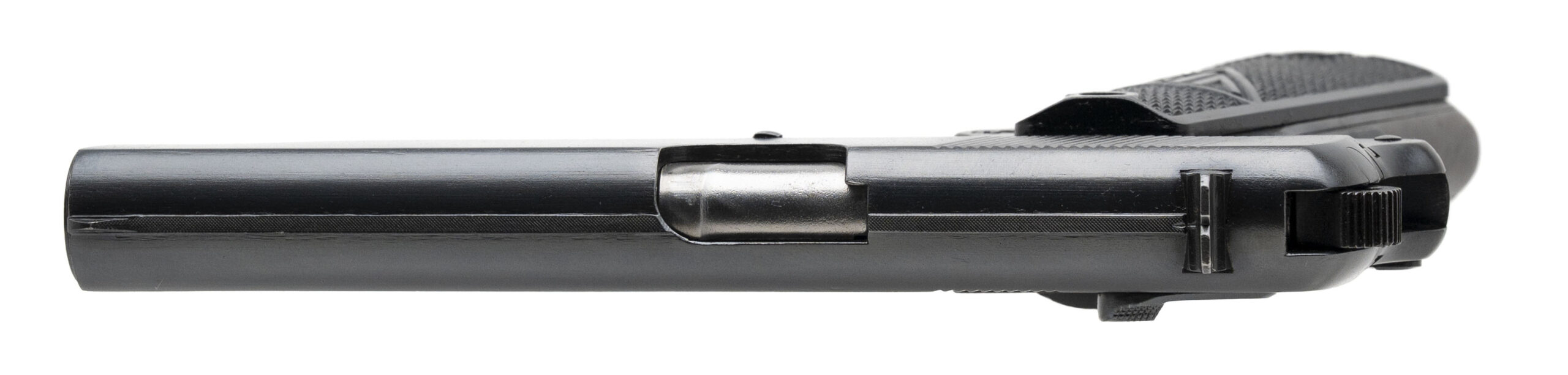 Serial No. D8043, manufactured circa late 1944, chambered in 9mm with a 4 ¾” round barrel. Serial numbers are matching, with WaA77 Waffenamt markings clearly visible on both the slide and frame. Retains 98% of a high-quality reblued finish, with minimal handling wear noted. Grips are in excellent condition. Action is smooth and functions correctly. A well-preserved example of this iconic WWII-era sidearm.