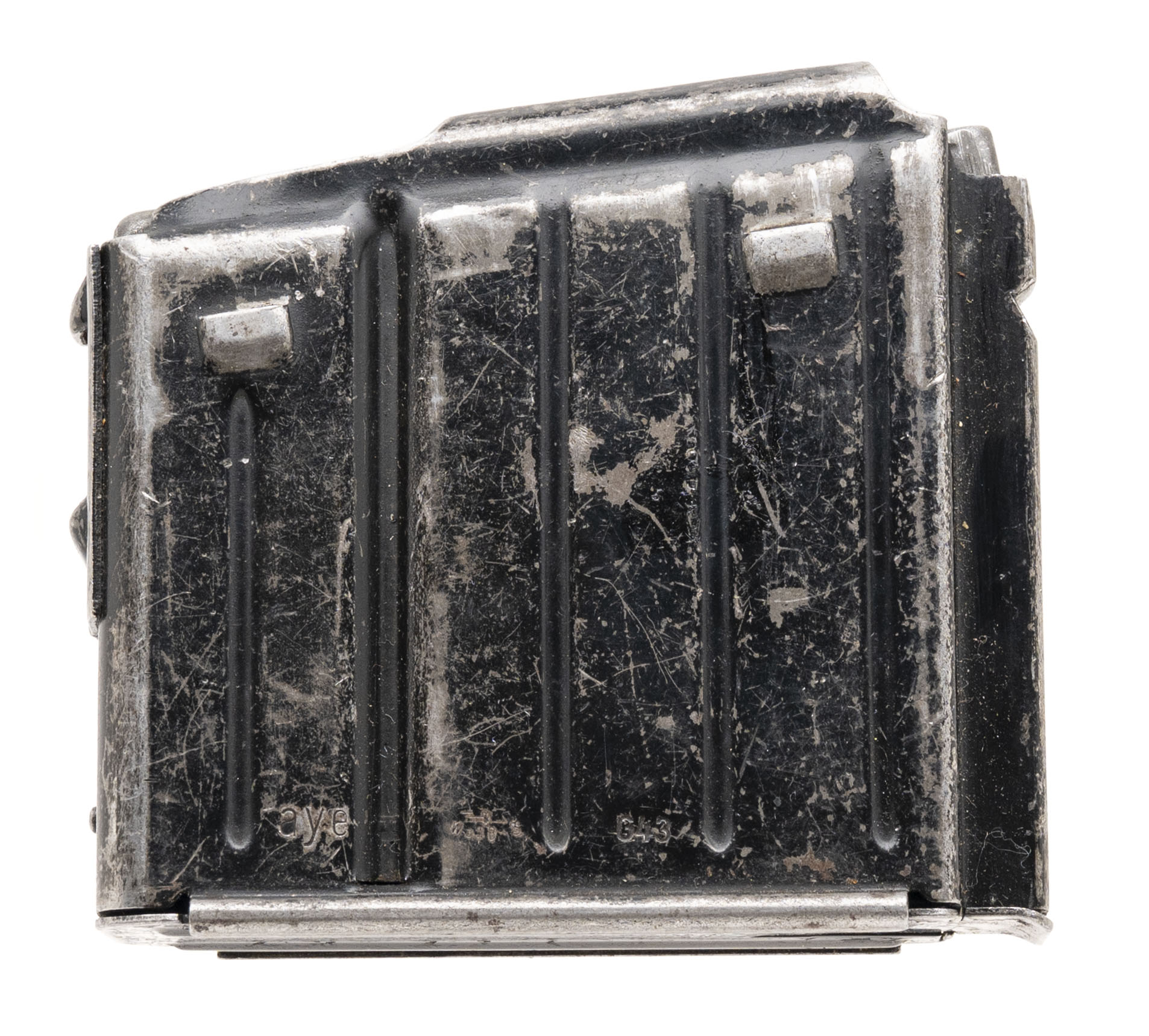 Original 10-round magazine for the G43/K43 rifle, chambered in 8mm Mauser. Marked “aye” with Eagle/WaA843 Waffenamt – G43”. Waffenamt is faint but remains legible. Spring is strong and fully functional. A solid and authentic example of a wartime G43/K43 magazine.