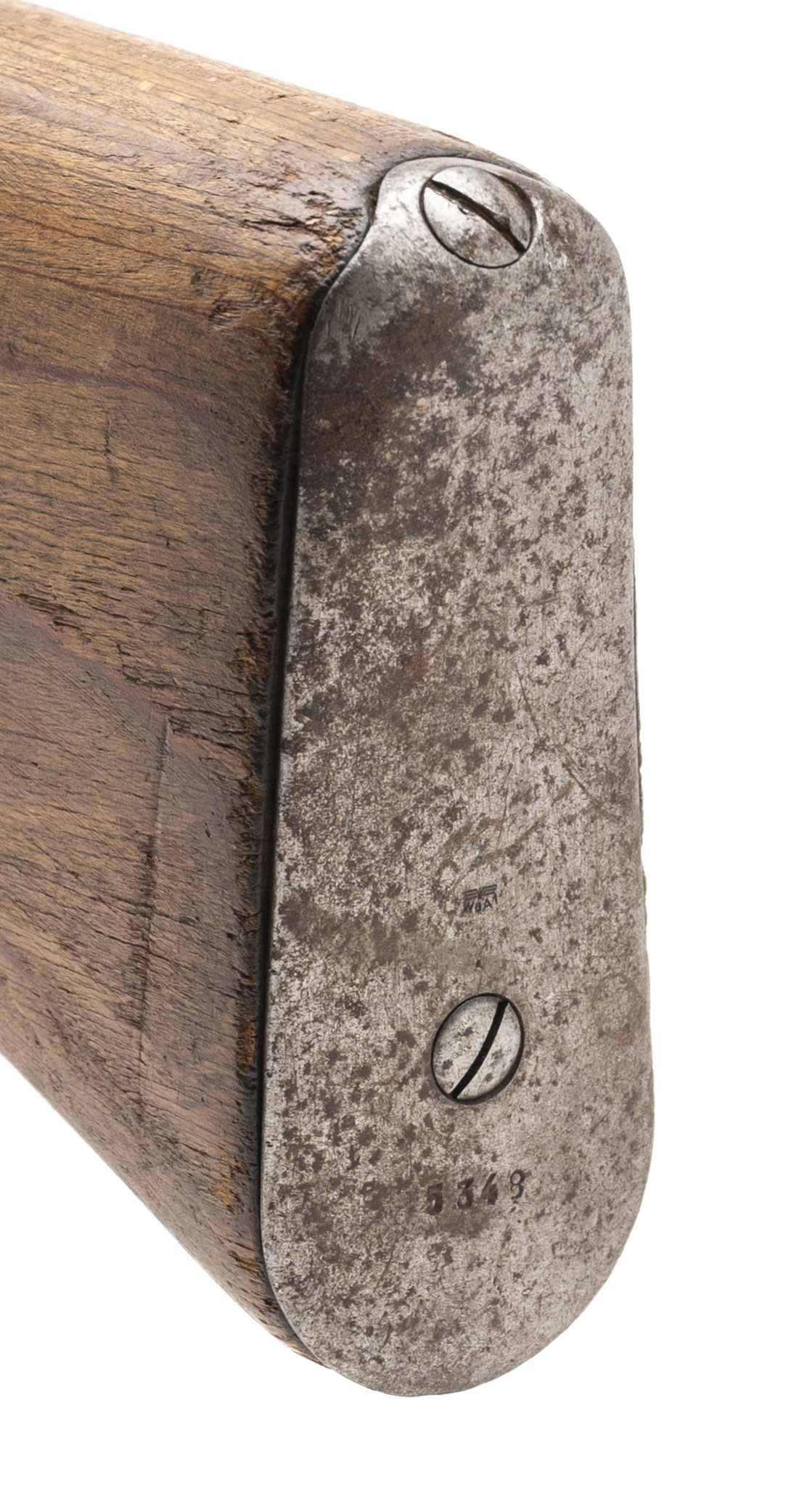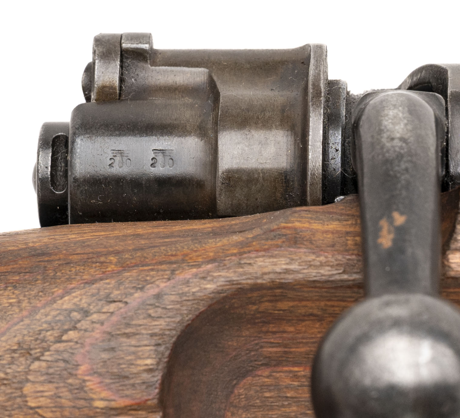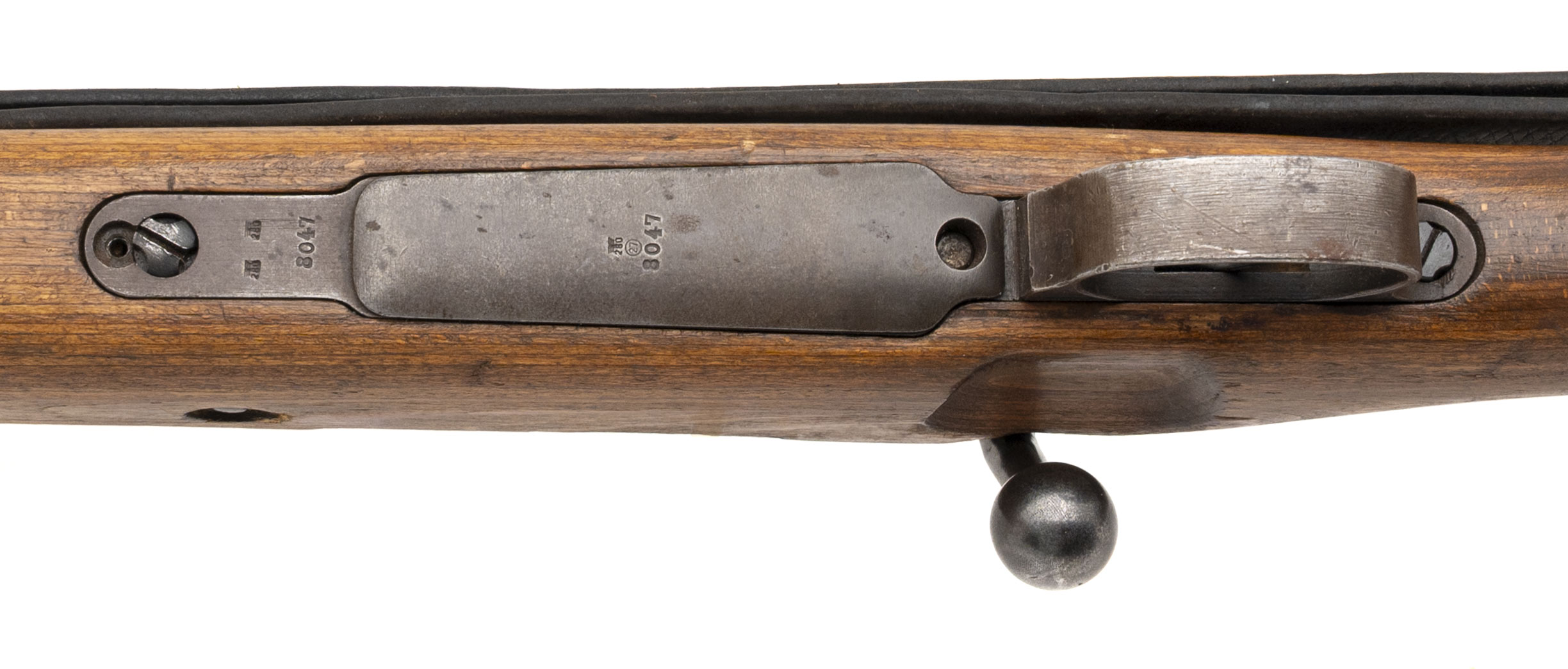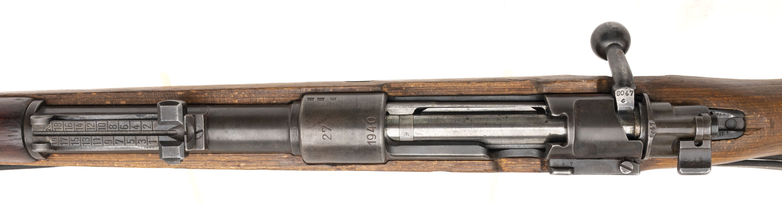 Serial No. 8047c, manufactured in 1940, 8mm, 24” round barrel. Rifle remains in very good overall condition, with matching serial numbers throughout except for the front barrel band. Metal has thinned to a smooth light grey patina, showing even wear consistent with age and service use. Factory markings remain clear and well-defined. The hardwood stock displays light handling impressions typical of field use but retains good color and fit. Action is smooth and functions correctly. A scarce example of a “27” coded K98 rifle produced by ERMA (Erfurter Maschinenfabrik) in 1940—manufactured just before the company shifted its production focus to the MP40 submachine gun, making these rifles increasingly difficult to find in original condition.
