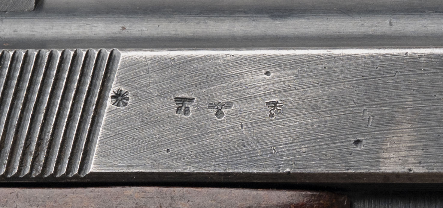 Serial No. 8026k, made January 1944, chambered in 9mm with a 5” round barrel. Pistol retains most of its original blue, with thinning visible along the barrel and grip straps. Serial numbers are matching throughout. The slide and frame are stamped with “Eagle/88” Waffenamt markings.Serrated Bakelite grips are in very good condition, showing light wear. Action is smooth and functions correctly; de-cocker operates as intended.