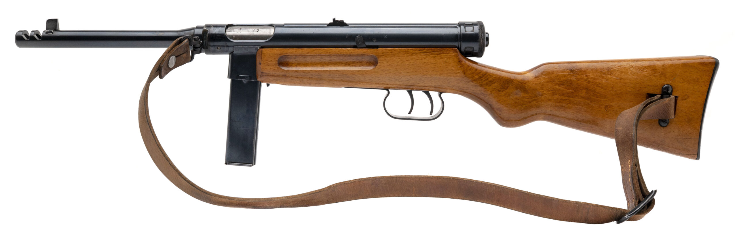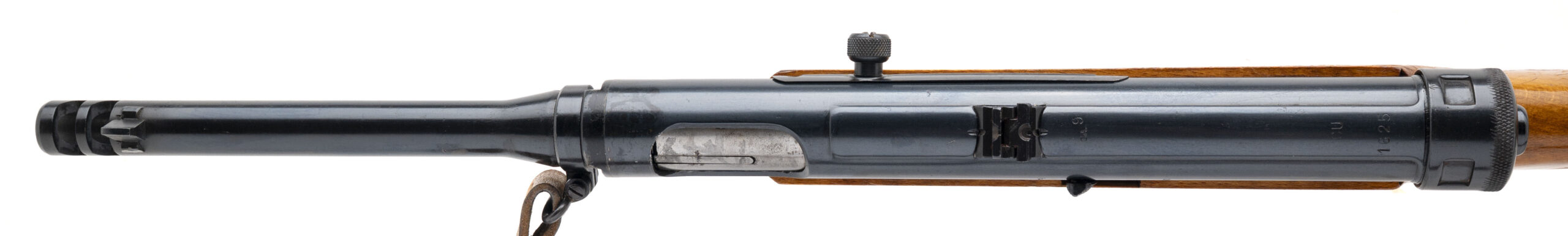 Serial No. CU1625, manufactured circa 1943–1944, chambered in 9mm, with a 9” round barrel. This is a late-war example of the Beretta Modello 38/42, a simplified evolution of the original Beretta 38A, designed for rapid wartime production. The barrel lacks the early model’s cooling fins, consistent with the streamlined 38/42 pattern. Bore is bright with strong rifling. Features dual triggers for both semi-automatic and full-automatic fire typical of the Beretta SMG line. Fitted with its correct blonde wood buttstock and accompanied by an original Italian leather sling in excellent condition. (CLASS III ITEM/ALL NFA RULES APPLY)