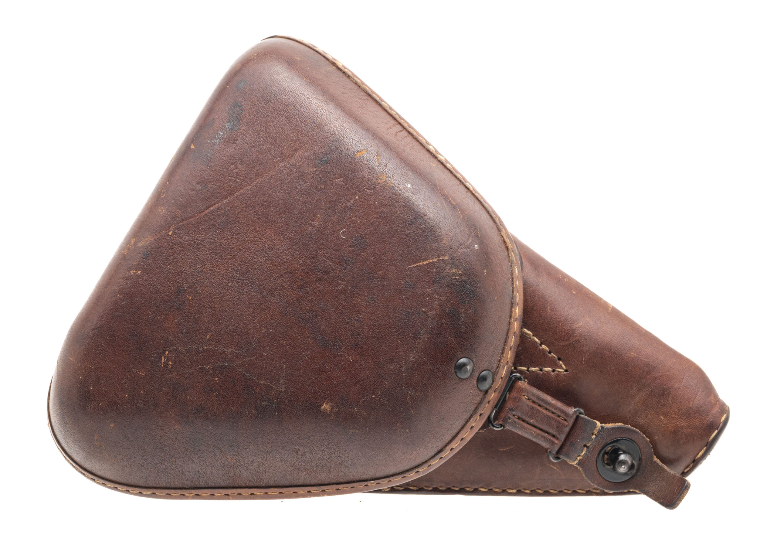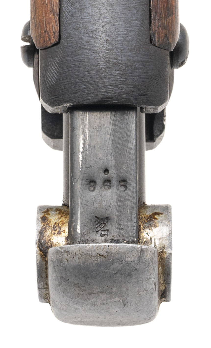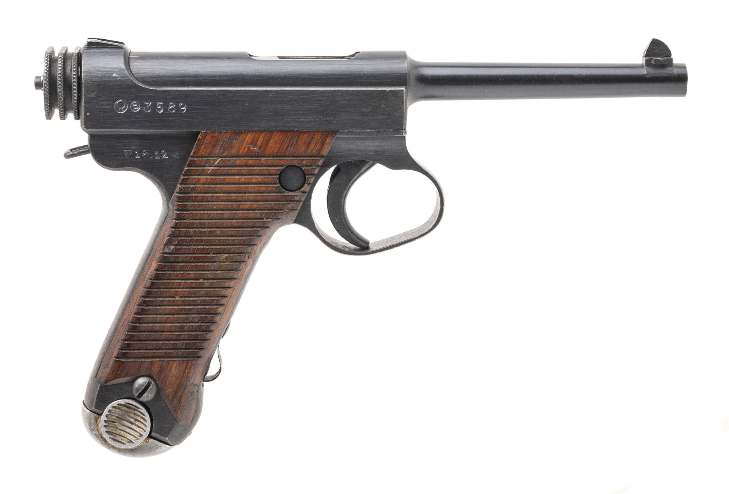 Serial No. 3589, manufactured in December of 1943, chambered in 8×22mm Nambu with a 4.6” round barrel. The bore is bright with strong rifling clearly visible. Serial numbers are matching with the exception of the magazine. The finish shows light, honest wear consistent with service use, while factory markings remain sharp and well defined. This example features the later large trigger guard configuration associated with mid-to-late war production. The action is smooth and functions correctly. Pistol is accompanied by a brown leather clamshell holster in very good condition, complete with a spare firing pin and original cleaning tool.