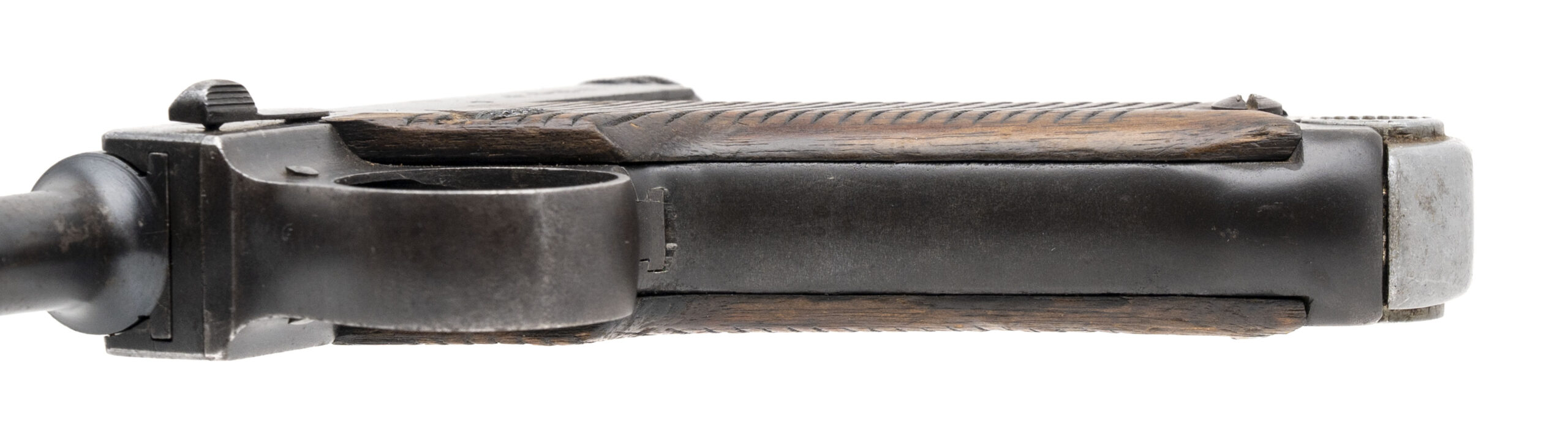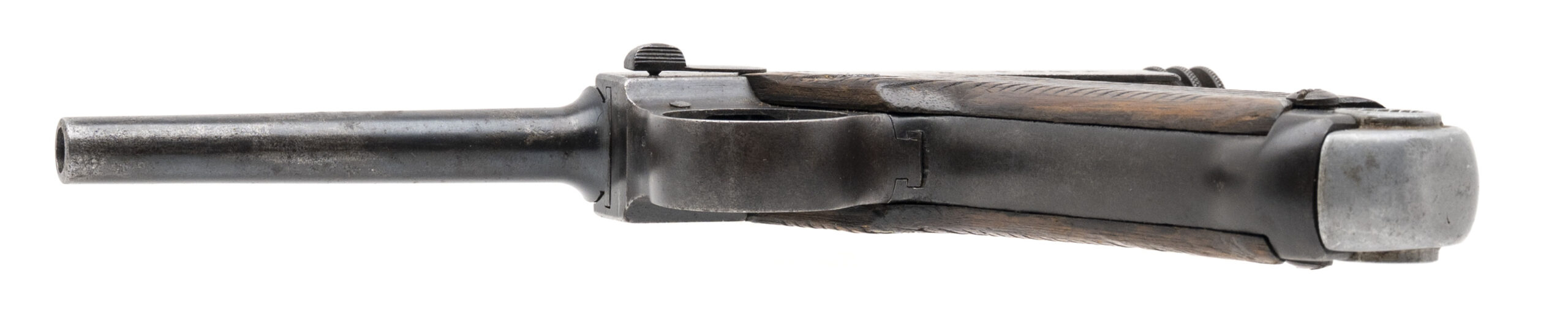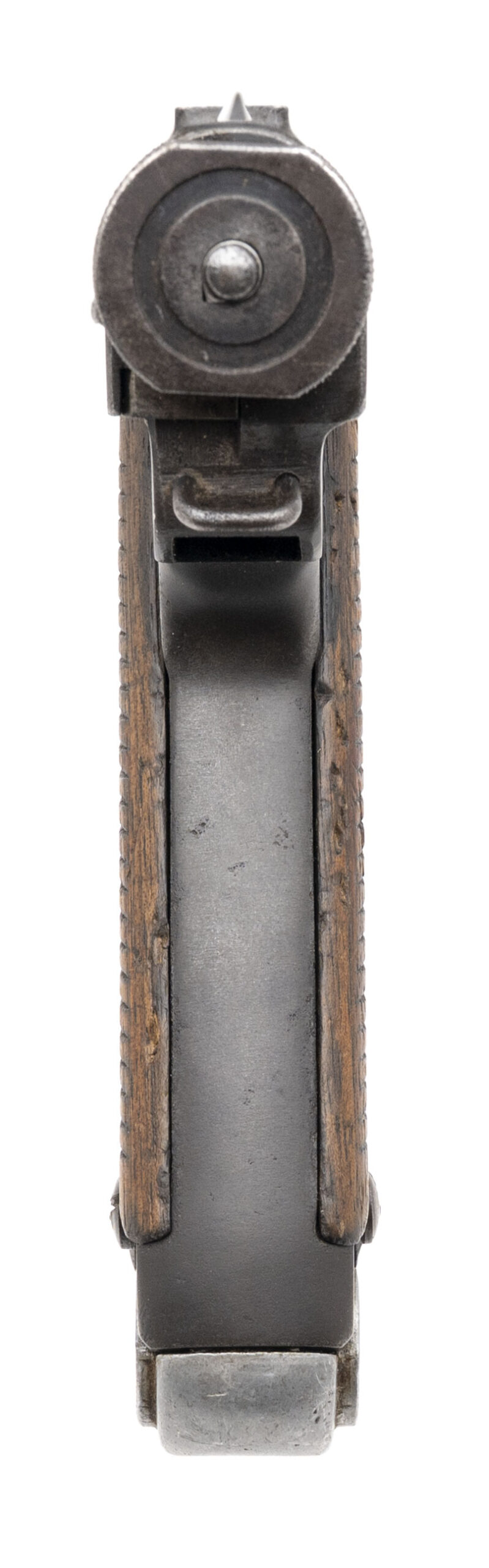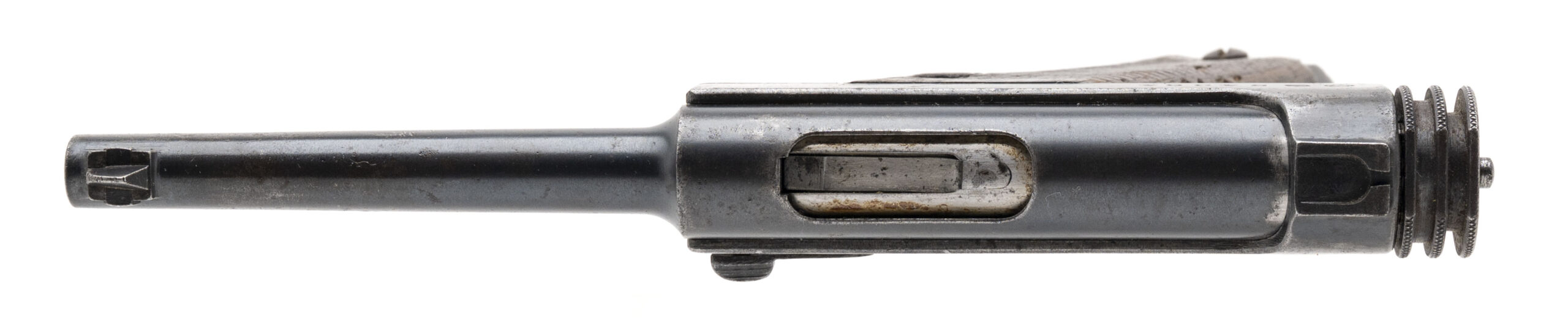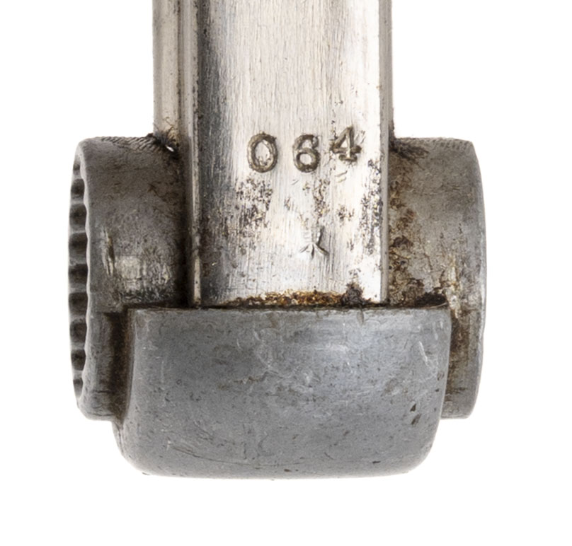Serial No. 54064, made December 1938, 8x22mm, 4 ½” round barrel. Produced at the Tokyo Gas & Electric Kokubunji Factory, this is an early-production Type 14 pistol. Serial numbers are matching, although the firing pin and grips are unmarked, as occasionally seen with earlier pistols. The majority of the original blue finish has thinned to a grey patina, with approximately 30% blue remaining on the barrel and upper slide. Grips are in good condition with light handling wear noted. Action is smooth and functions correctly.