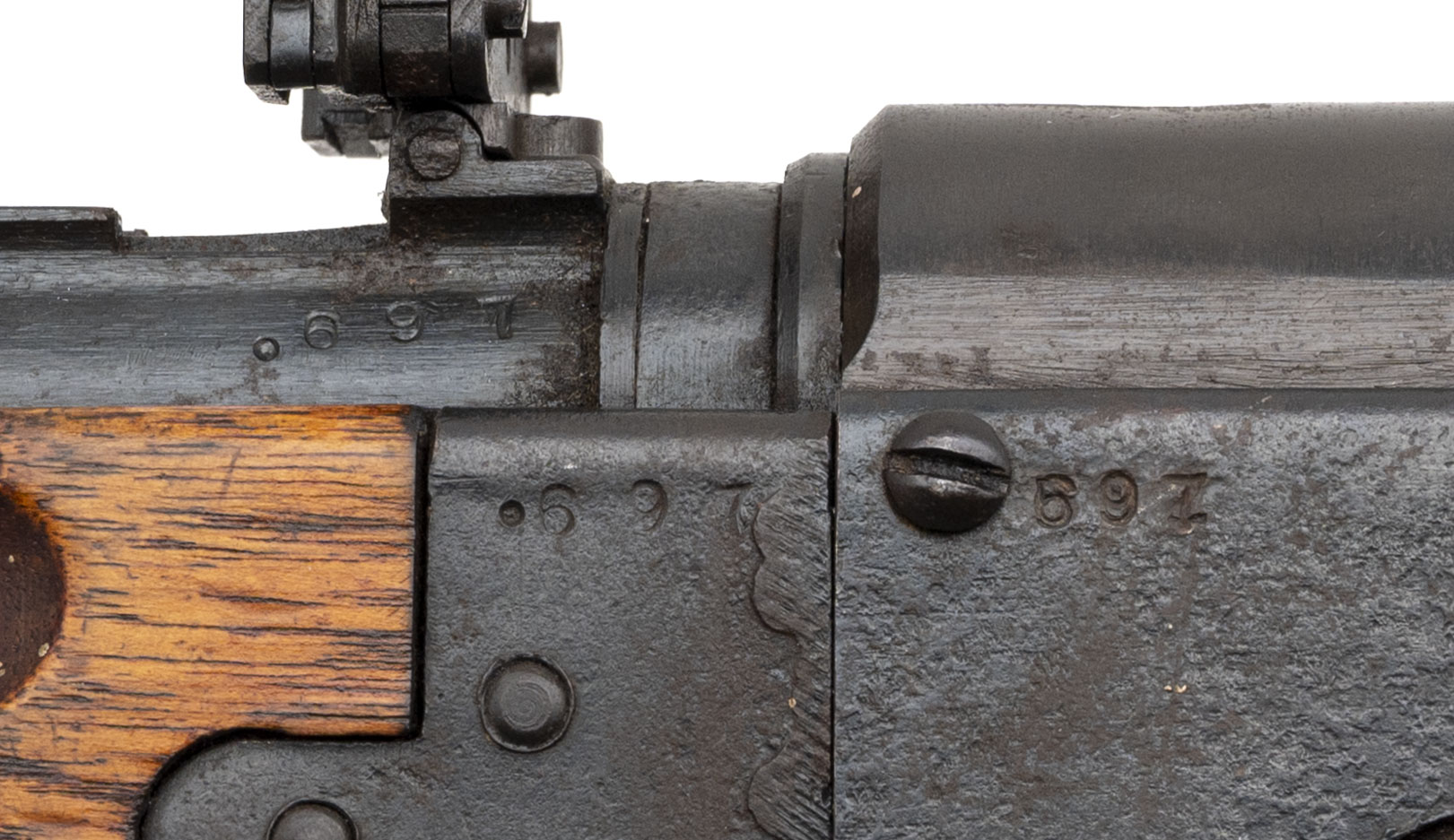 Serial No. 11754, manufactured circa 1942–1945, 7.7x58mm, 25½" round barrel. Bore is bright, showing light frosting with strong rifling present. Serial numbers and part numbers are fully matching throughout, a desirable feature on Type 2 paratrooper rifles. Partial mum remains on the receiver, consistent with rifles surrendered at the end of the war, and was also done in the field. Stock shows light, honest handling impressions from field use, but remains solid with no cracks noted. Action is smooth and functions correctly. A clean, matching example of a scarce Japanese Type 2 paratrooper rifle.