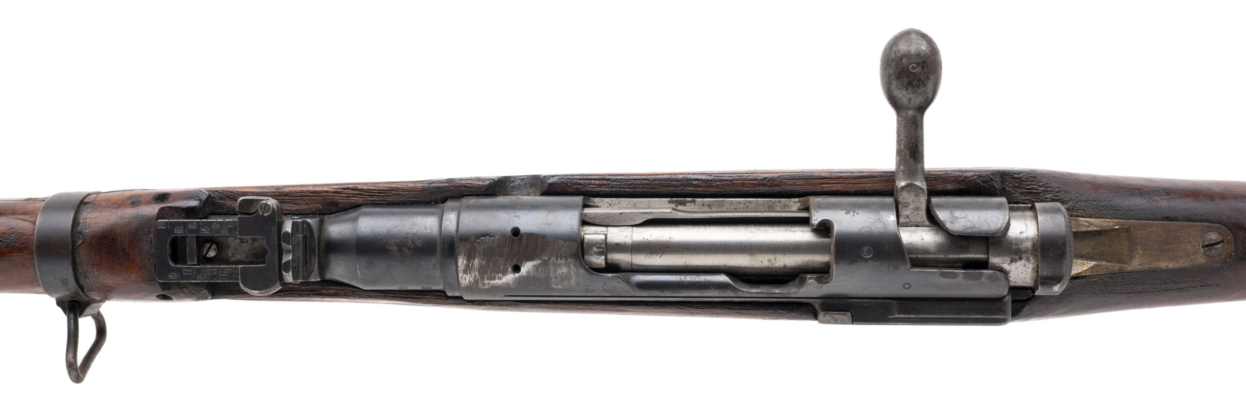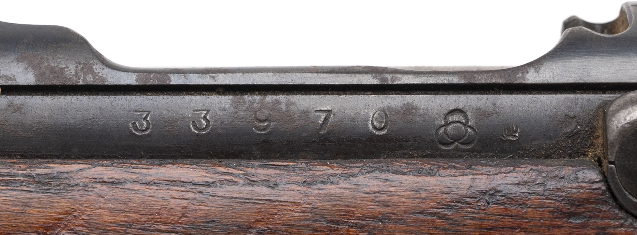 Serial No. 33970, produced circa 1912–1942 (approx. 91,000 manufactured), 6.5x50mm, 19.2” round barrel fitted with the integral under-folding bayonet distinctive to the Type 44 cavalry carbine. Serial numbers are non-matching, and the front sight exhibits minor battle damage, adding character consistent with field service. Receiver retains a partial mum and kanji, a condition often seen not only from end-of-war defacement but also from deliberate grinding by Japanese soldiers during combat. Stock shows light handling impressions, while the bore remains good with strong rifling visible. Action is smooth and functions correctly. A solid example of a Nagoya-made Type 44 cavalry carbine, a model increasingly scarce in any honest, service-used condition.