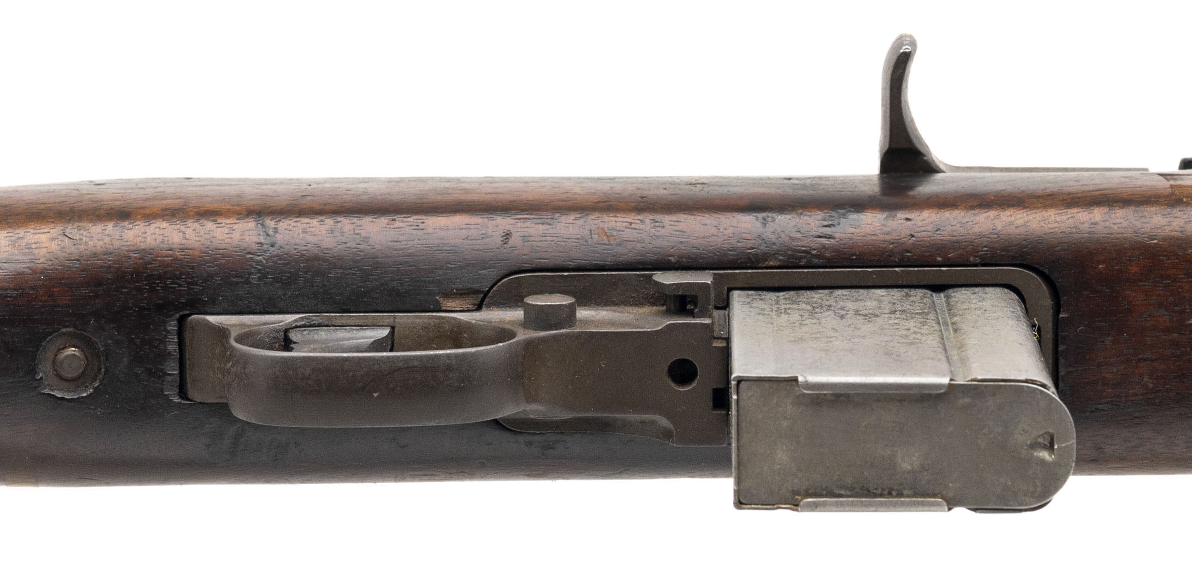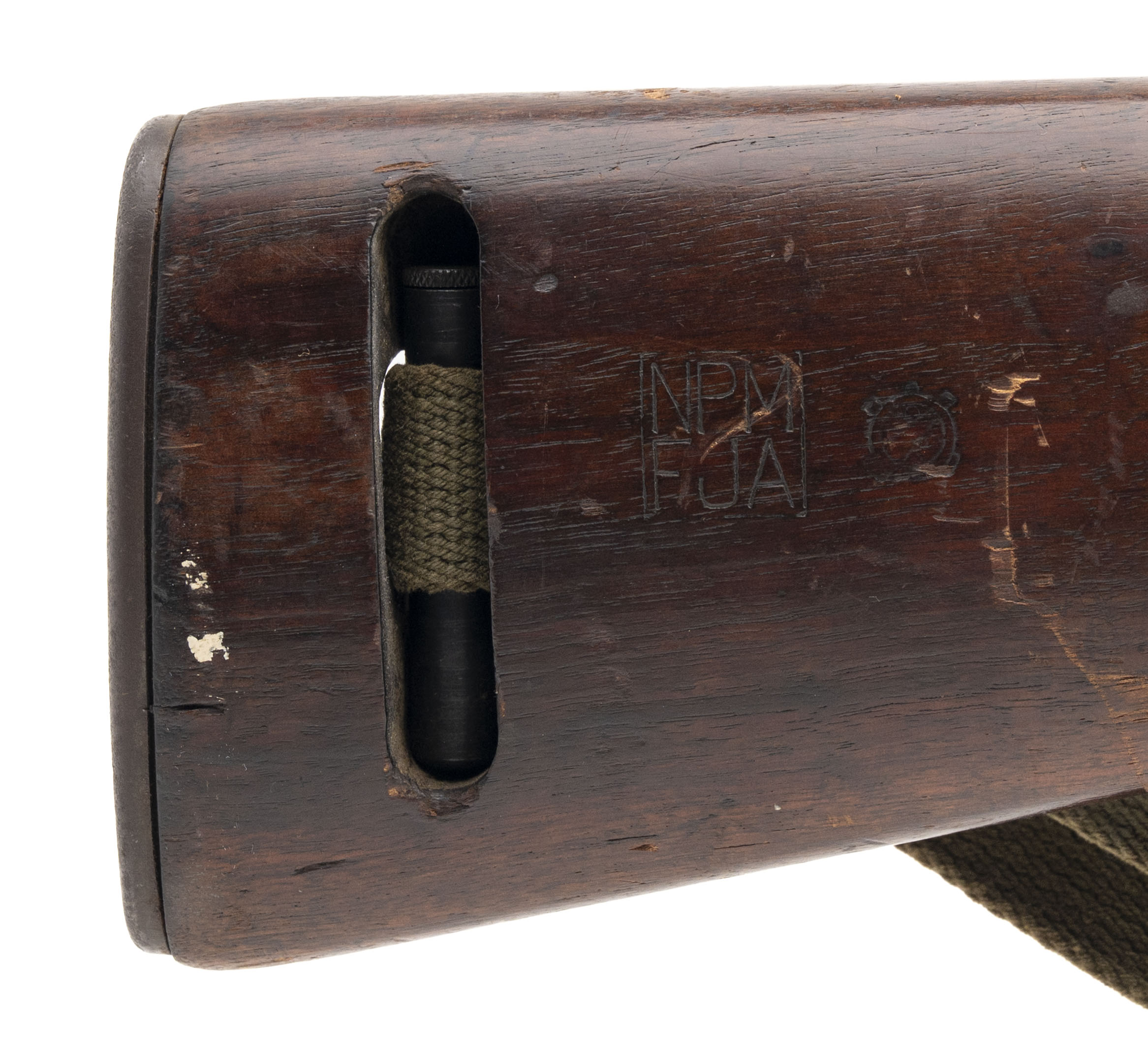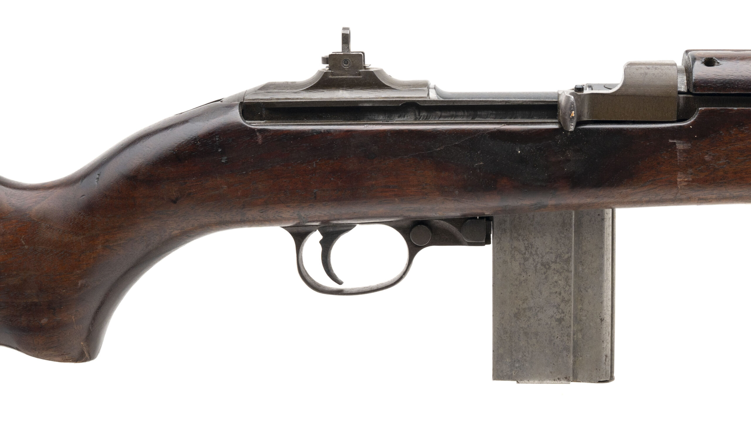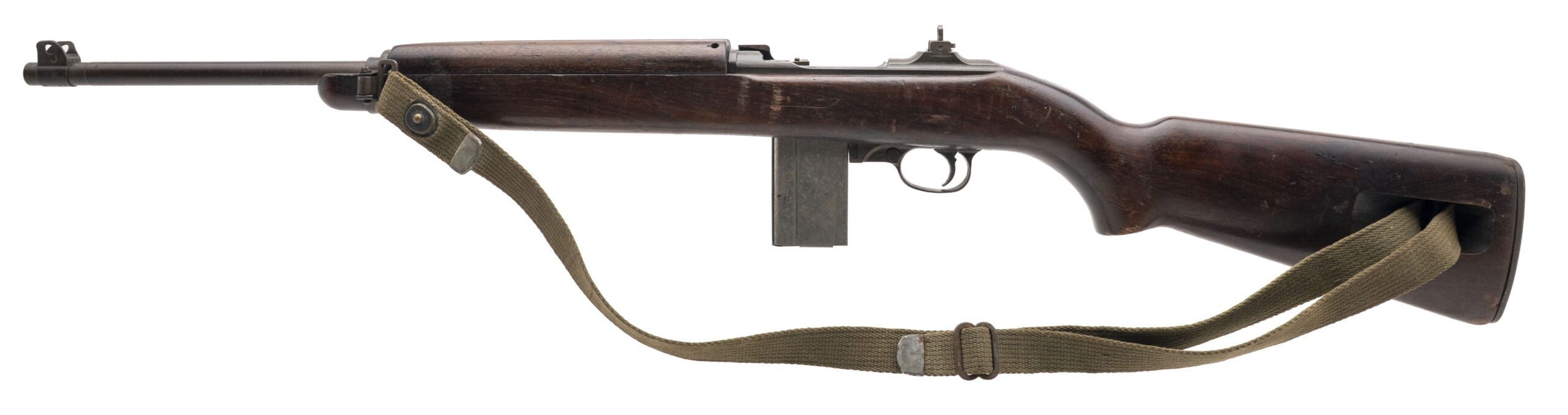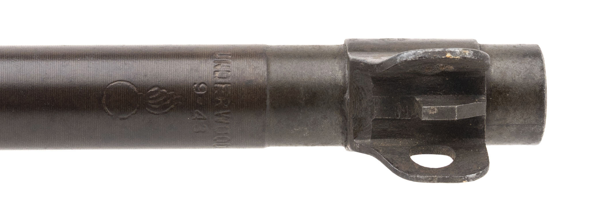 Serial No. 1498221, made early 1943, .30 carbine, 18” round barrel marked “ Underwood/9-43/Flaming Bomb”. Bore is handsome with excellent rifling noted. Barrel has thinned to a plum patina with light surface oxidation noted. High wood stock shows expected handling impression with handsome cartouches noted on the right side. “TN” is stamped inside the sling well. Carbine comes with oiler and sling, action functions correctly.