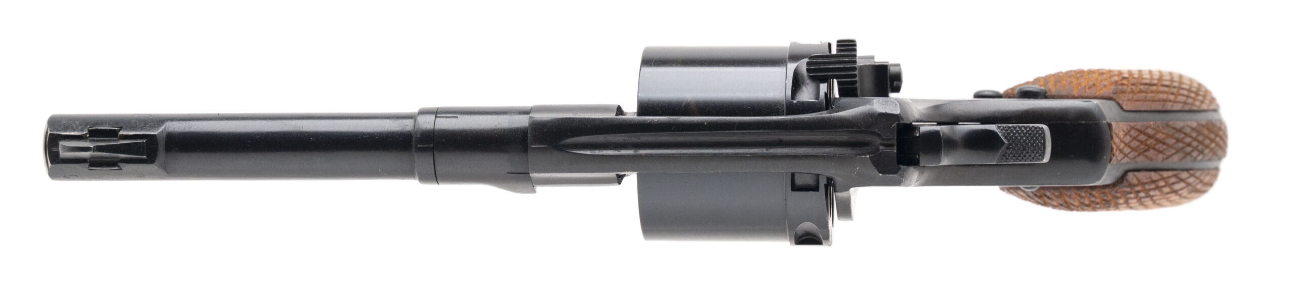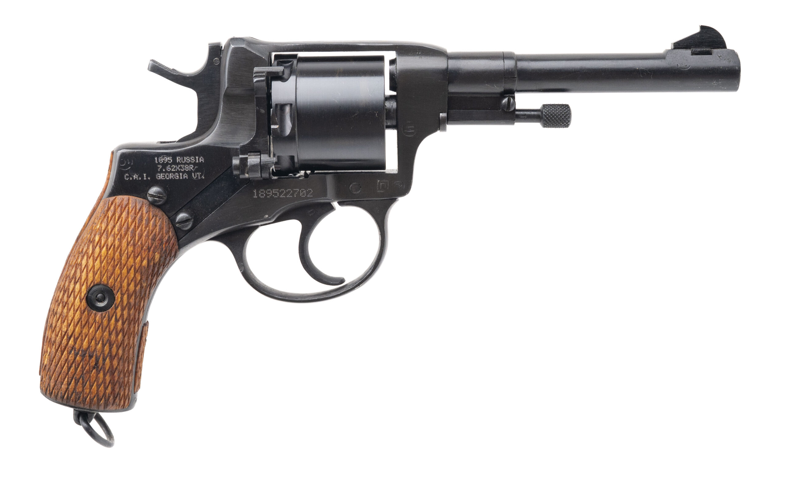 Serial No. 189522702 (Importer), manufactured 1939, 7.62x38mmR, 4.5” round barrel. This revolver was manufactured in 1939, just prior to the Soviet invasion of Finland and the escalation of World War II on the Eastern Front. The revolver has been arsenal refurbished, with the import mark noted on the left side of the receiver. Metal finish shows the standard blued refurbishment consistent with Soviet storage protocols. The grips are in very good overall condition, with light wear. Mechanically, the action indexes correctly, and the revolver maintains a tight lockup. This revolver comes complete with a brown leather Soviet-style holster, cleaning rod, and lanyard.