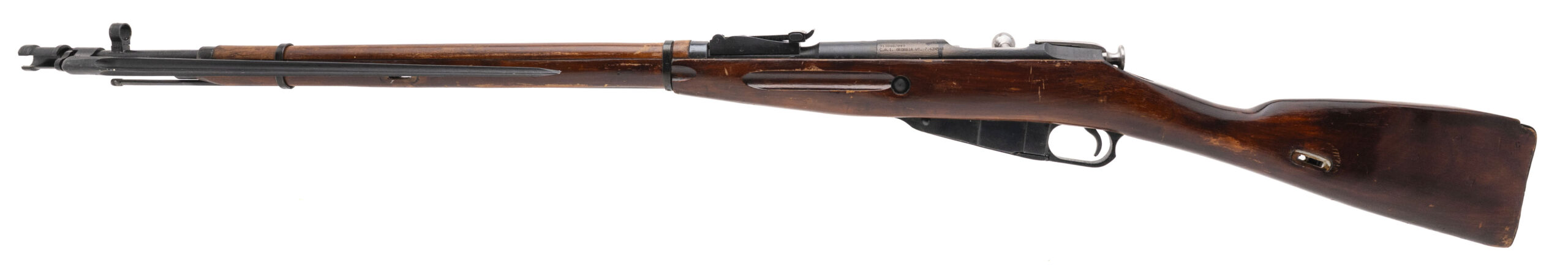 Serial No. 9130487049 (importer original serial numbers are matching), made in 1942, 7.62x54R, 29” round barrel. Bore is bright with strong rifling visible. Left side of the receiver is import marked. Expected handling and storage wear is noted on the finish and stock. Overall, very good plus condition, action is smooth and functions correctly. Rifle comes with bayonet.