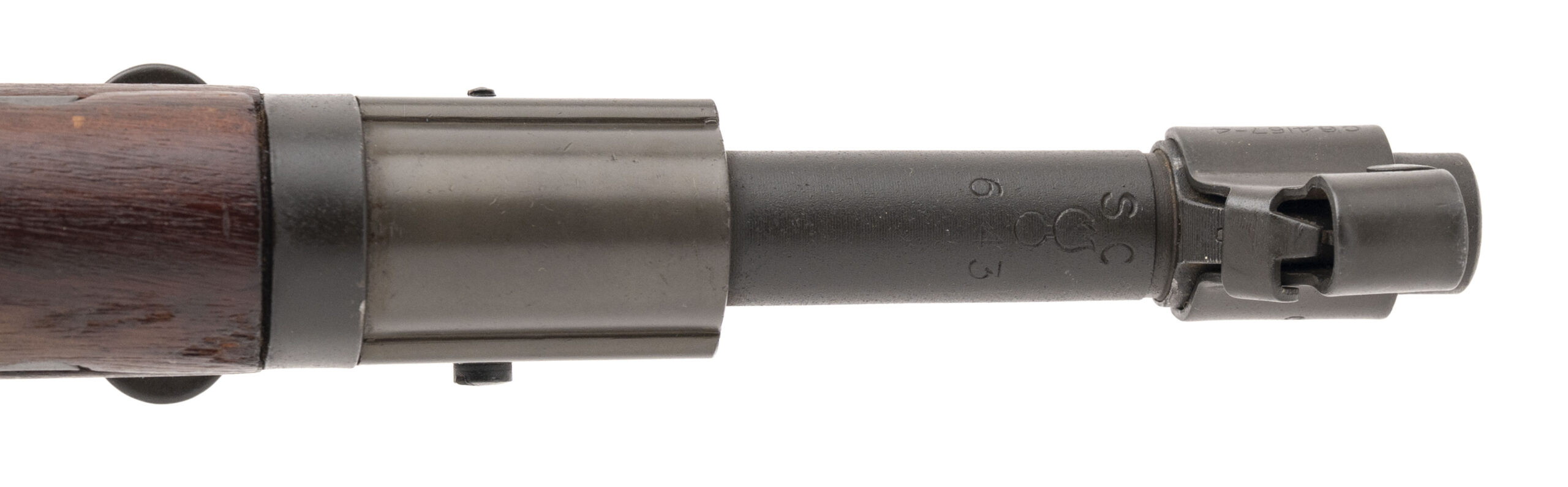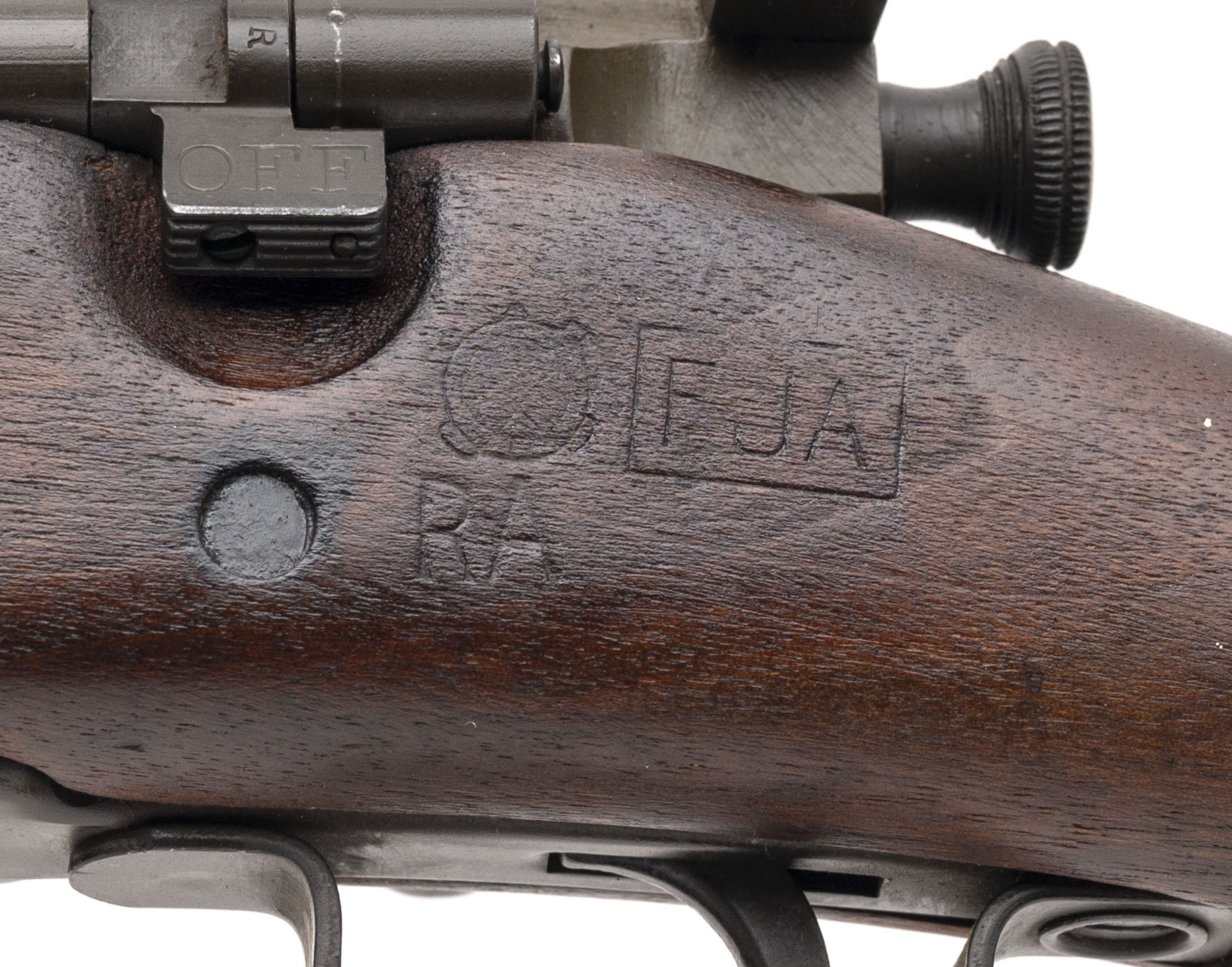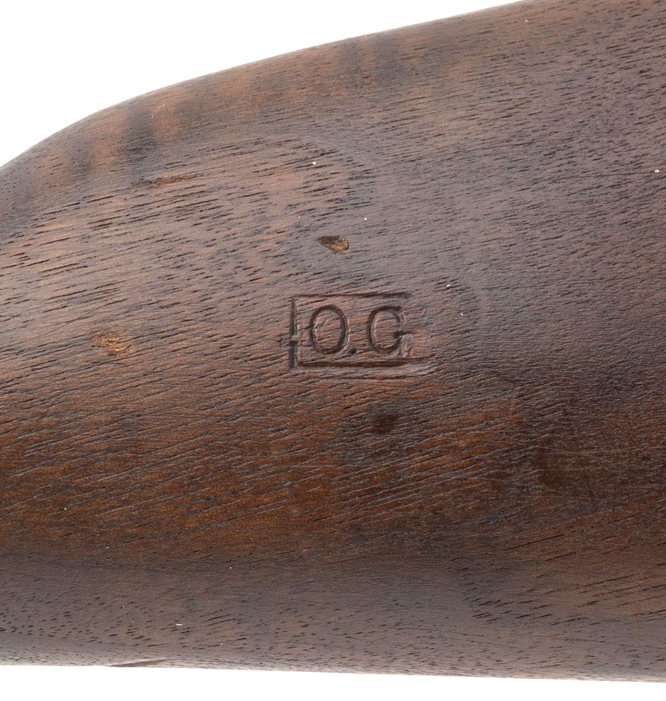 Serial No. 4750084, manufactured in 1944. Chambered in .30-06 Springfield with a 24" round barrel marked "SC / Flaming Bomb / 6-43". Retains 98% of its original parkerized finish. Stock is excellent with minor handling marks and light impressions on the buttstock. Left side of the stock is stamped with "Ordnance escutcheon / RA-FJA" inspector cartouches. Rear of the buttstock bears an "O.G." marking, indicating post-war Ogden Arsenal inspection. Action is smooth and functions properly. A fine example of a WWII-production Smith-Corona 03-A3 in near-original condition.