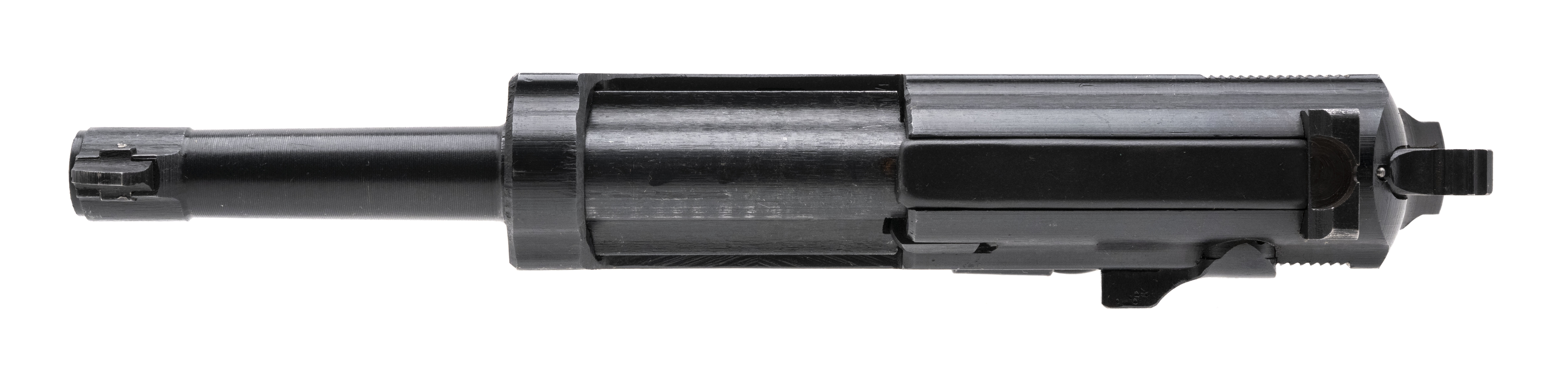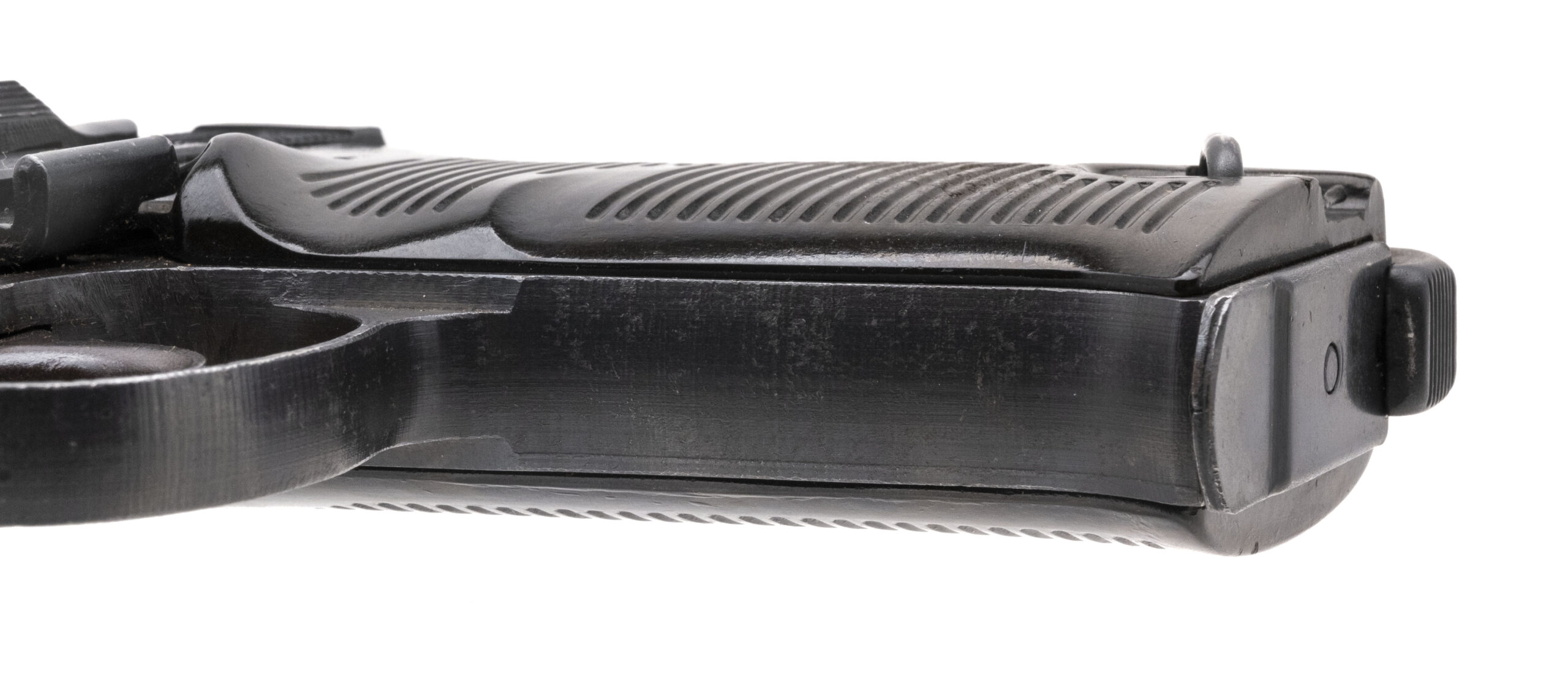 Serial No. A2935, circa March 1945, 9mm, 5” round barrel. Bore is bright with light frosting visible in the grooves, rifling remains strong. Serial numbers are matching, 95% late war finish remains. Grips are in excellent condition with light wear visible on the left side. Action and de-cocker function correctly