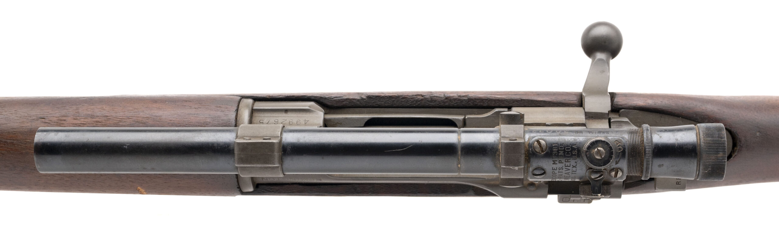 Serial No. 4992675, manufactured in 1943, .30-06 Springfield, 24” round barrel marked “R.A./Flaming Bomb/12-43.” Rifle remains in very good overall condition, showing light handling impressions consistent with careful use. Equipped with an original M73B1 Weaver scope featuring clear optics, mounted on REDFIELD-marked bases. Stock is very good with minimal handling wear and displays a handsome “R.I.A./E.B.” cartouche at the butt. Action is smooth and functions correctly. Rifle includes a period-dated leather sling. An excellent and complete example of a wartime-issued Remington 03-A4 sniper rifle, representative of America’s precision arms of WWII.