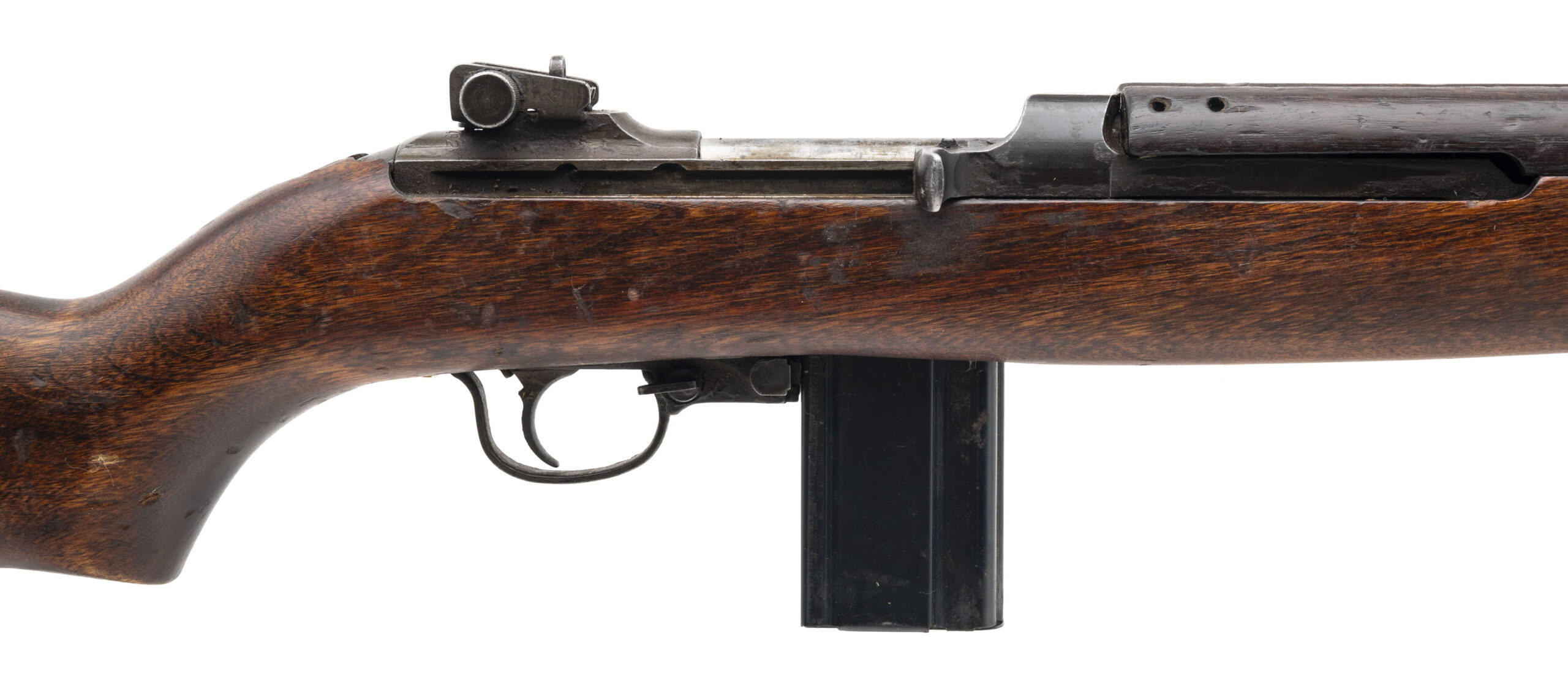 Serial No. 5647482, manufactured in 1944, .30 Carbine, 18” round barrel marked “W” for Winchester.Originally produced by Winchester Repeating Arms during WWII, this M1 Carbine was later arsenal-upgraded for post-war use. The carbine now features a bayonet lug barrel band (unmarked), a round bolt, and a Type III adjustable rear sight marked with an “H” inside a shield, indicating late/post-war production or refurbishment components. The push-button safety has been replaced with the upgraded flip-style safety, a common post-war improvement for reliability and ease of use. The low wood “pot belly” stock is in very good condition, showing only light handling impressions from service and storage.The action is smooth and functions correctly, making this a great representative of a WWII-produced Winchester that saw continued service into the post-war period.