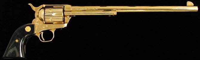 Wyatt Earp .45 LC caliber Colt Buntline Special commemorative revolver. Rare-only 150 made in 1964. Gold plated finish.