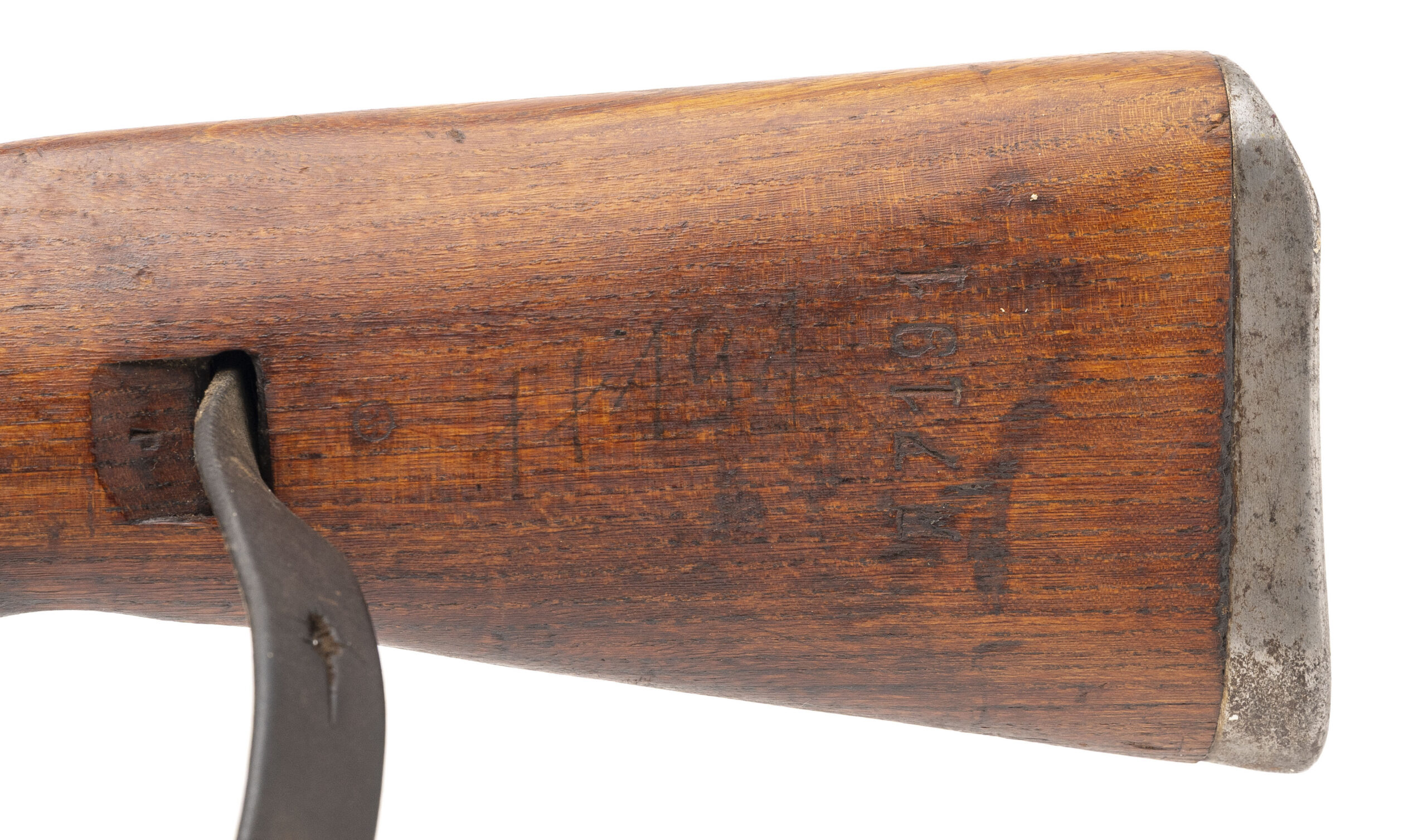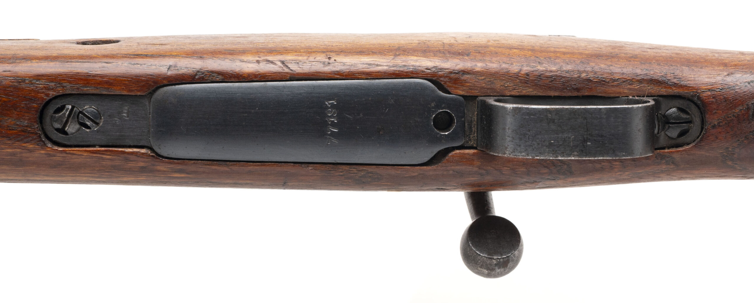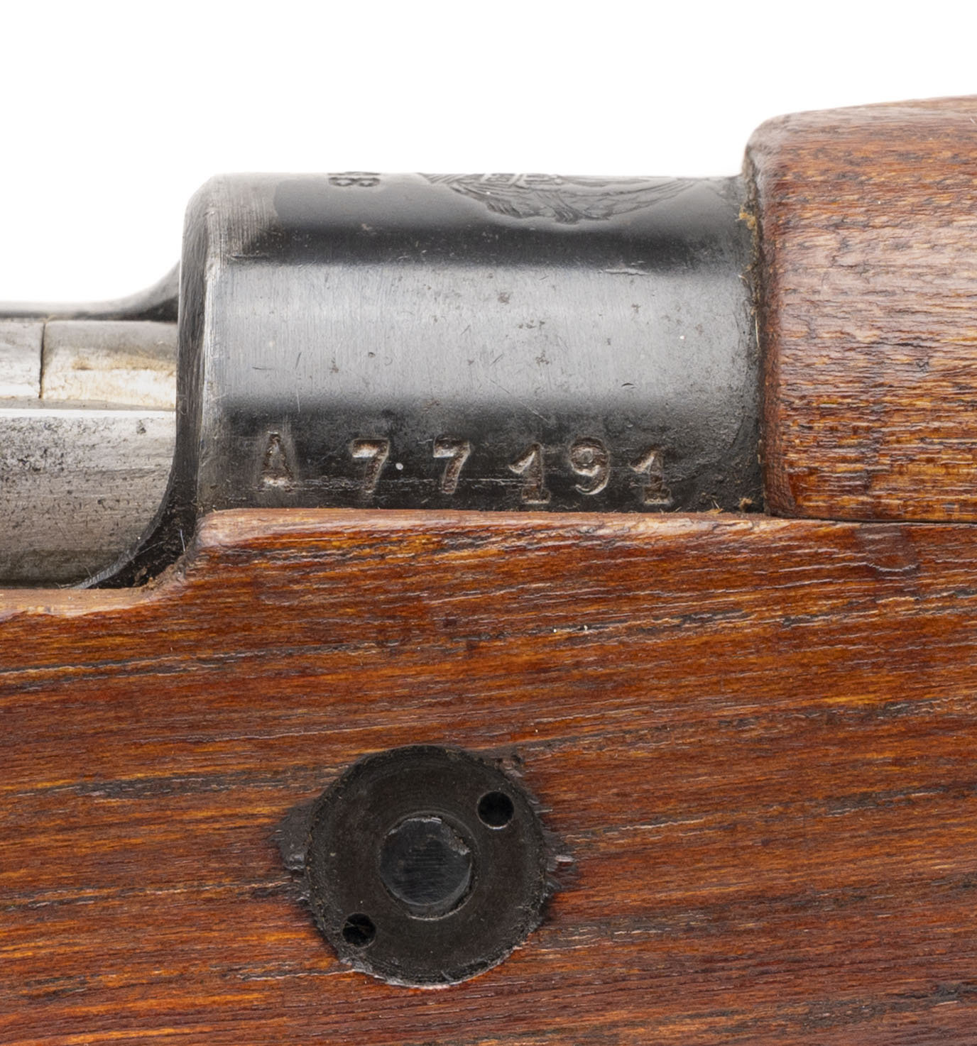 Serial No. A77191, manufactured circa 1950–1952, chambered in 8mm with a 23 ½” round barrel. The bore is good, showing light frosting in the grooves with rifling remaining sharp. The bolt is non-matching, while approximately 92% of the original finish remains on the barrel and receiver. The stock is in very good condition with light handling impressions consistent with service and storage. Action is smooth and functions correctly. Rifle comes complete with bayonet and frog.