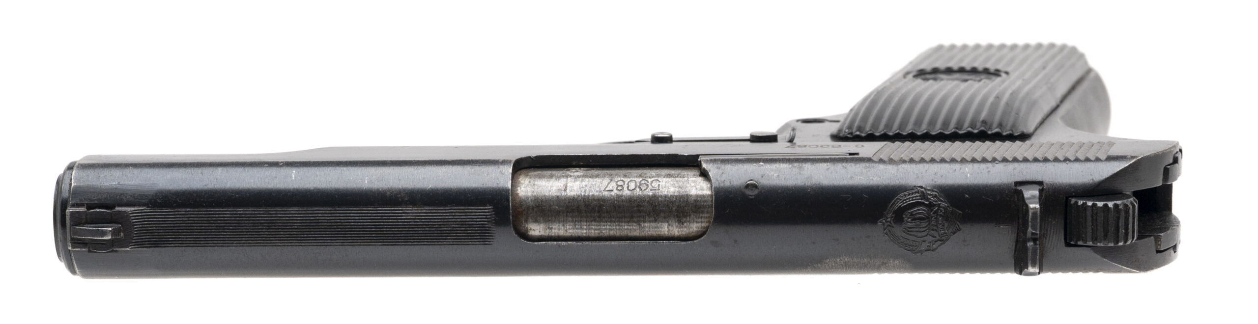 Serial number X59087. Made in 1968 with a 4.6-inch round barrel that has strong visible rifling although there is some frosting noted between the grooves. The M57 is a modified & unlicensed derivative of the Soviet TT-33 Tokarev pistol that has longer grip length & therefore greater magazine capacity. It was the standard service pistol of the Yugoslav People's Army from 1961 until the early 1990s. The top of the slide is marked with the crest of the Socialist Federal Republic of Yugoslavia & the plastic grips are therefore marked "S.F.R.J." as well. Condition overall is very good with visible scratches on the slide but still there is thinning original factory blued finish across the metallic parts that has oxidized in a few places. Oxidation is also present on the outside of the barrel. Century Arms import mark on the bottom of the trigger guard. Comes with an import compliant safety shoe trigger & an aftermarket 9-round magazine.