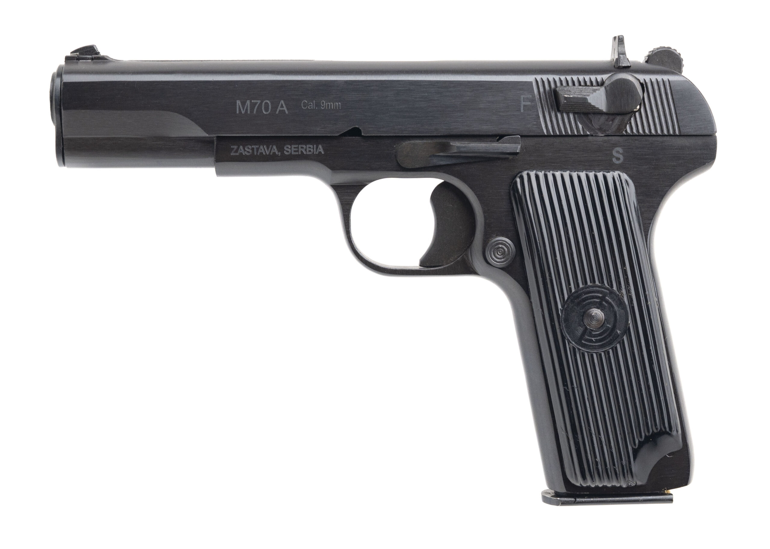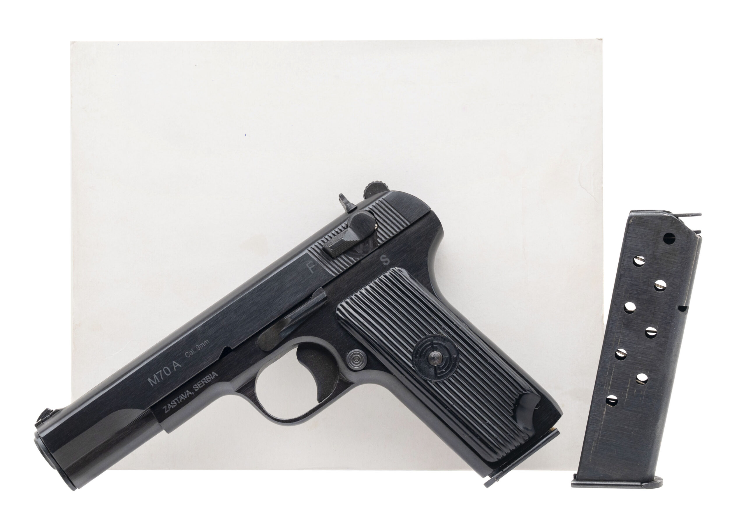 Serial No. Z-M70A-0004336, imported 2013, 9mm, 4½” round barrel. This modern production Zastava M57A is a civilian import version of the Yugoslavian M57 Tokarev, chambered in 9mm Parabellum. Pistol is in excellent overall condition, retaining approximately 98% original finish, with only minimal signs of handling. The right side of the frame bears the import mark, and the action is smooth and functions correctly. Pistol comes complete with its original box, factory paperwork, cleaning brush, and an extra magazine.