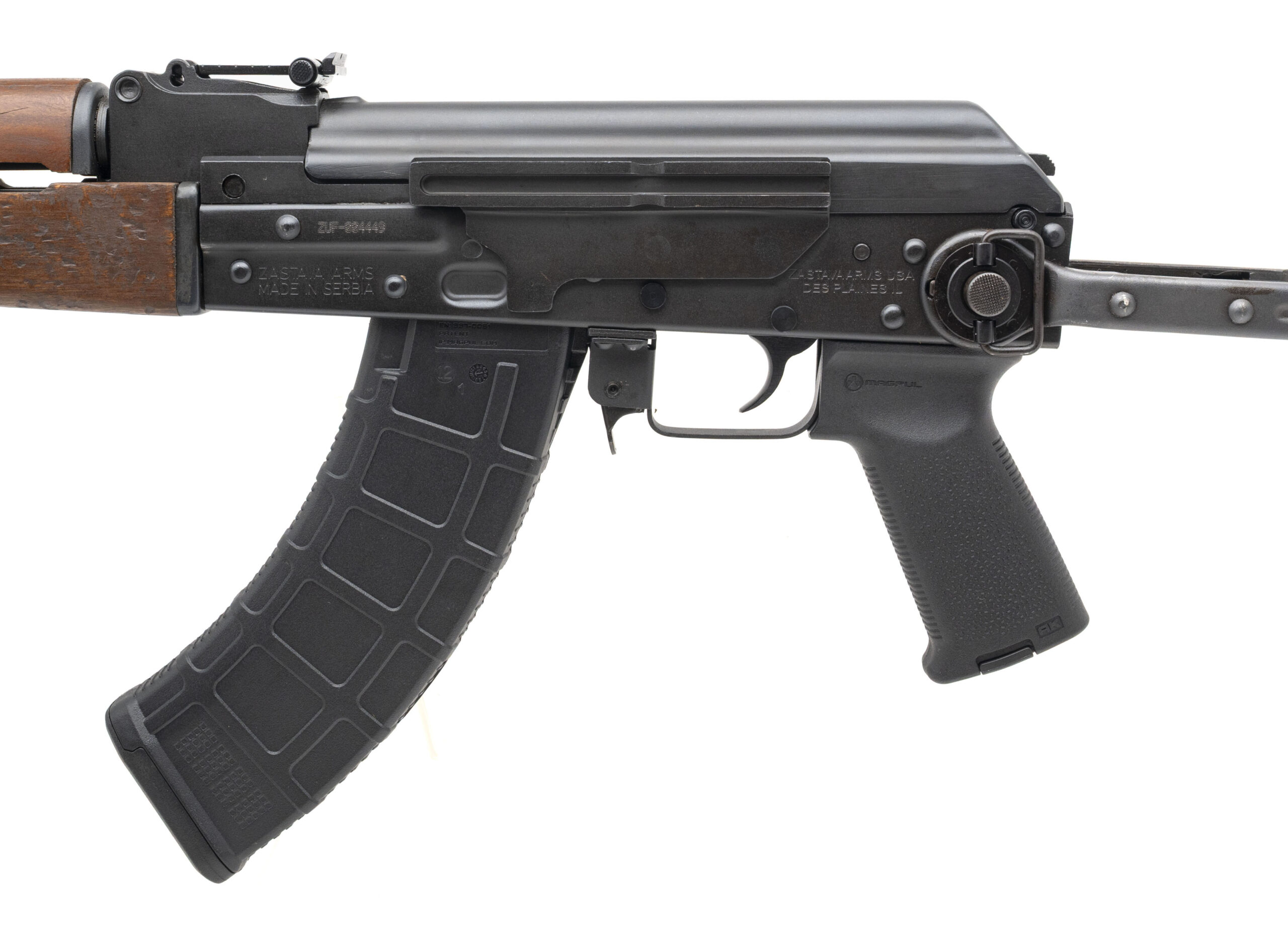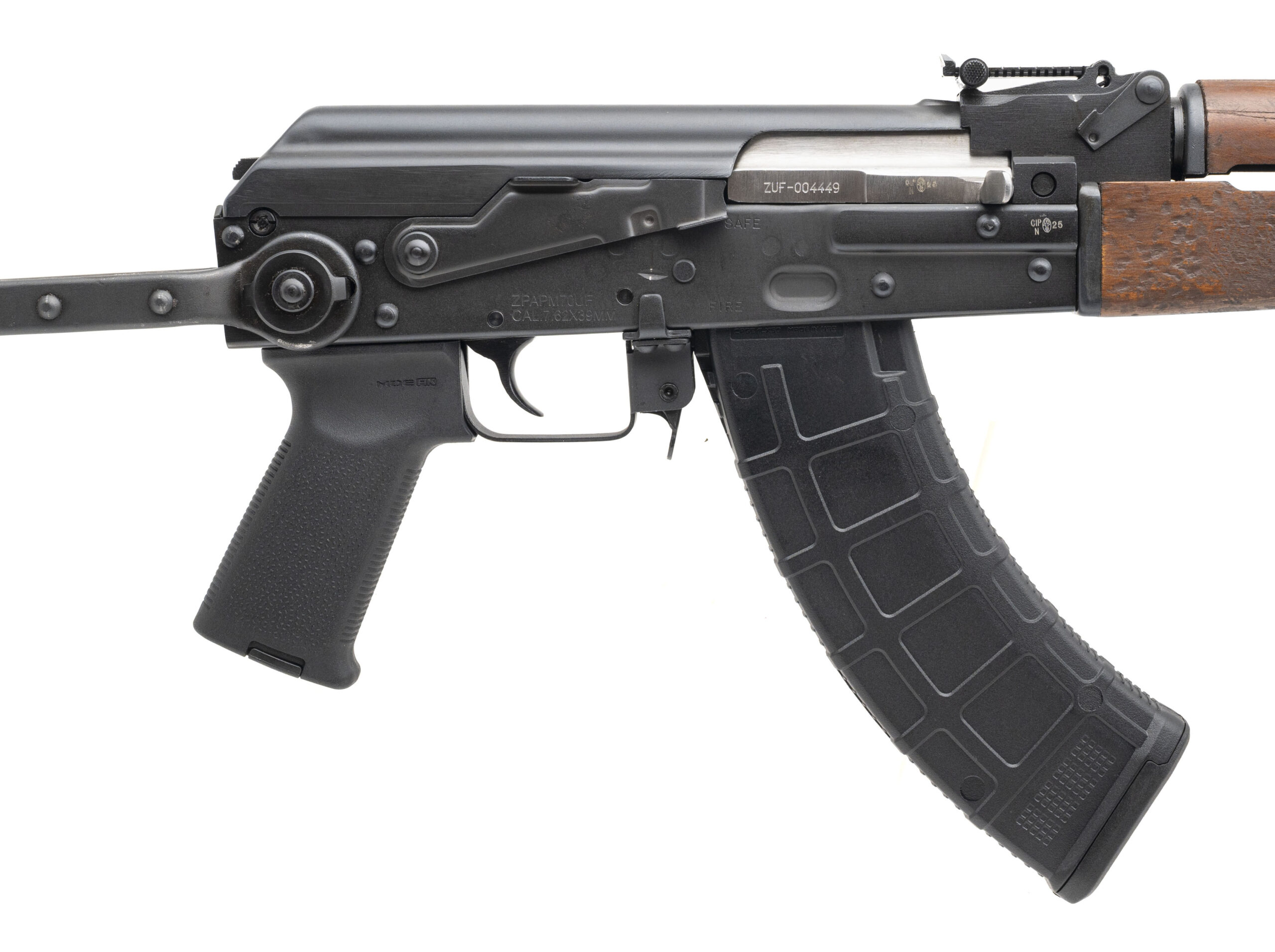 SN: ZUF-004449. Modern production, 7.62x39mm with a 16.5" barrel. Bore is bright with excellent rifling. Serbian made Yugo pattern AK rifle with battle-worn wood handguard and an under-folding stock. Like new condition overall. Comes with box.