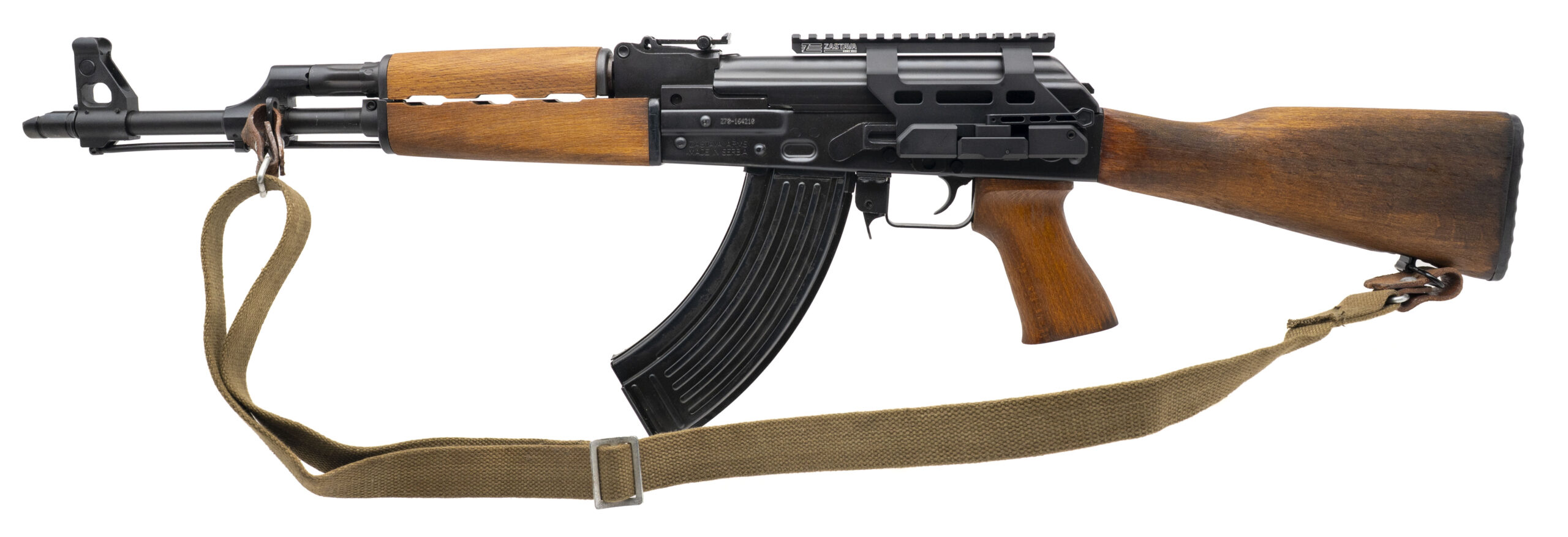 SN: Z70-164210. Modern production, 7.62x39mm with a 16.3" barrel. Bore is excellent. Serbian made AK rifle with Zastava side-mounting picatinny optics rail, blued finish, and wood stock, grip & handguard. Finish shows minor marks throughout. Includes sling. Overall condition is very good.