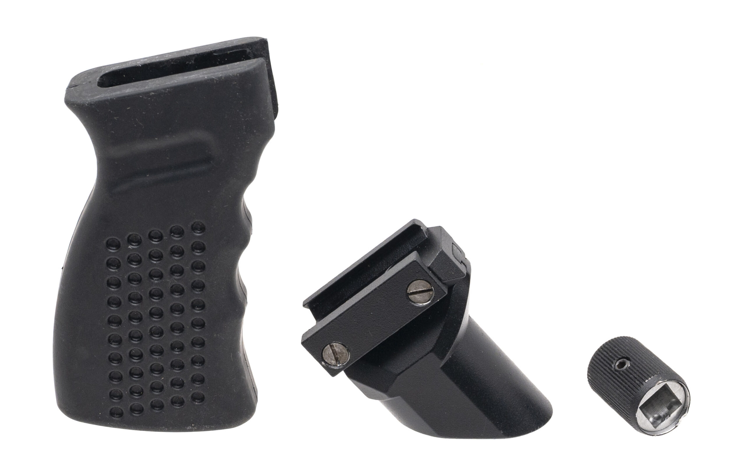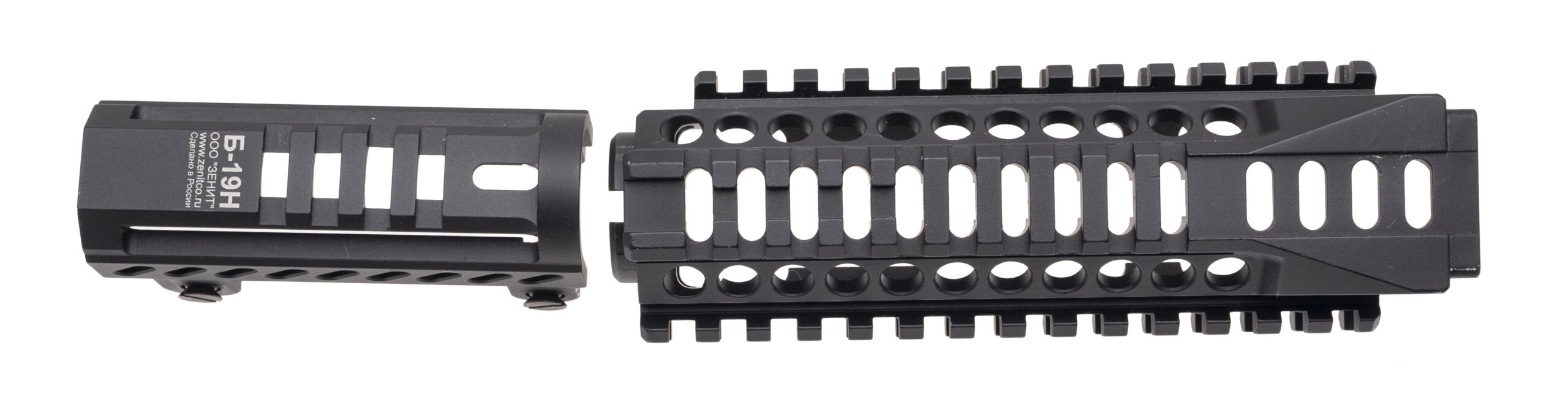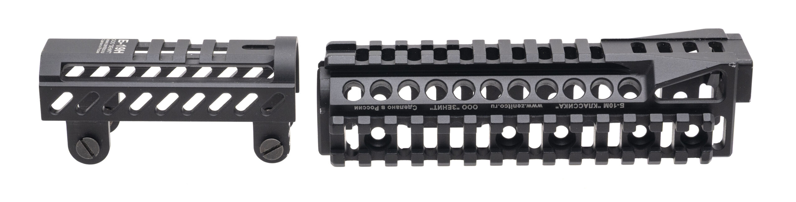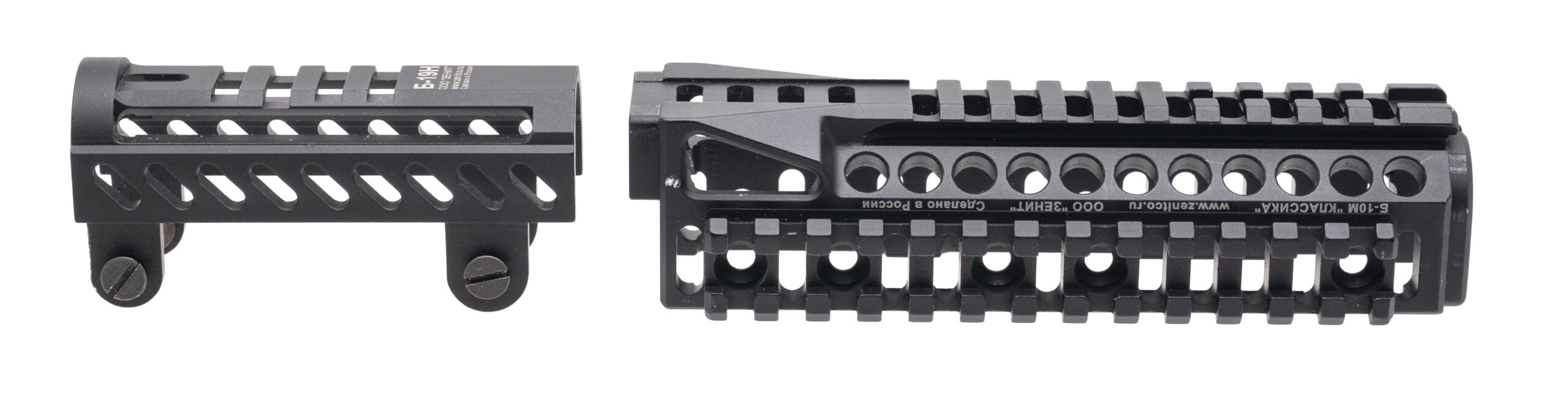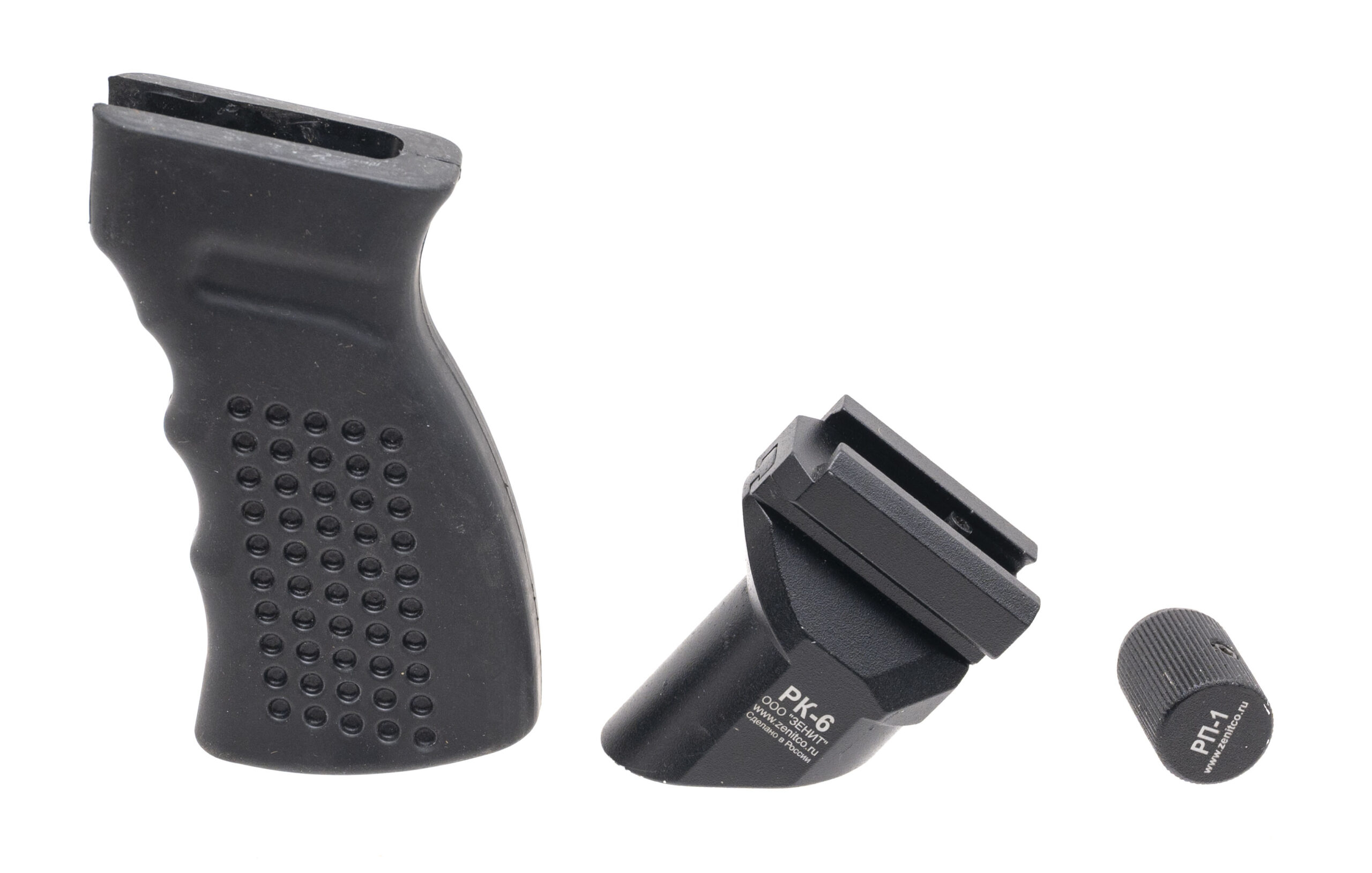 This grouping of modern ZenitCo Kalashnikov furniture accessories consists of five-pieces that were made in Russia & imported into the USA before the war began in 2022. The components can be used on the AK-103, AK-104, AK-105, AK-74S, AK-74M, AKM, AKMS rifles as well as civilian semi-automatic derivatives thereof. Group consists of one RK-6L tactical vertical grip, one RP-1 charging handle cap (with inserts & screws), one B-19N aluminum alloy AK gas tube rail cover, one RK-3 gen.2 AK enhanced pistol grip (with screw), & one B-10M aluminum alloy AK rail handguard. While these parts are used & have a few scratches in the original finish, they are otherwise in excellent condition & ready to be installed on a rifle as a part of a modernized AK build.