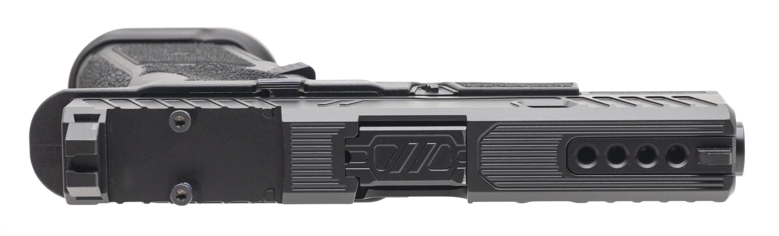 SN: ZD08588. Modern production, 9mm with a 4" ported barrel. Bore is excellent. Compact striker-fired polymer frame pistol with an optics ready slide, accessory rail, flared magwell, flat face trigger, and black DLC finish. Optic plate cover is missing. Overall condition is excellent. Includes an additional magazine, and original case.
