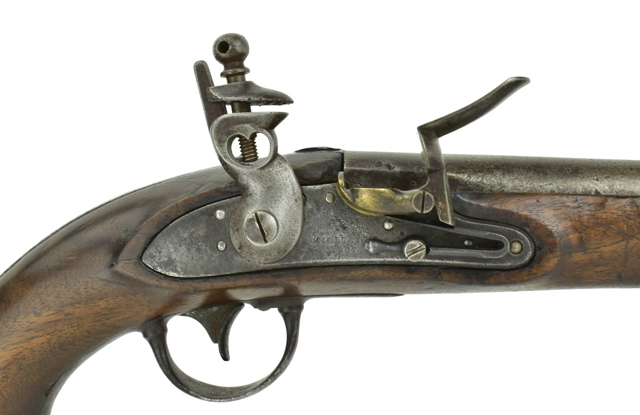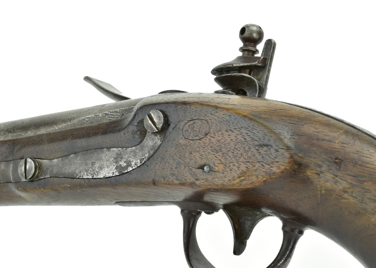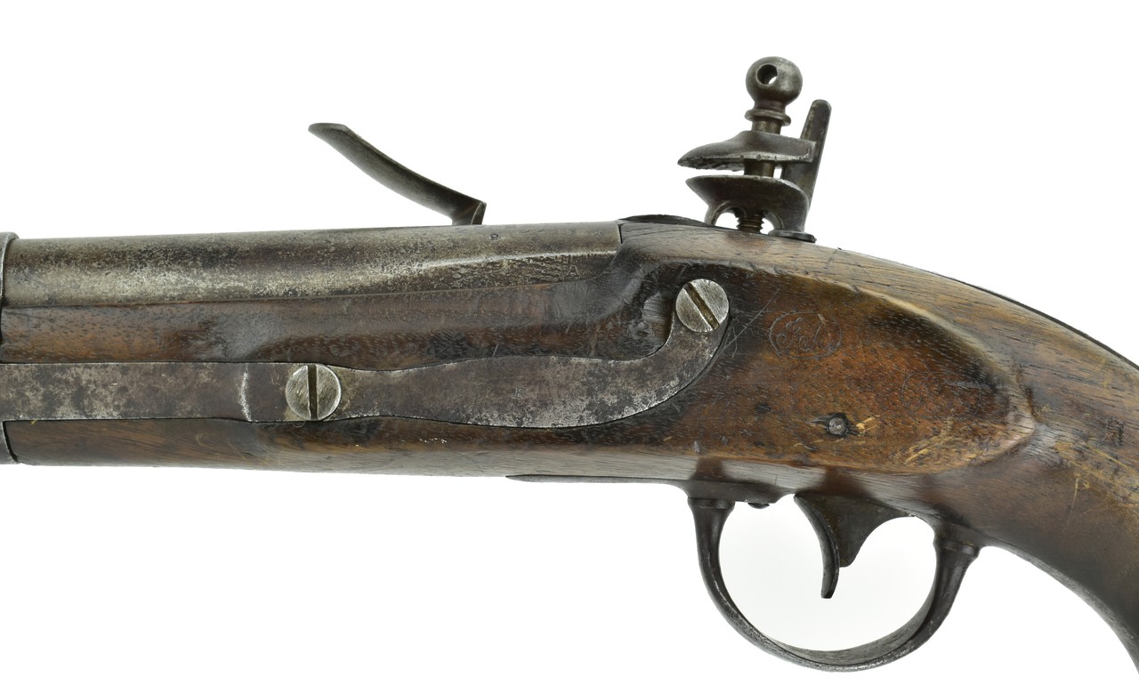 U.S. Model 1836 Flintlock Pistol by Waters. Dated. 1837. The lock has a dark gray patina with pitting. The barrel has a light gray to brown patina. Wood is still reasonably sharp and has a good cartouche on the left hand side. We believe this gun is a reconversion, but expertly done.