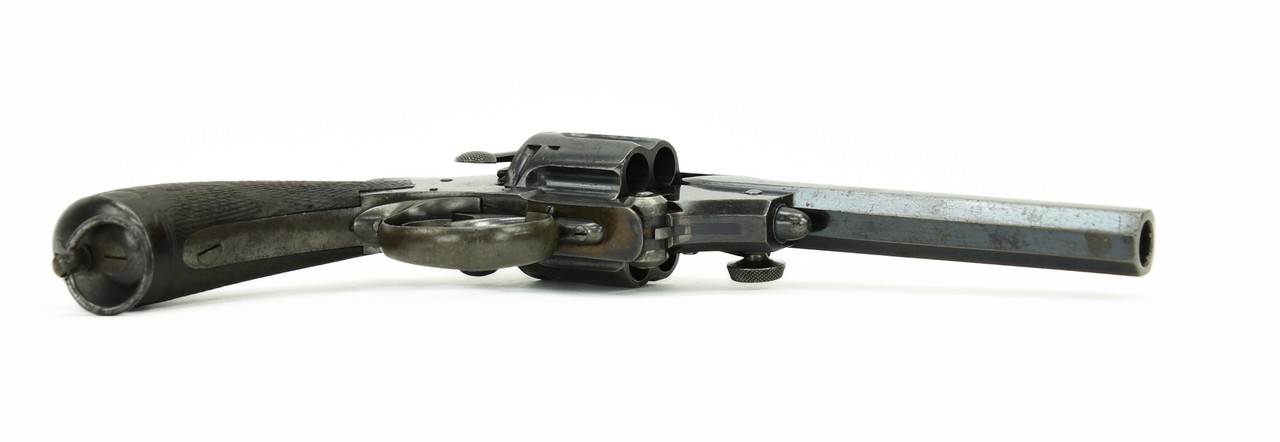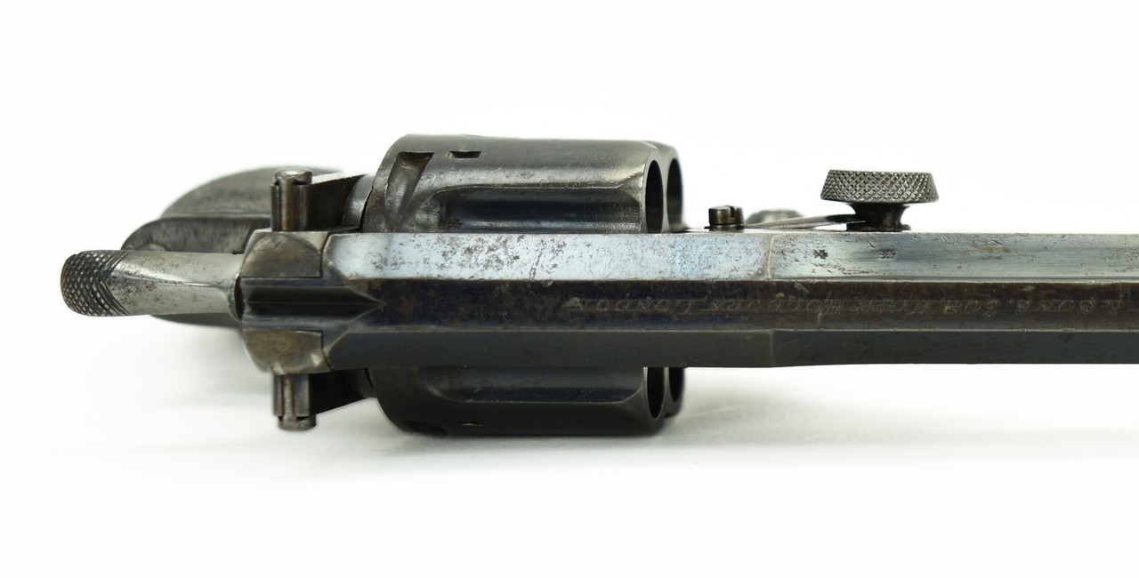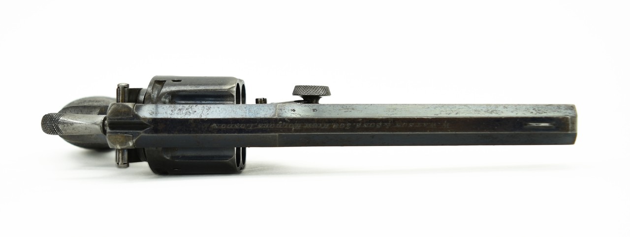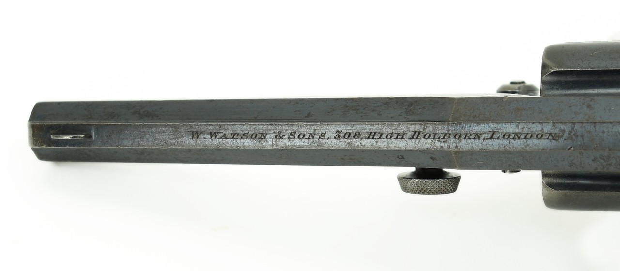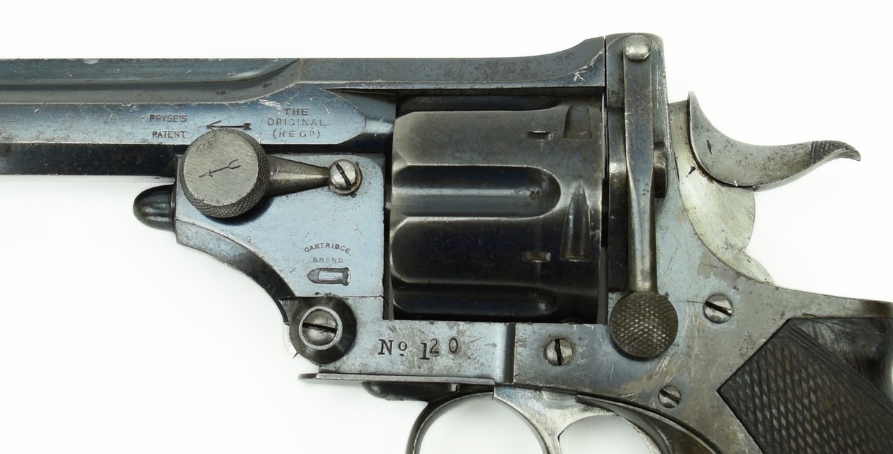British Pryse Revolver. We believe to have been made by Pryse. Left side of frame is marked “Pryse’s Patent”, “The Original (REGD)”, and “Cartridge Brand” with a bullet. Right side of frame is marked B.A.R. and “Patent 6063” in a diamond. Barrel rib is marked “W. Watson & Sons .308, High Holborn, London”. Left side of frame is stamped No. 120 and was obviously stamped later. No other numbers on frame or cylinder. Bore is excellent as is the action. Grips show wear but no cracks or chips. Gun has approximately 80-85% factory blue. Very interesting Pryse revolver!