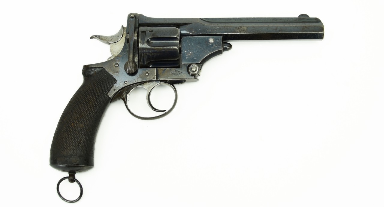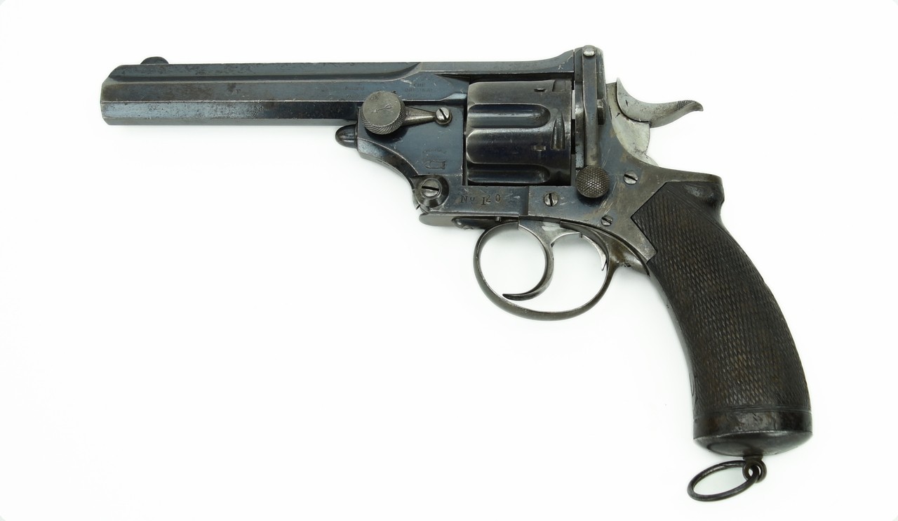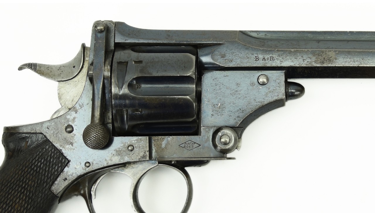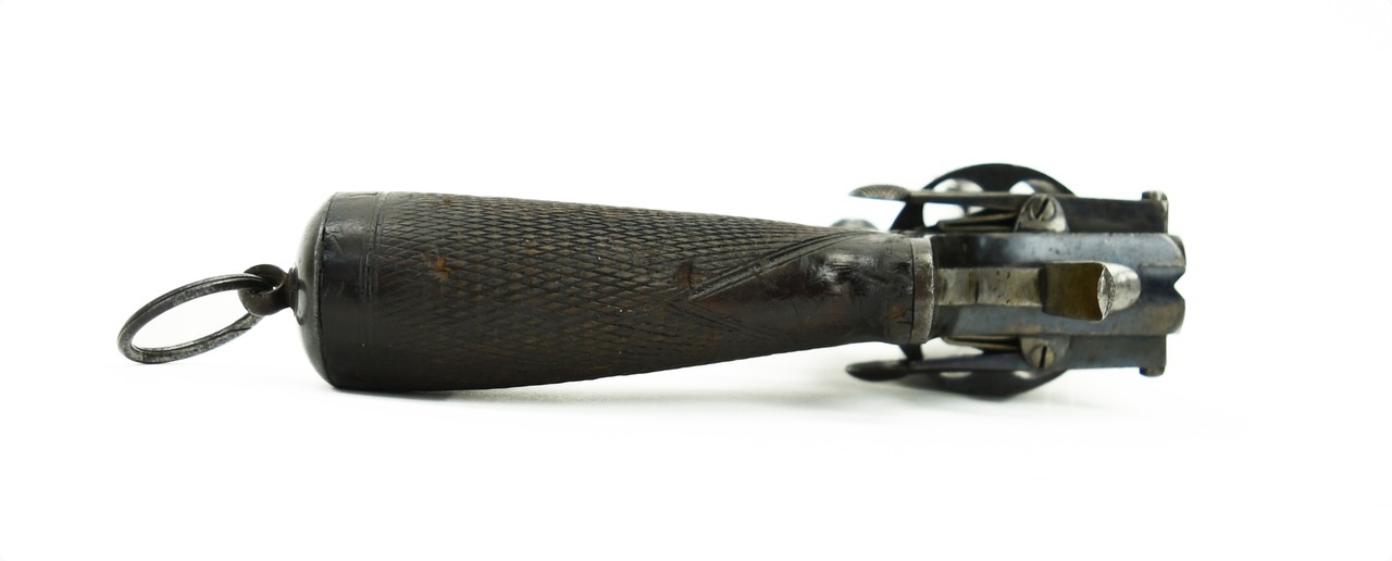 British Pryse Revolver. We believe to have been made by Pryse. Left side of frame is marked “Pryse’s Patent”, “The Original (REGD)”, and “Cartridge Brand” with a bullet. Right side of frame is marked B.A.R. and “Patent 6063” in a diamond. Barrel rib is marked “W. Watson & Sons .308, High Holborn, London”. Left side of frame is stamped No. 120 and was obviously stamped later. No other numbers on frame or cylinder. Bore is excellent as is the action. Grips show wear but no cracks or chips. Gun has approximately 80-85% factory blue. Very interesting Pryse revolver!