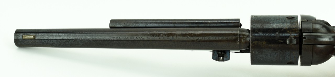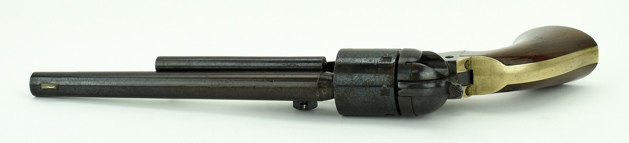 Colt 1861 Navy Conversion .38 caliber revolver. Has matching serial numbers. Frame has 90% case colors. Grips are excellent with 99% varnish. Cylinder scene is excellent and has some nicks and dings. Cylinder has 90-93% blue. Barrel has approximately 35-40% blue the rest being an even smooth patina. This is a very fine 1861 Navy Conversion. Hard to find a good blue and case color 1861 as most were nickel plated.