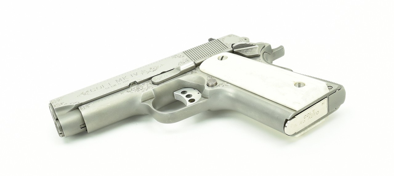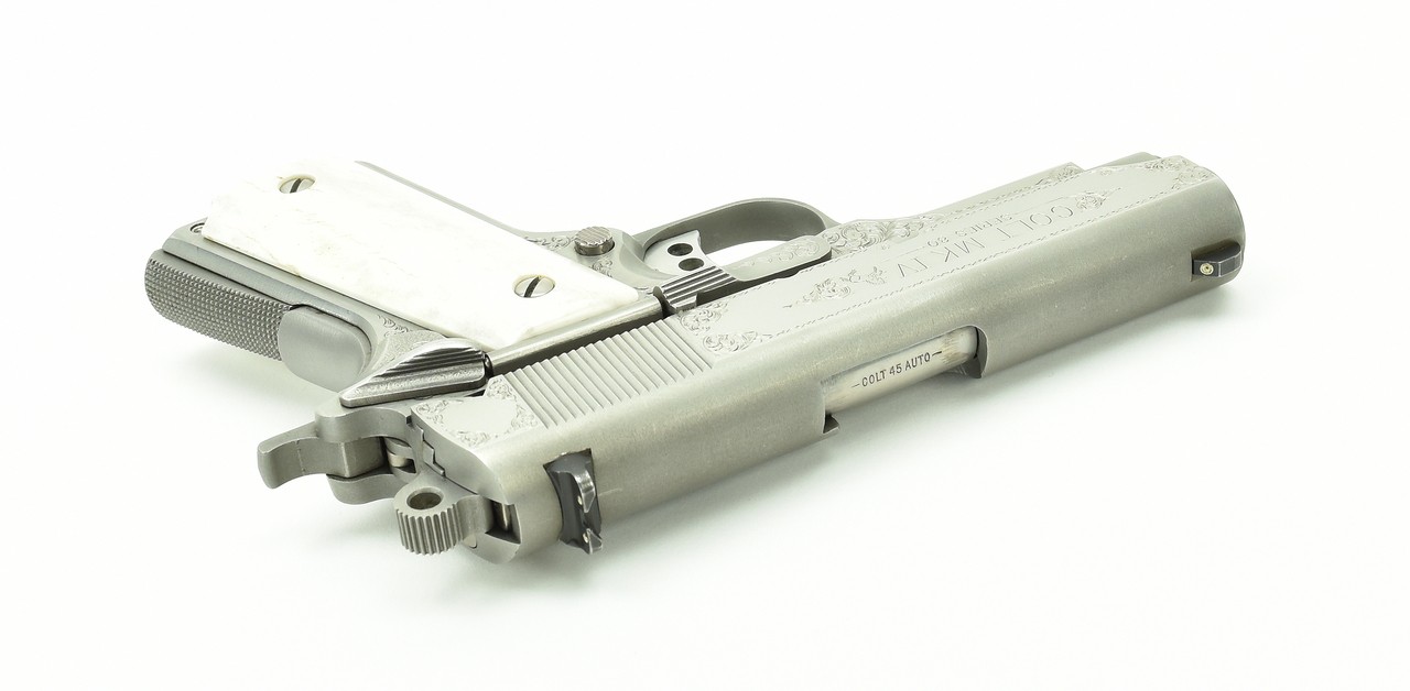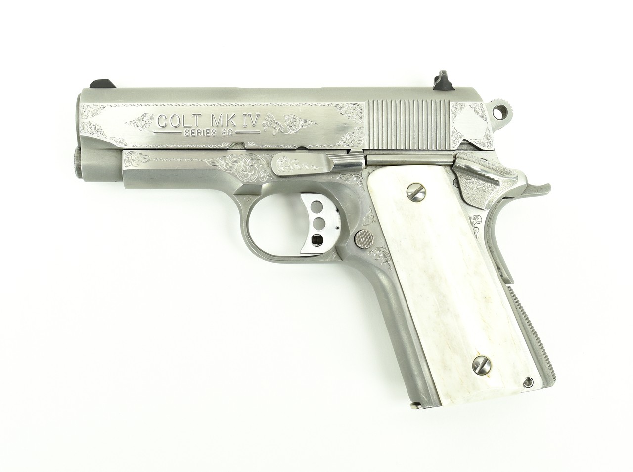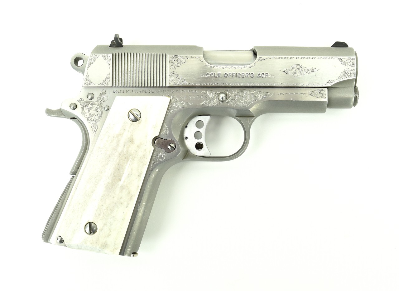 Colt Officers Model .45 ACP Caliber Pistol. Custom engraved stainless steel model. Has fine scroll engraving and custom bone grips. A great looking carry gun.