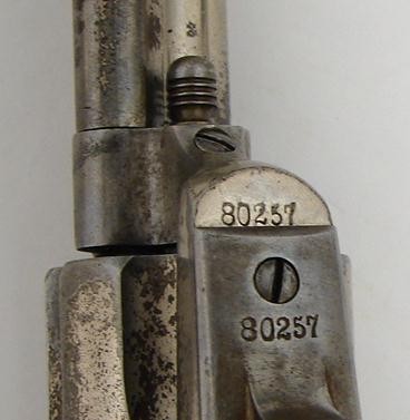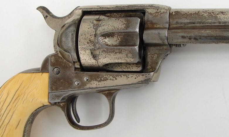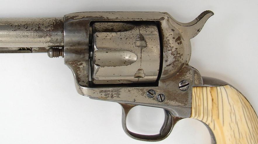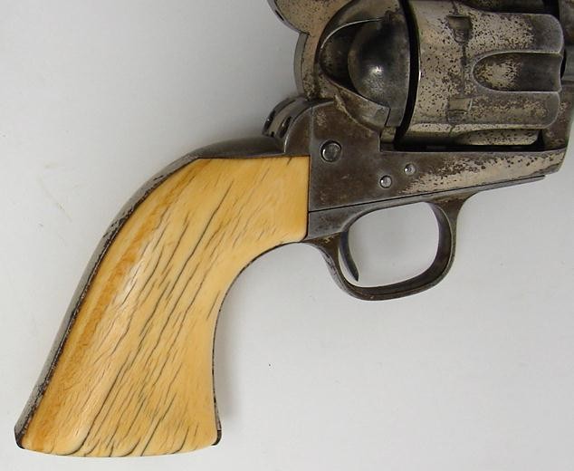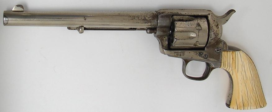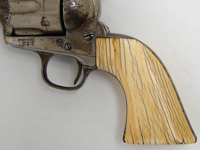 Colt Single Action black powder revolver with etched barrel, 7 1/2 barrel and ivory grips. Serial number range 80xxx. Shipped in 1882. Factory letter. Beautiful ivories. Very fine etch panel.
