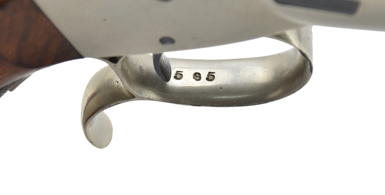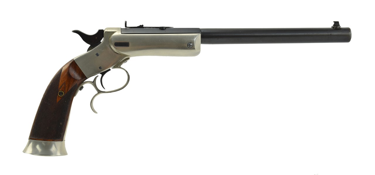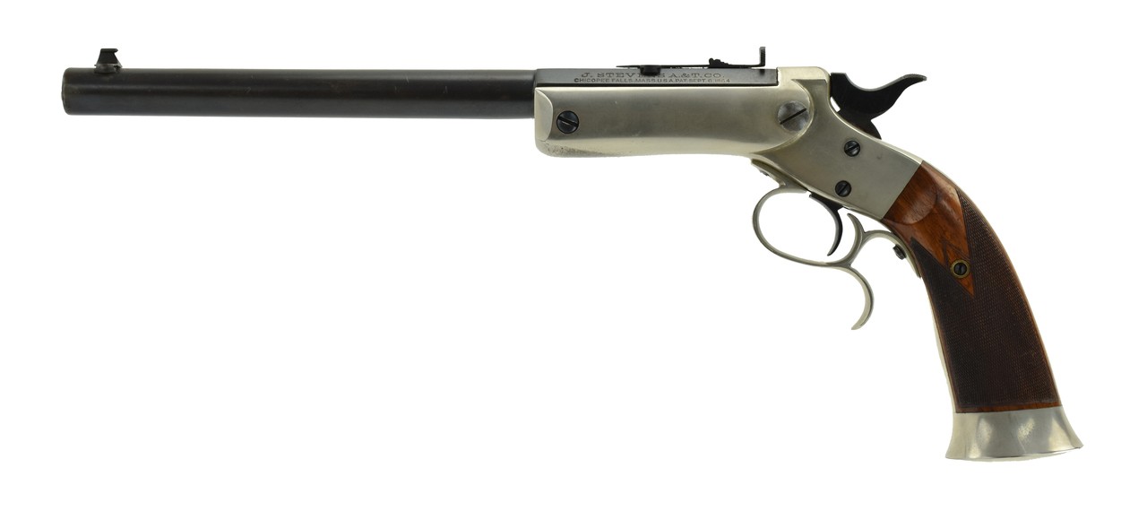 Stevens No. 36 “Lord Model” .22 caliber pistol. Bore has strong rifling with frosting. This is an outstanding Lord model. This was Stevens largest frame pistol with target sights, deluxe fine checkered grips. Barrel length 10”. Action works perfectly. Gun has 97-98% blue. Frame has 99% original nickel. Grips are excellent. No damage to the very fine checkering. Hammer has all of its fire blue. Best Stevens Lord we have owned in the last 25 years!