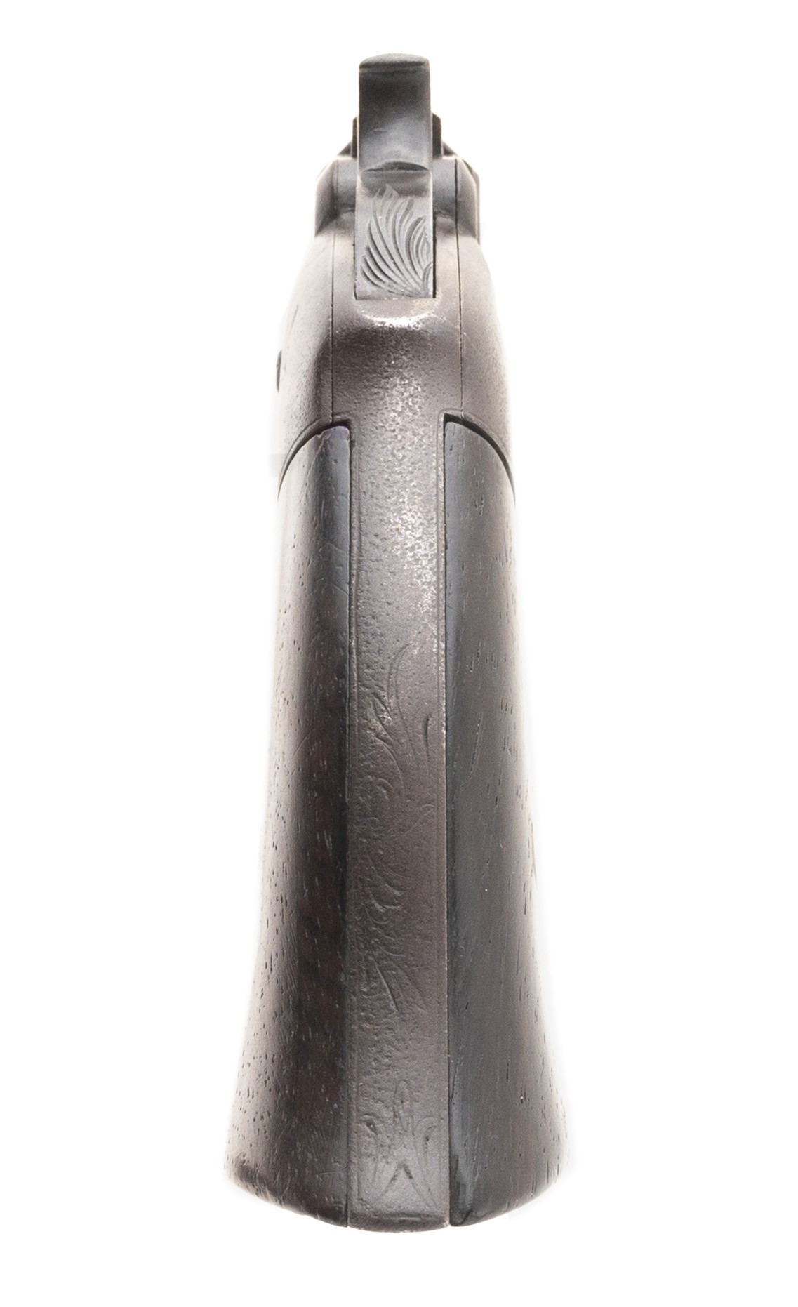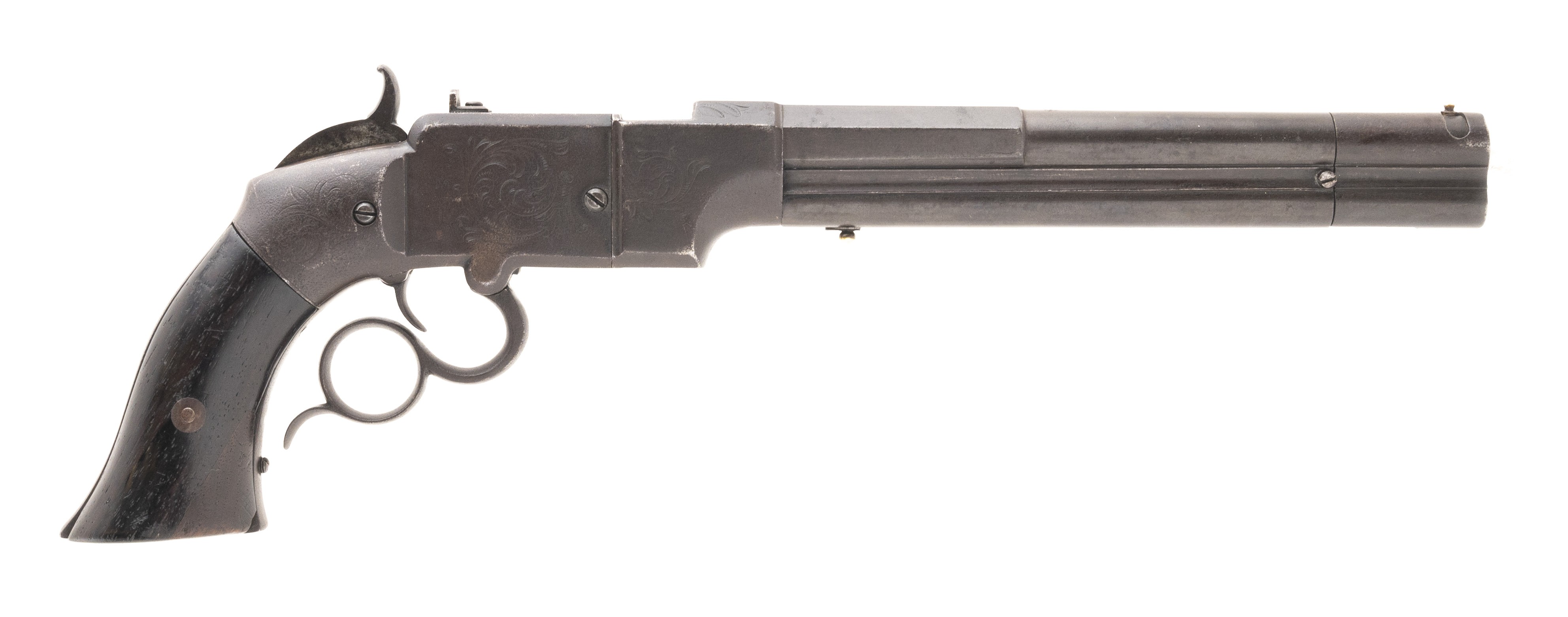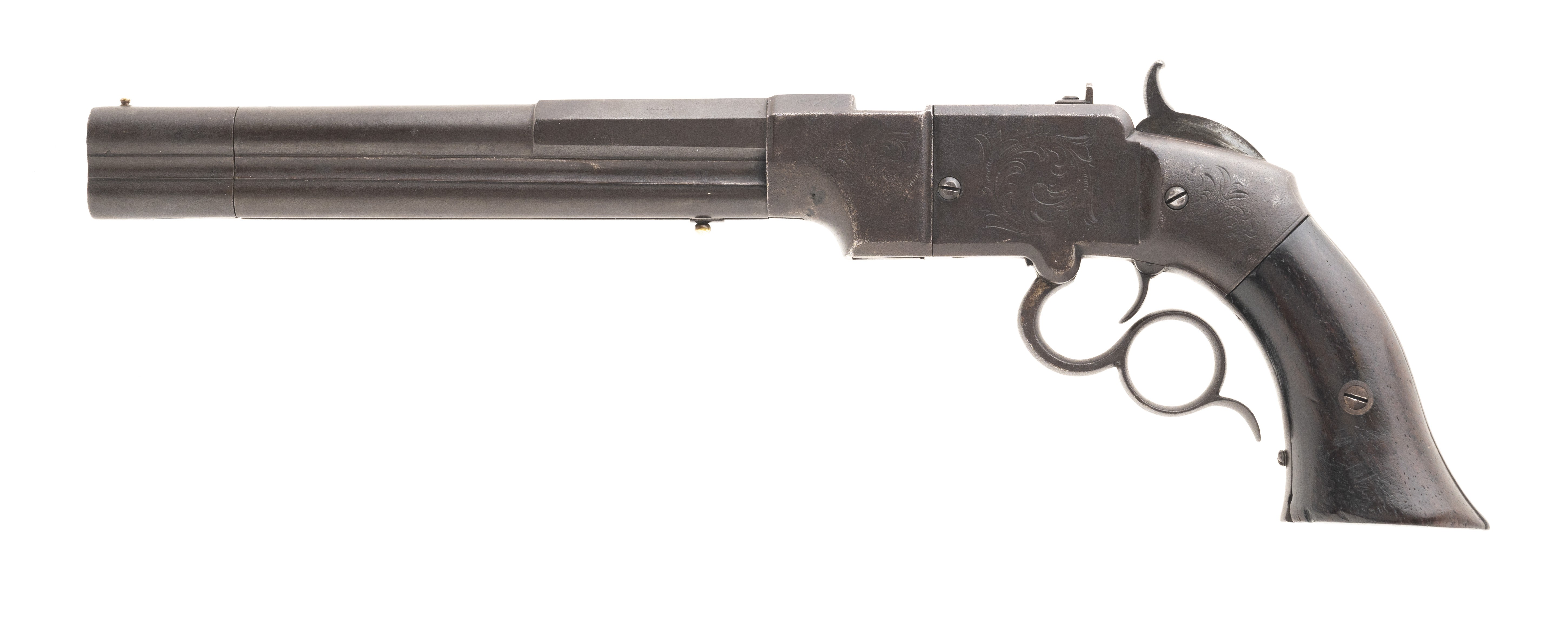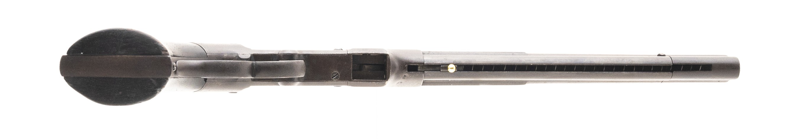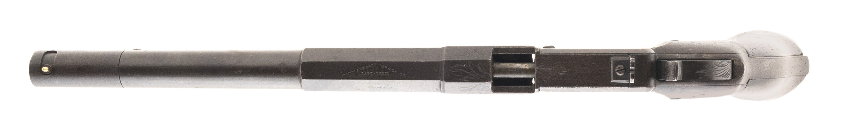 Serial Number 7. 41 caliber with an 8” barrel. This gun has a dark chocolate colored patina throughout. All markings and engraving are visible. Grips are original, and in good overall condition. Action works well. Follower is a replacement. Bore is very good with strong rifling and some spots of pitting. These guns were the precursor to the Winchester and was also Smith & Wesson’s first foray into the firearms industry.