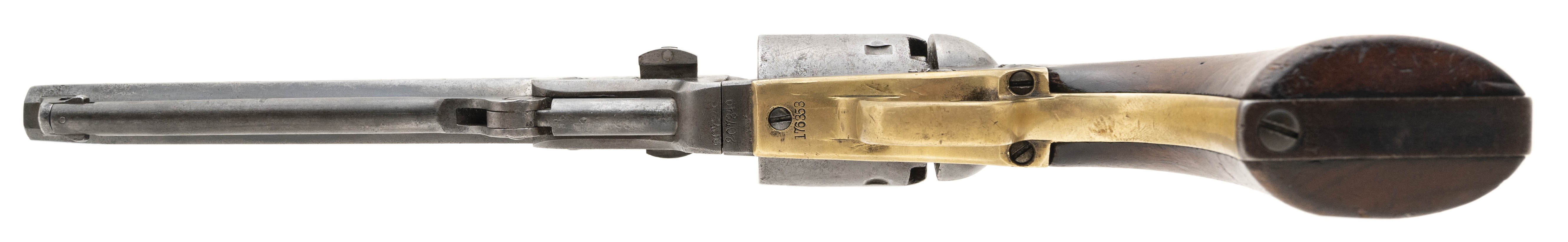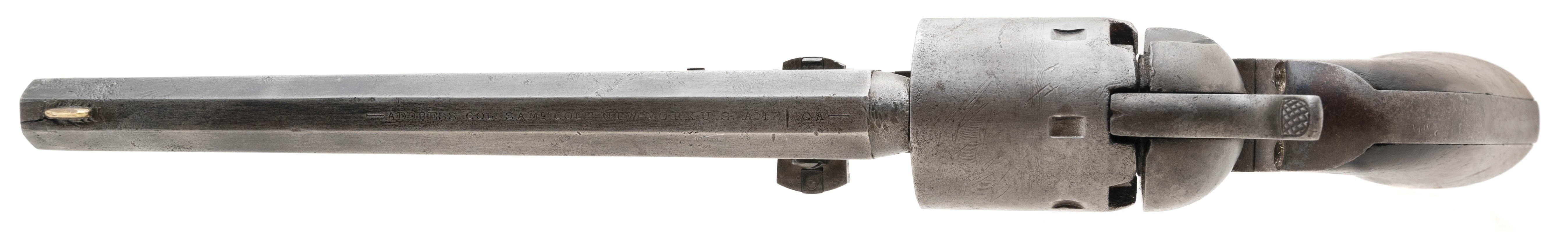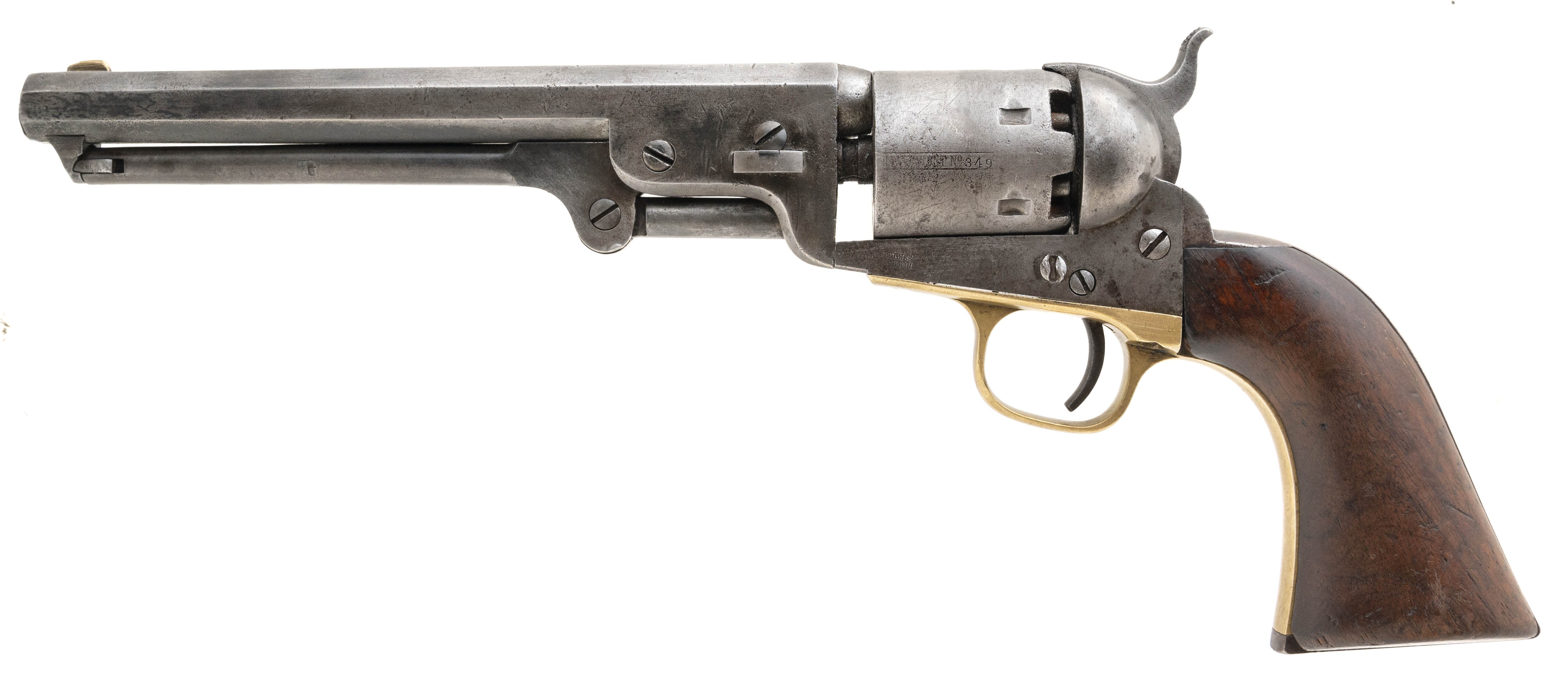Single action percussion Colt 1851. The serials for the barrel and frame match and are 207349, and dated 1869. The trigger guard has the serial 176353 and is dated 1864. The metal has turned a gray patina. The serial number is clear and legible. The barrel has a crack near the muzzle.