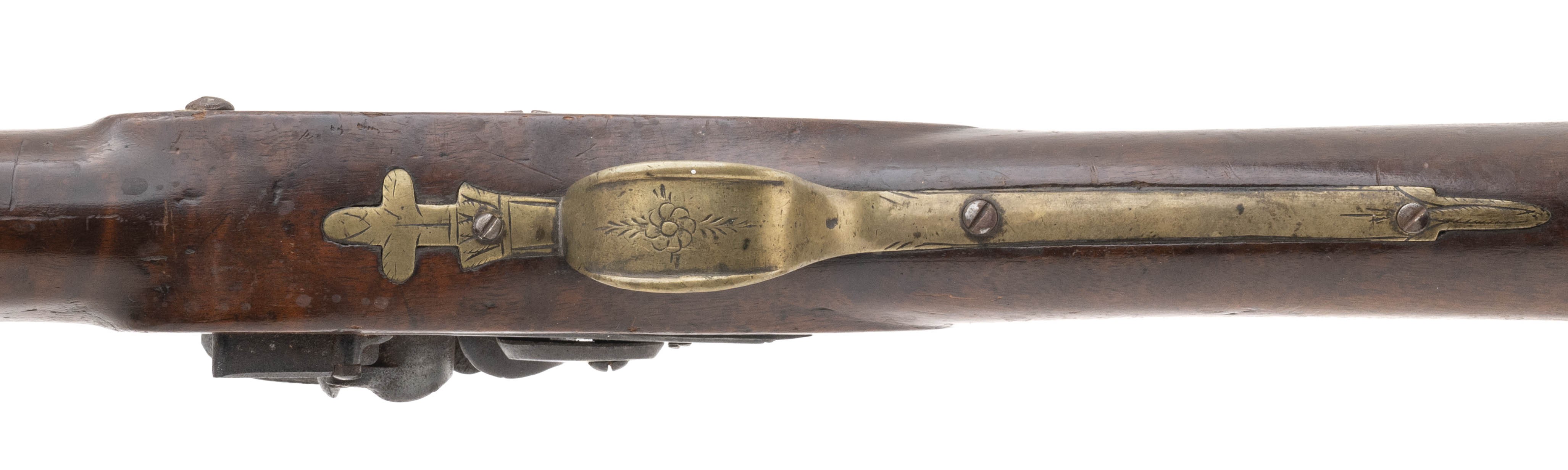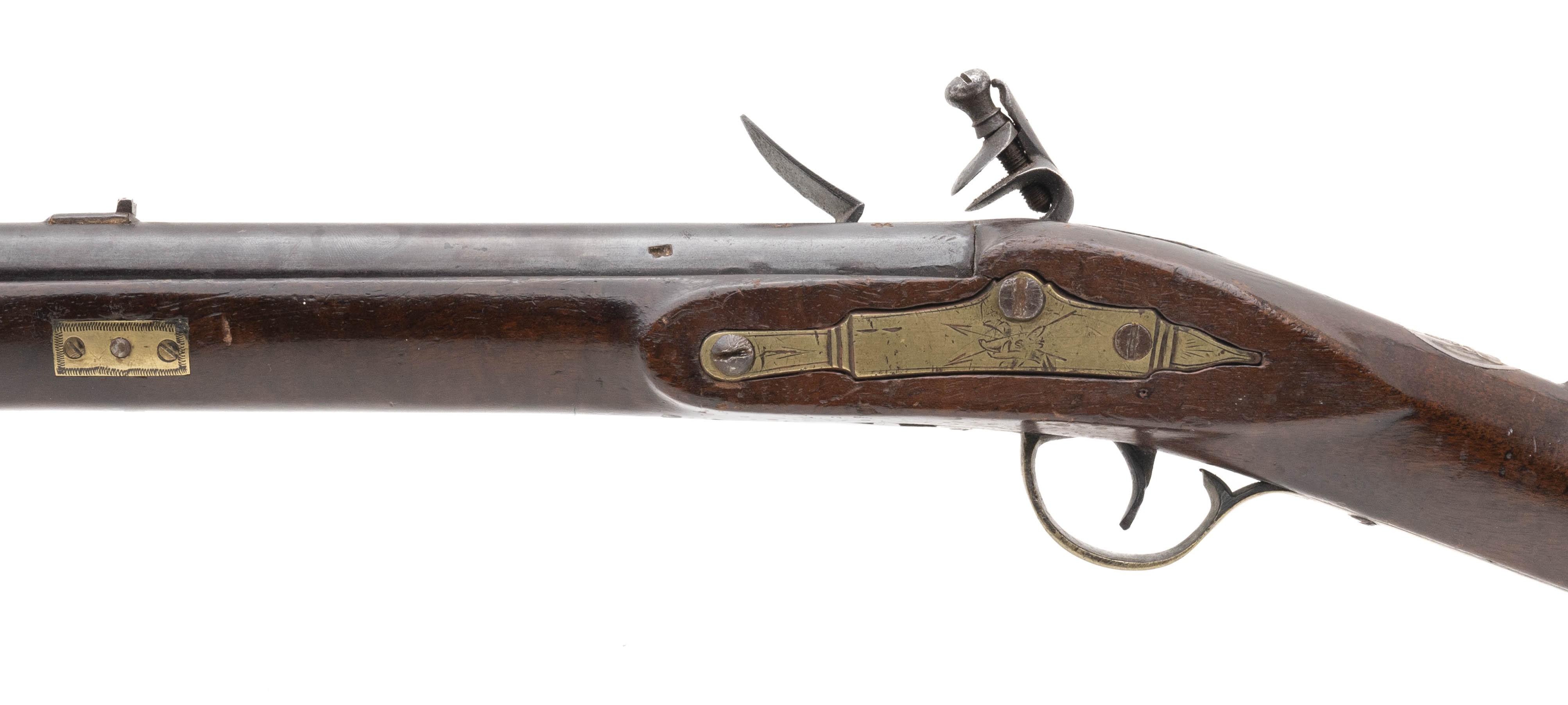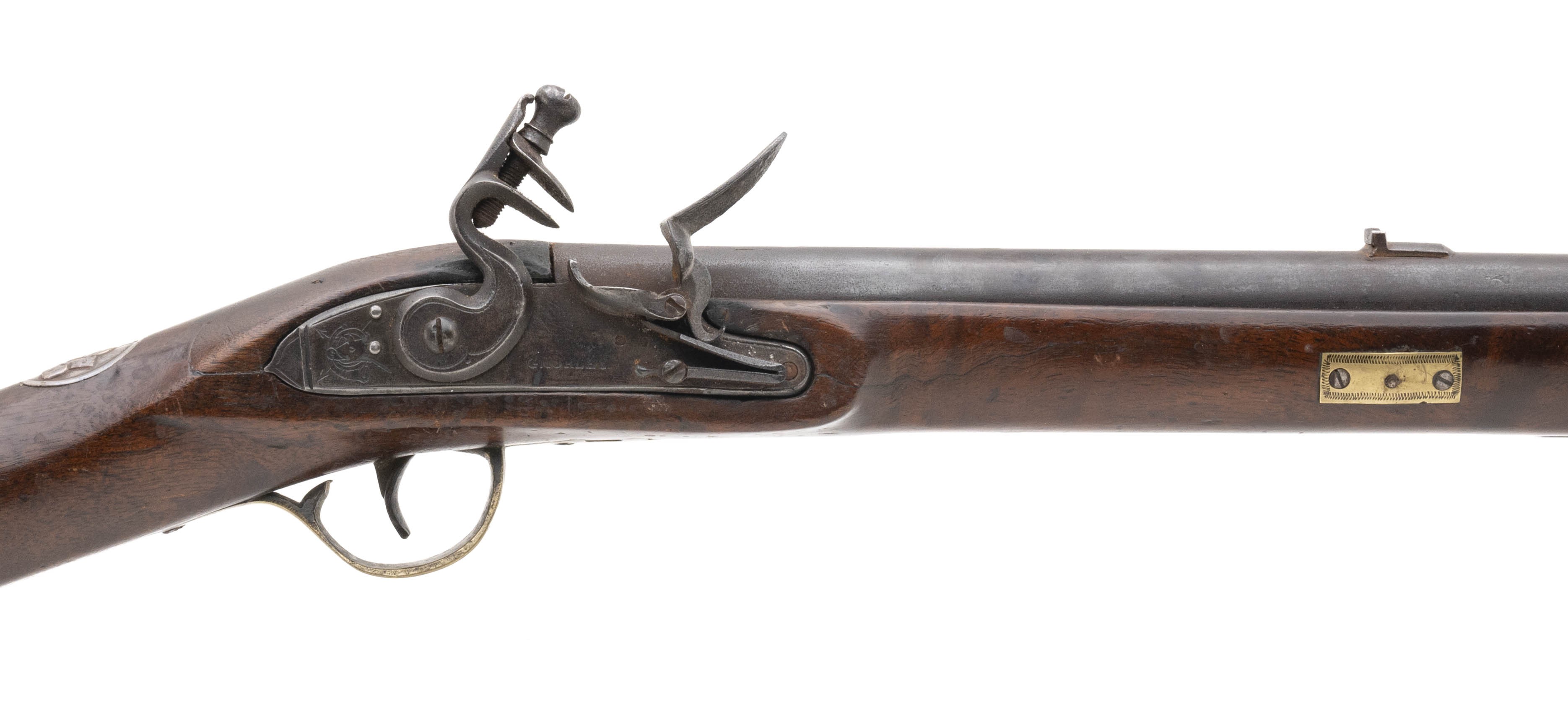 .66 caliber 37" round barrel flintlock Chief's Grade Trade Gun by Morley circa early 1800's in overall good condition. Metal is a dull grey patina with pin-prick oxidation present. German silver Indian Chiefs head is visible at the wrist. Wood is good with an old repaired crack right side above the lock plate. Lock plate is marked "G Morley" and barrel is marked "London with Birmingham proof marks noted. Action mechanically functions correctly, These guns were highly thought of by the Native Americans!
